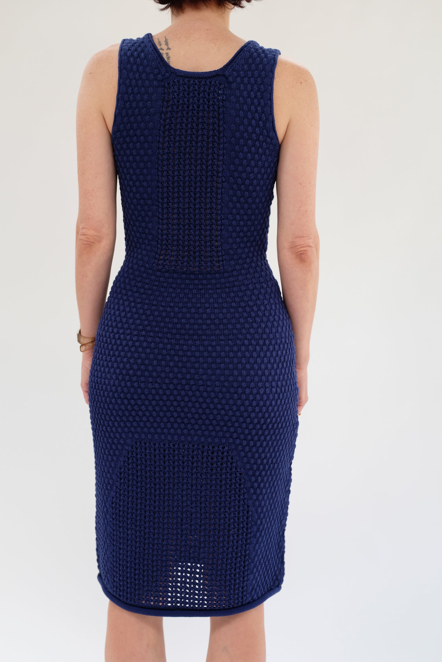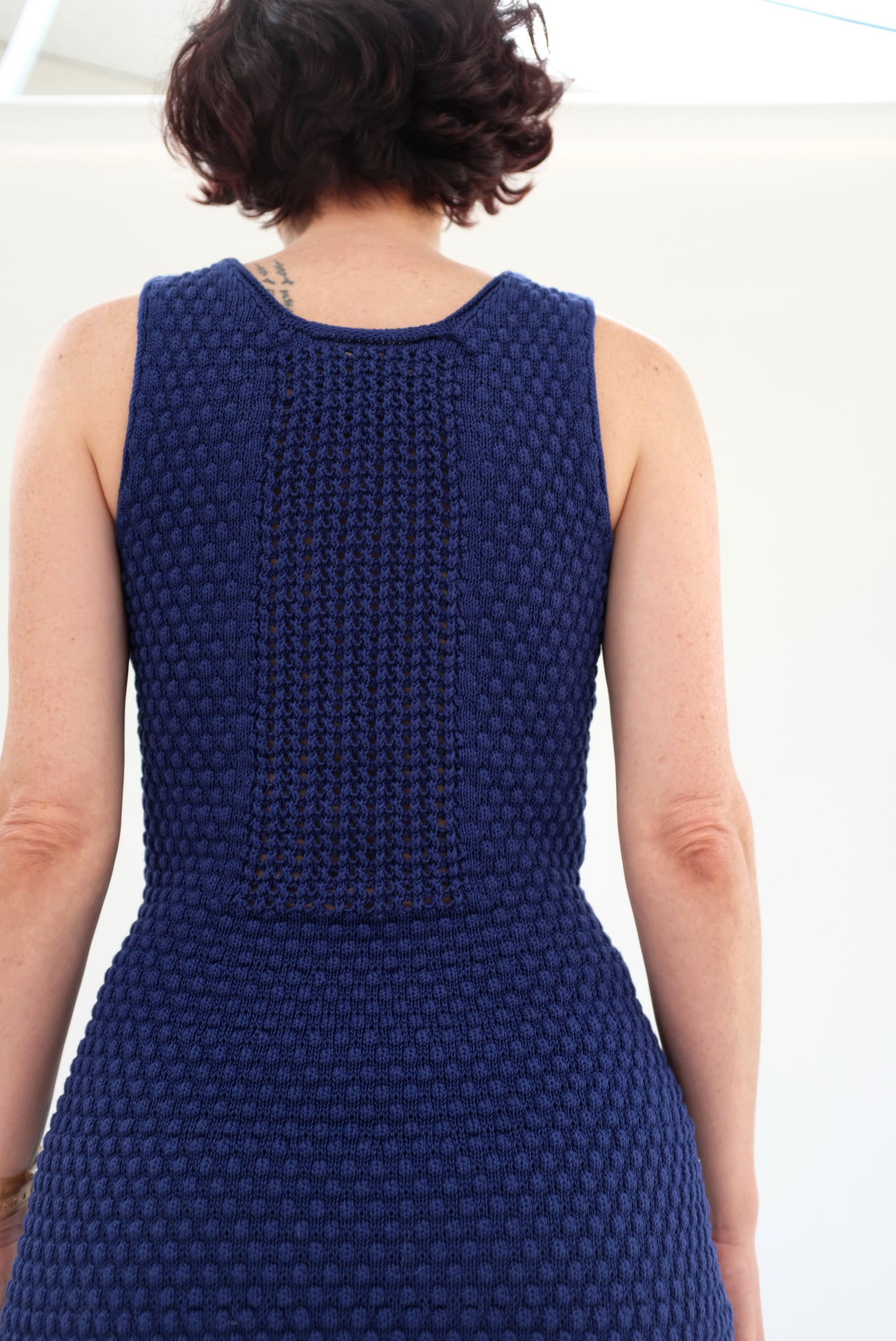 Gorgeous hand knit tank dress, with a unique mesh design details and texture, medium weight. Washable, 100% luxurious Pima cotton. Natural stretch and give from the knit, making it an easy fitting style that adjusts to your natural shape.
