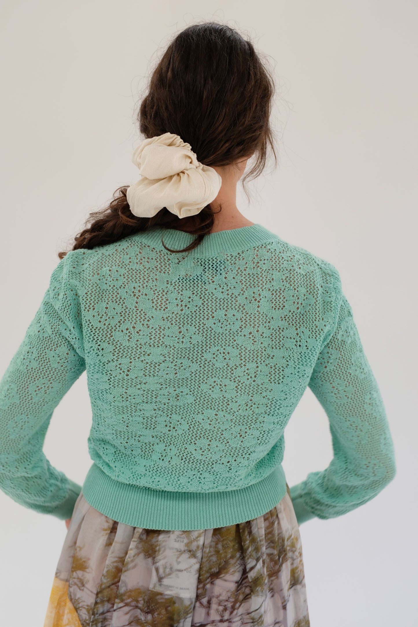 Hand knit 100% cotton floral lace top. Ultra luxe soft washable lightweight knit that you won't want to take off. Classic long sleeve crew, meant to hit at the waist with a gentle cinching and drape, ribbing at hem, neckline, and cuffs. Natural built in stretch, not overly delicate. Dress up or wear with your favorite jeans. Staff favorite.