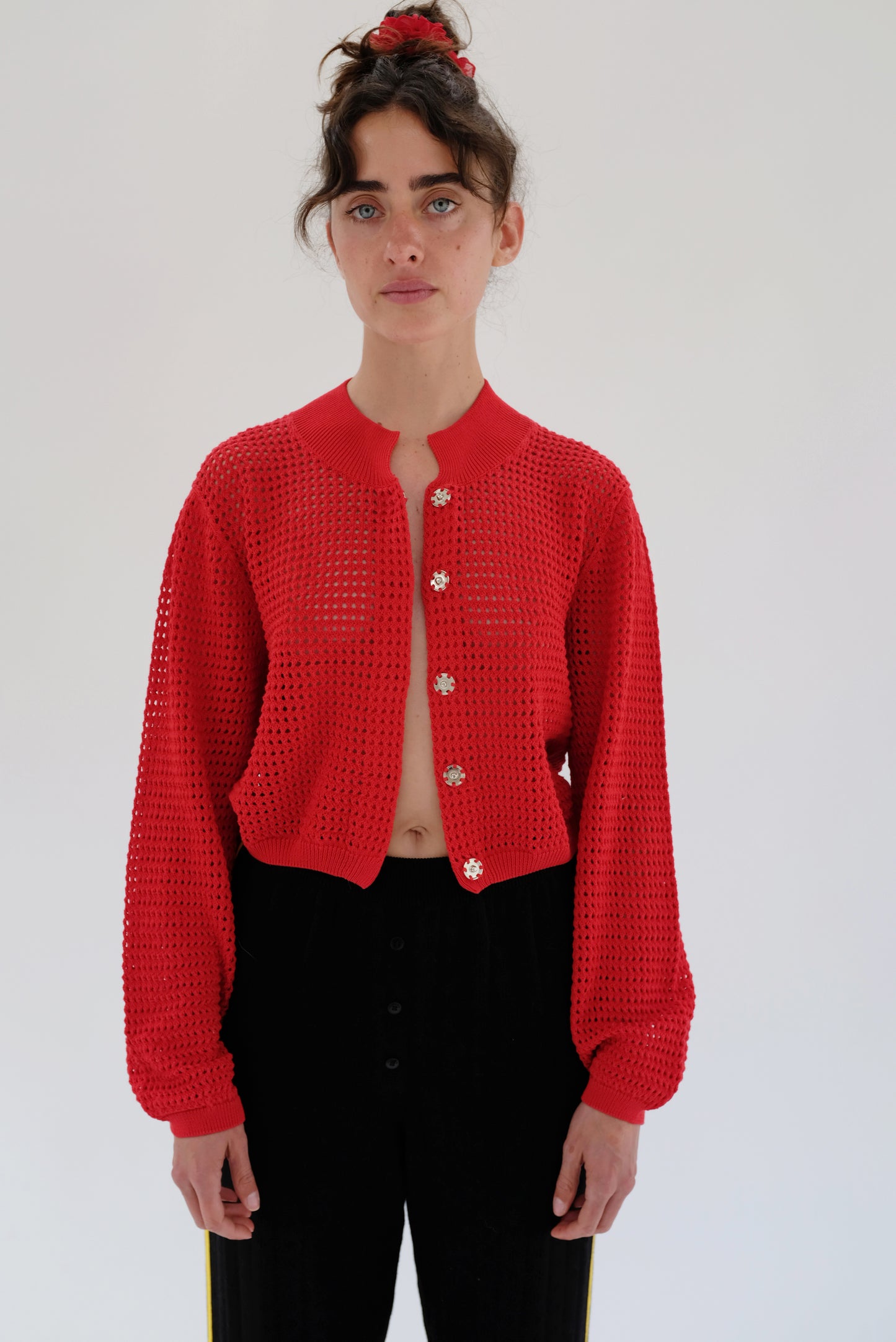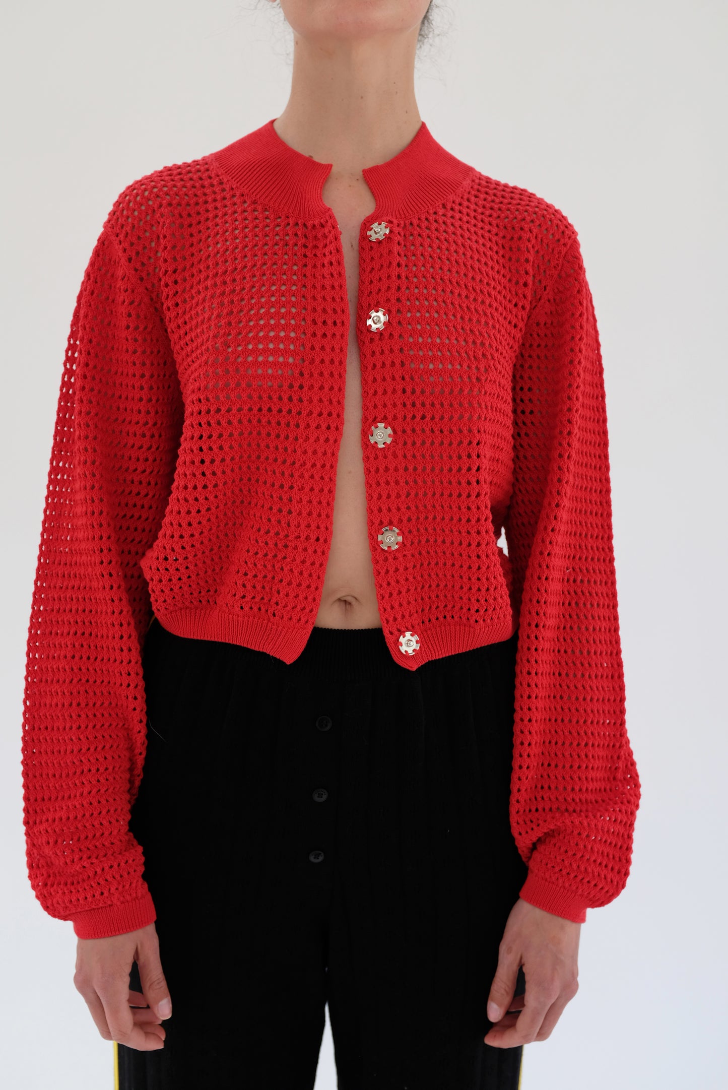 100% Peruvian cotton medium weight, open waffle stitch cardigan. Washable, not overly delicate, great cardigan for travel and everyday wear. Cropped length, long sleeves, short collar, snaps down the front. Dress up with slacks or a skirt, or wear with your favorite jeans, or tube top. Staff favorite.