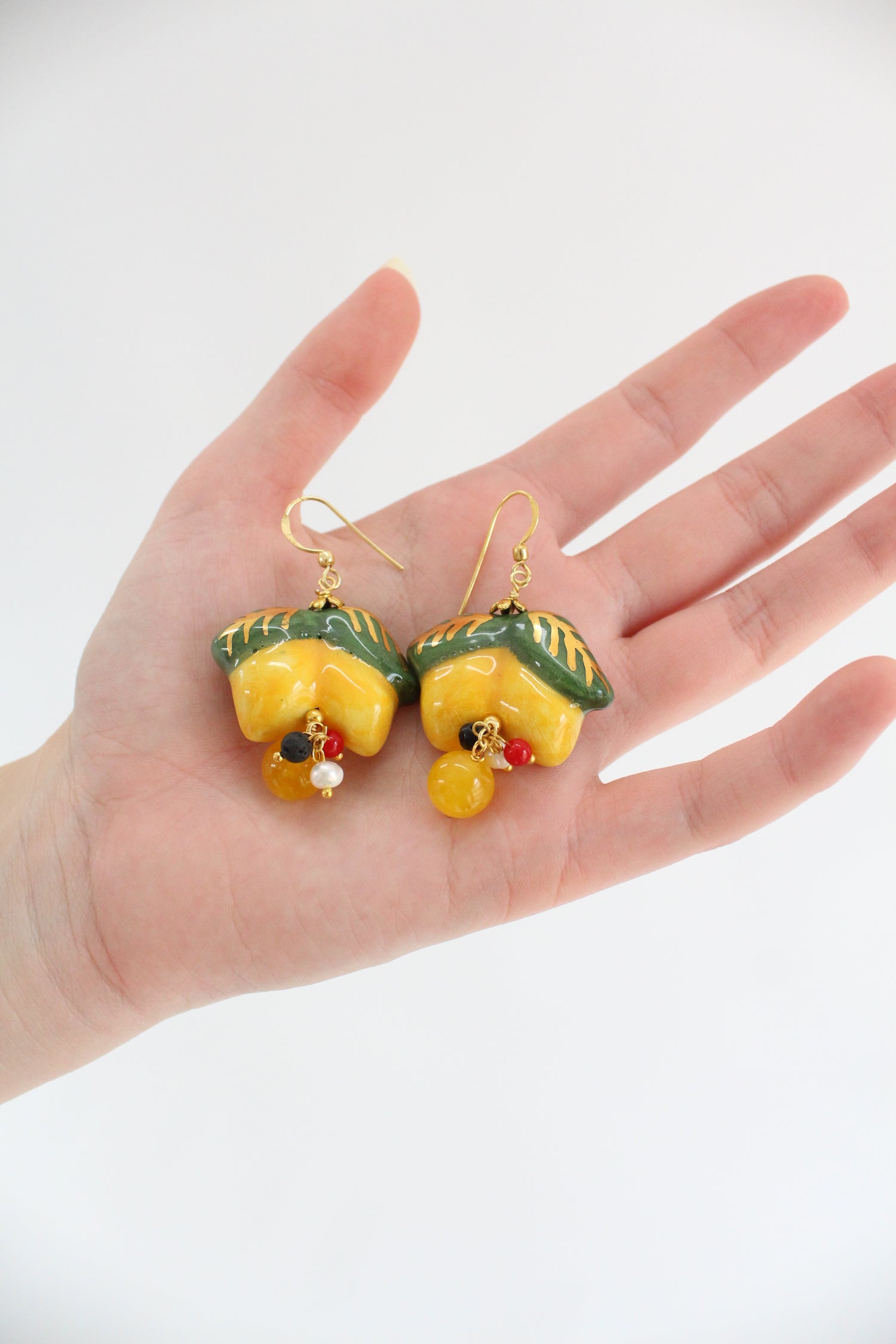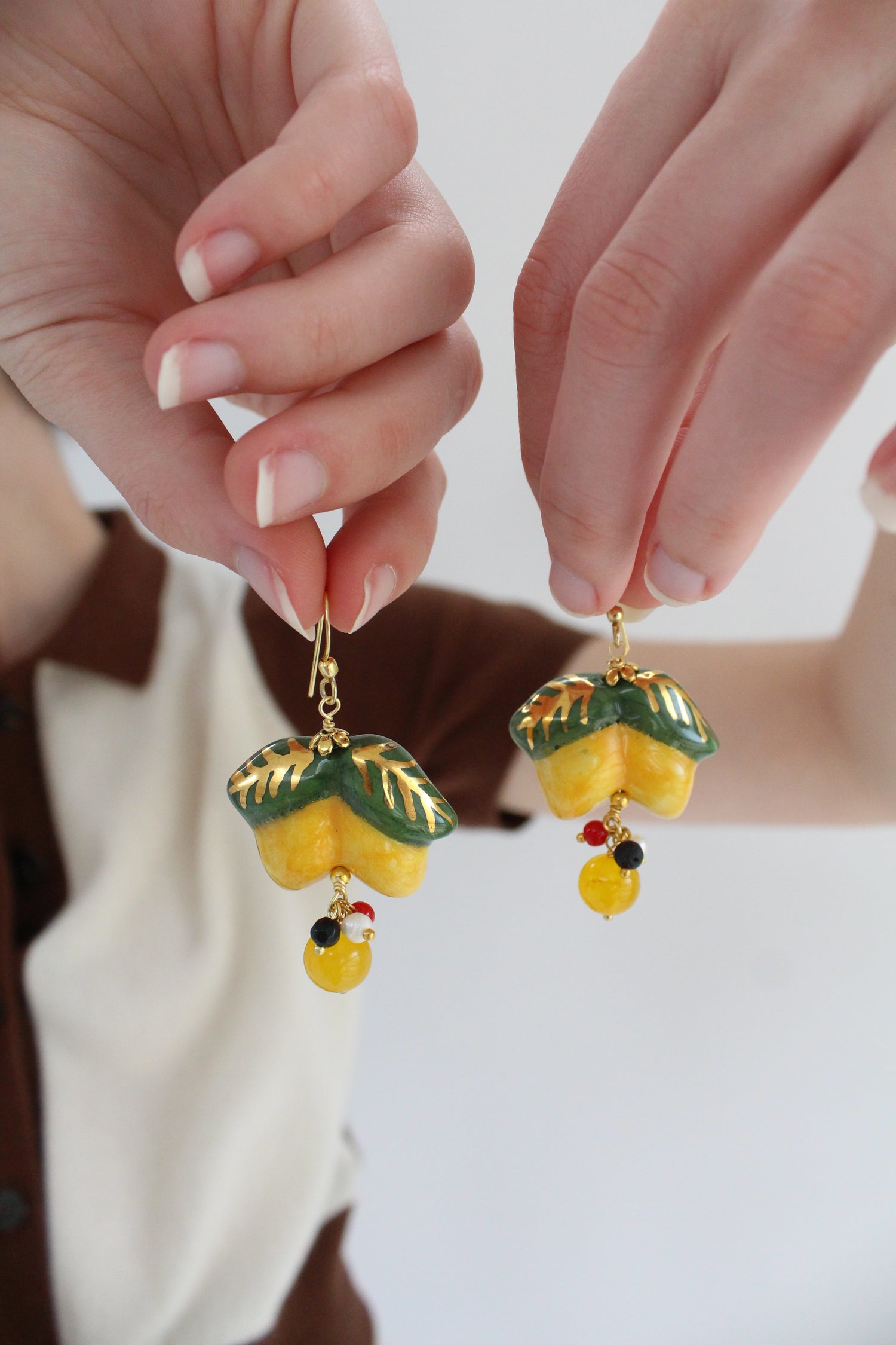 Painted by hand in Sicily, Italy. Each is ne of a kind, and slightly varied. Ceramic, 14K gold filled hooks. Easy to wear, not heavy. Make's a special gift for someone who has it all.