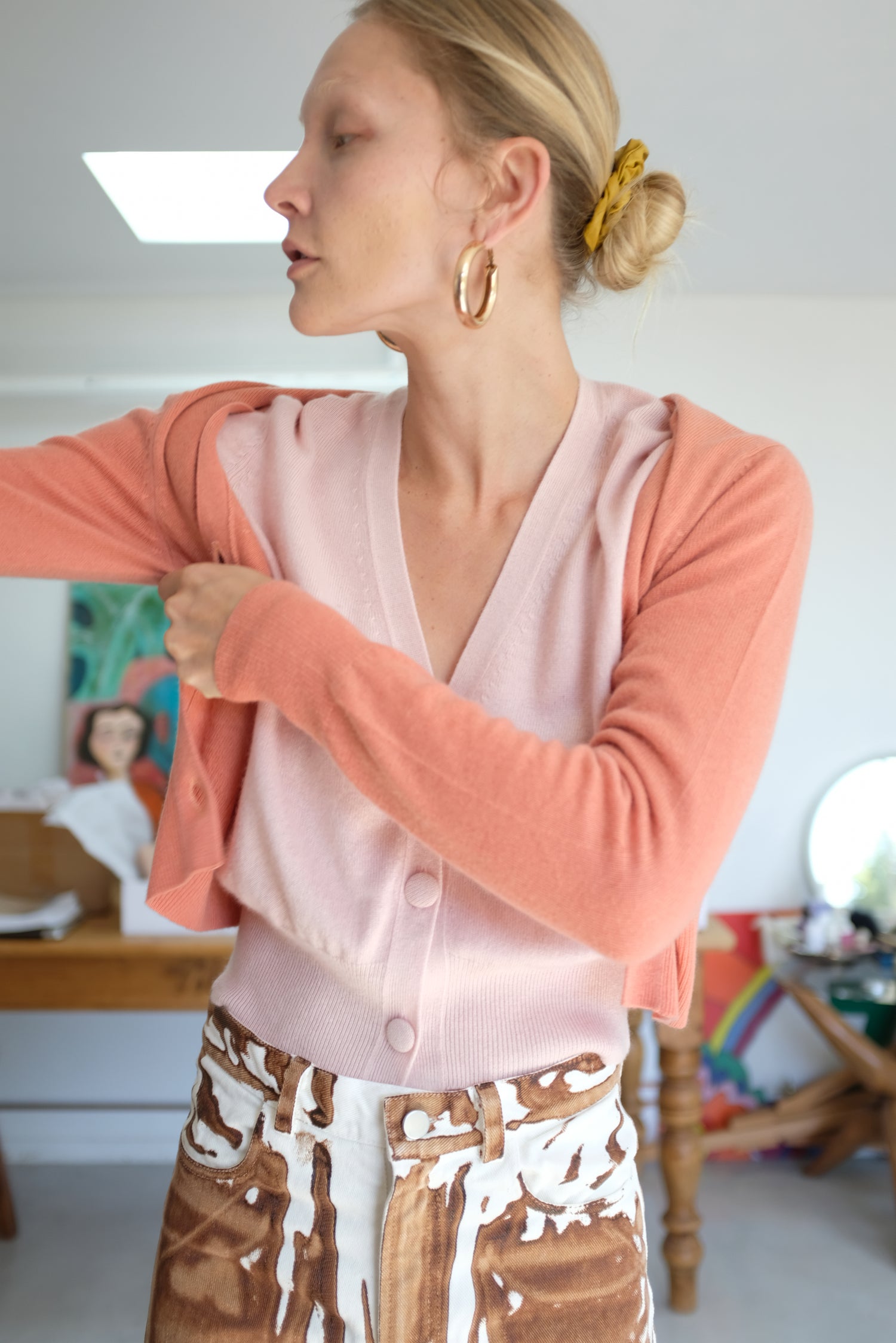 Best selling cardigan. 100% cashmere. Classic v-neck cardigan, slightly cropped, cashmere covered buttons down front. Medium weight, not sheer, wear as a layering piece or on it's own, solo. Size up for a less cropped look, and down for a more cropped look. Alexis is wearing size small/medium. Exclusive to Beklina.
