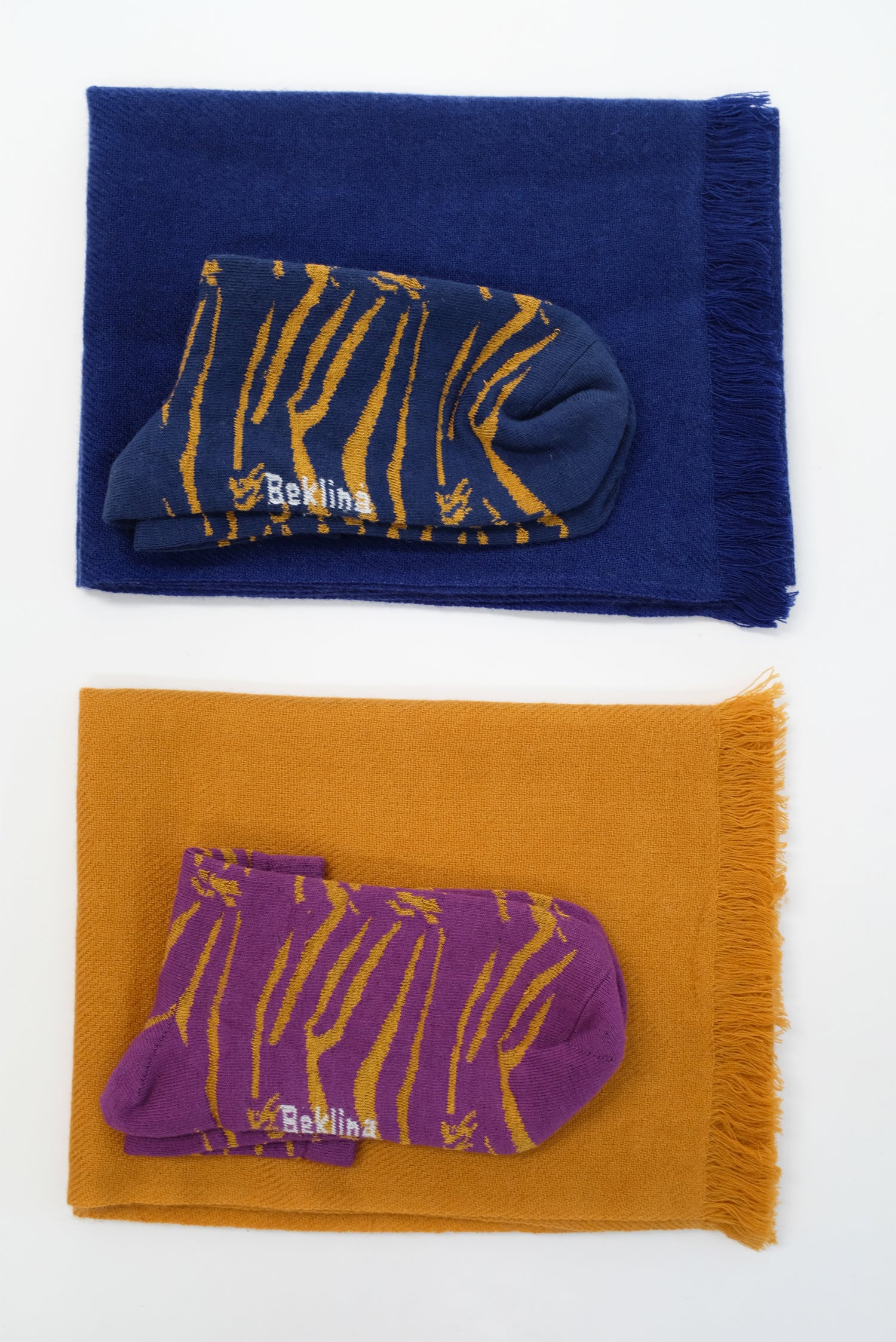 Gift set includes a 100% cashmere ultra luxurious scarf with matching cotton tiger socks. Each set comes beautifully gift wrapped, convenient for gift giving.
