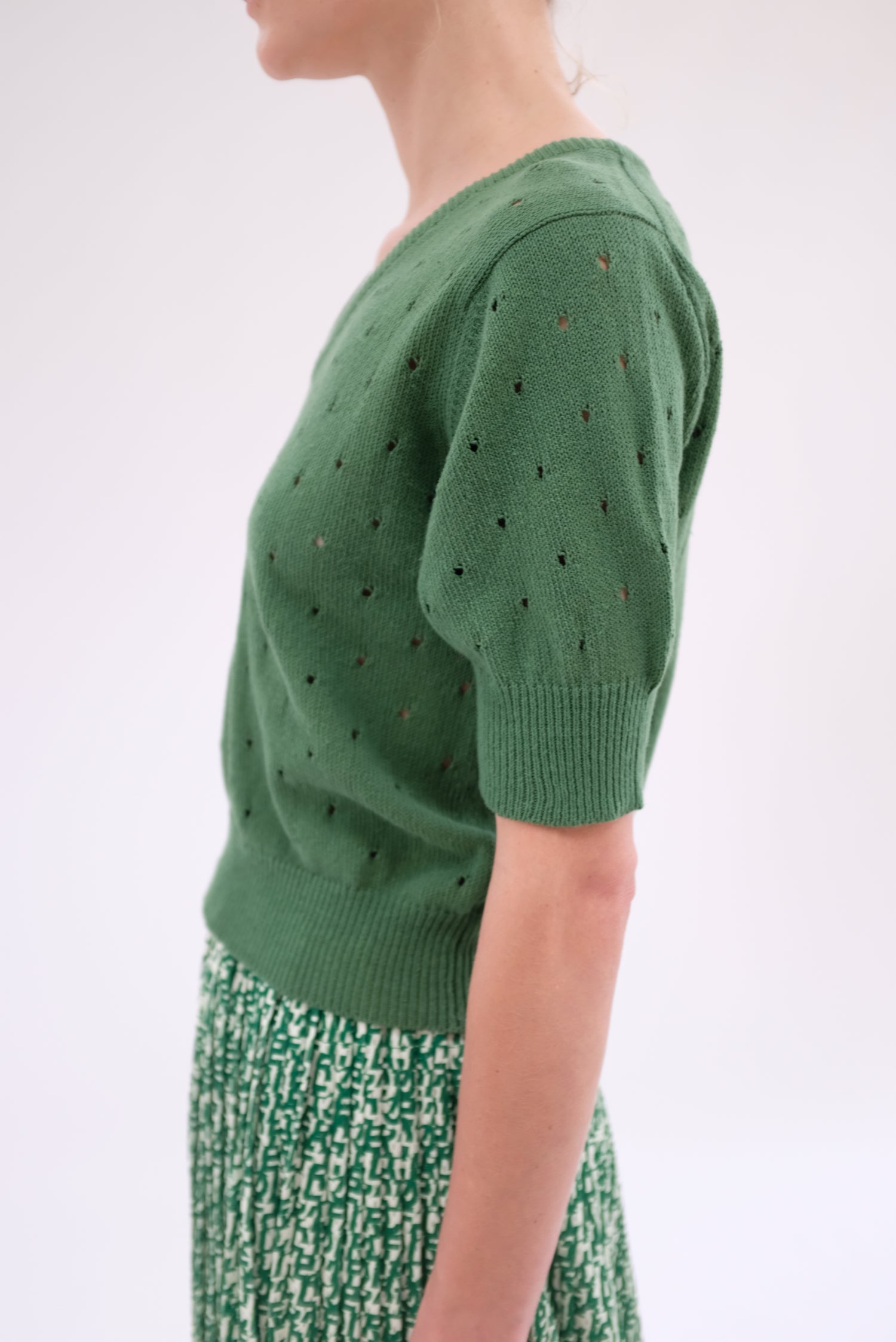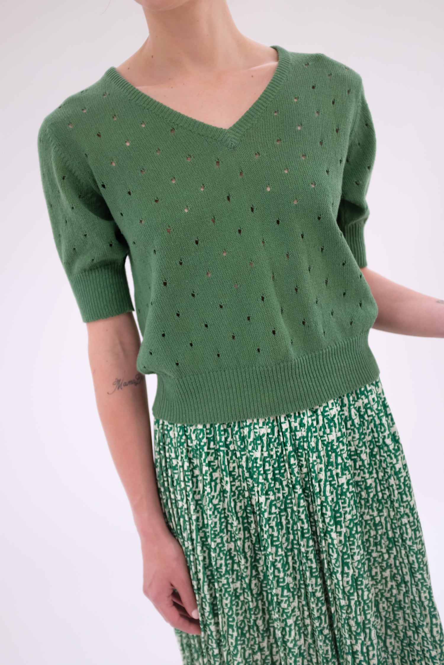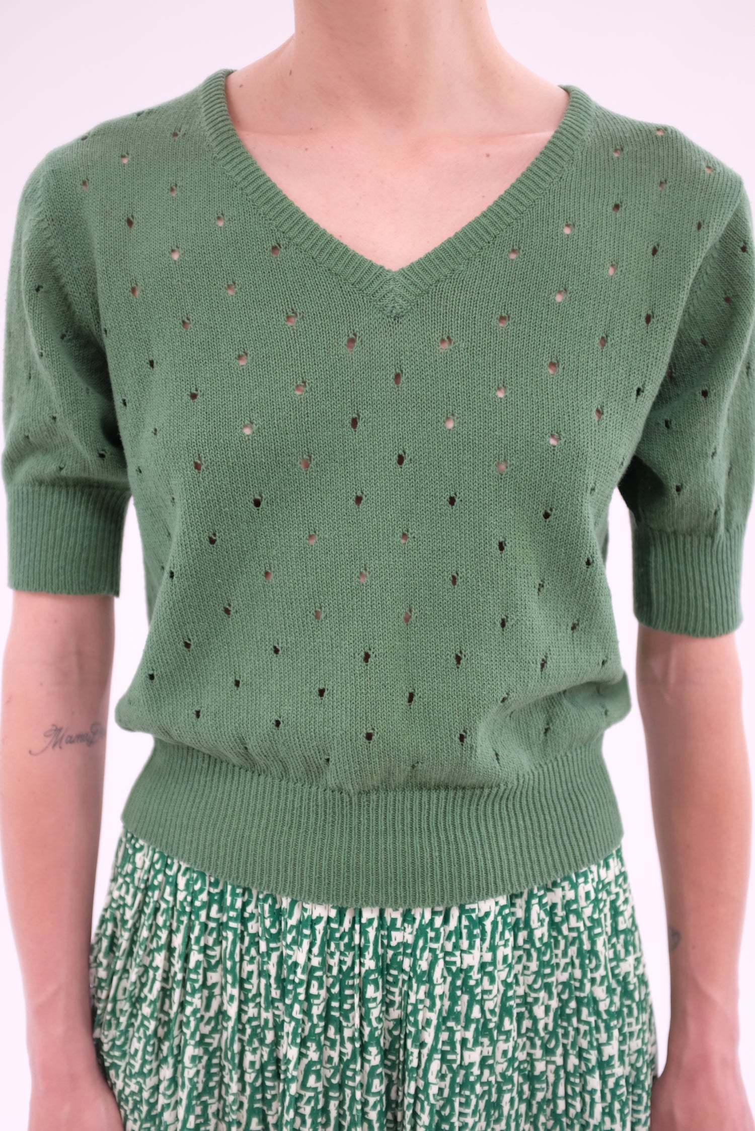 100% Organic cotton knit, short sleeved, v-neck, medium weight knit with hole-design pattern.