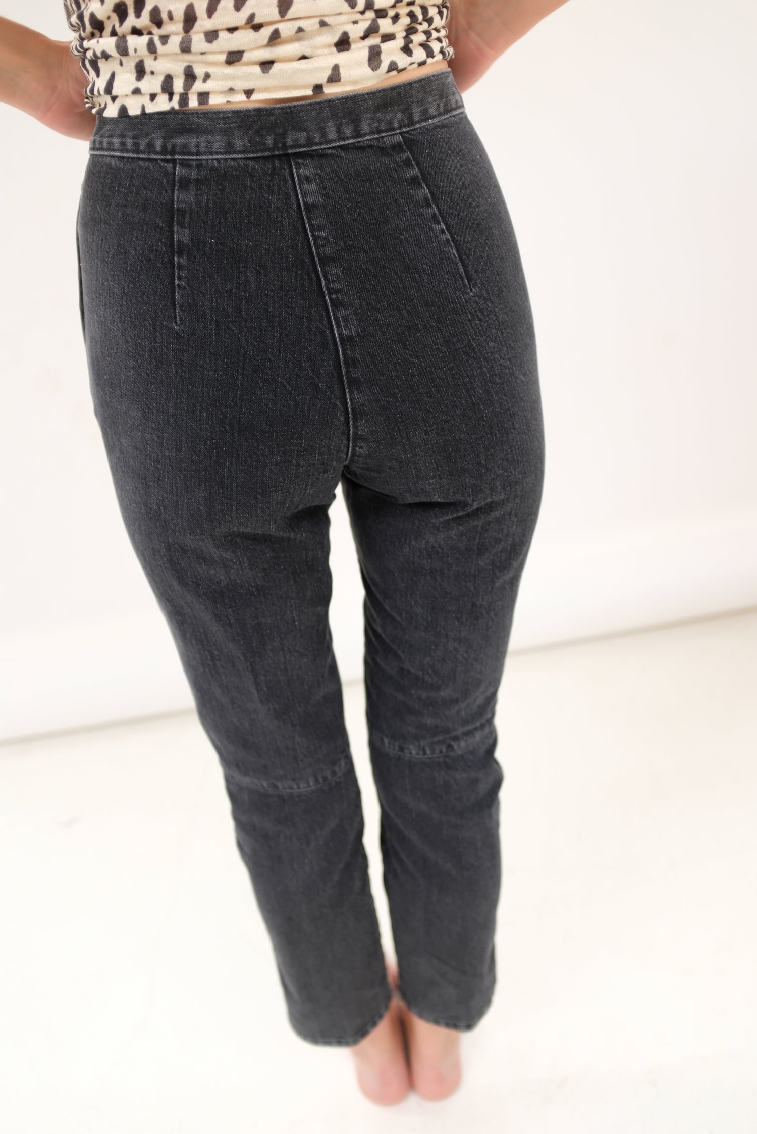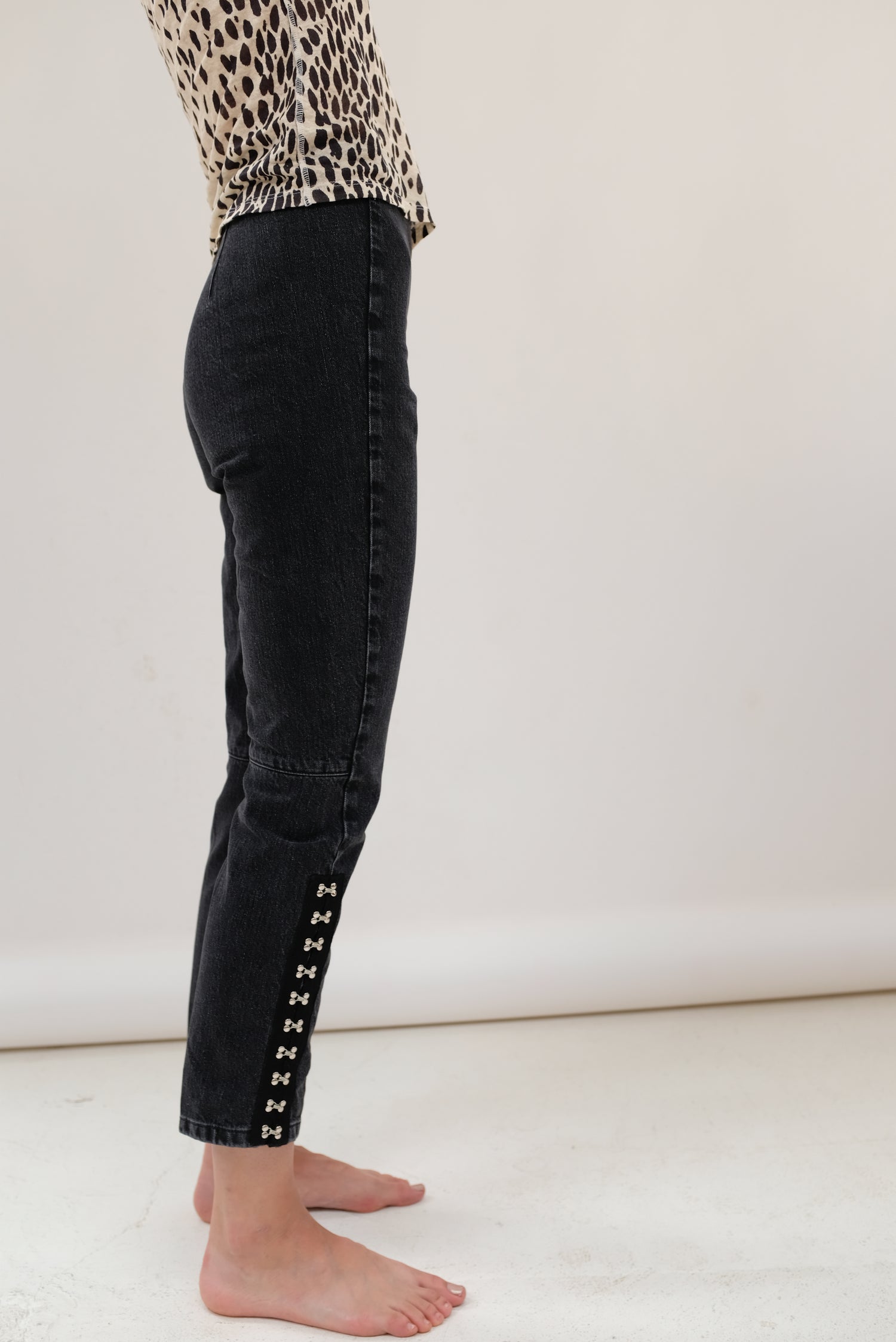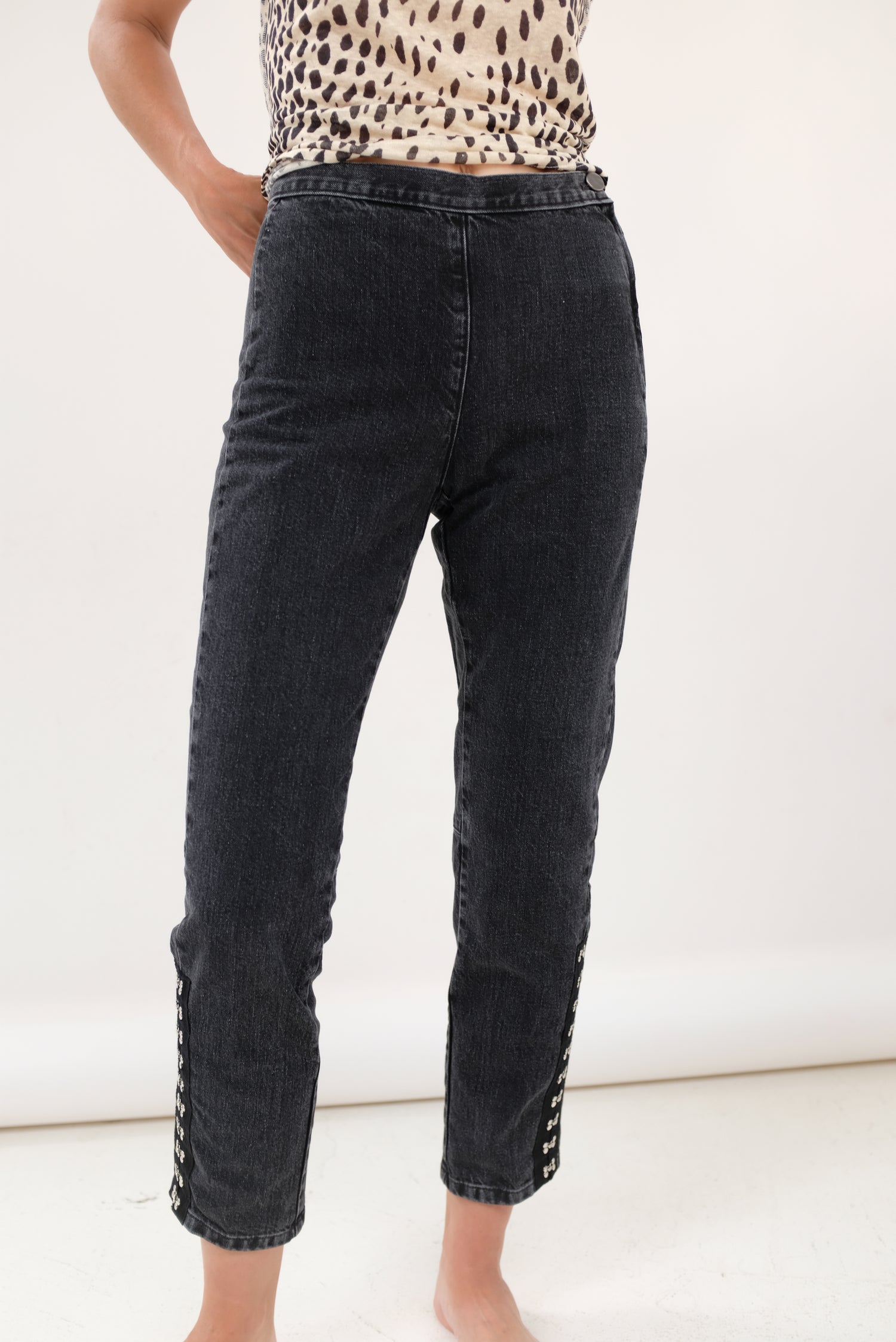 Tailored high-waisted silhouette. Trouser styling, hook and eye accents at hem, ankle length. Hidden zip and hammered silver-tone button at side. 100% Cotton.