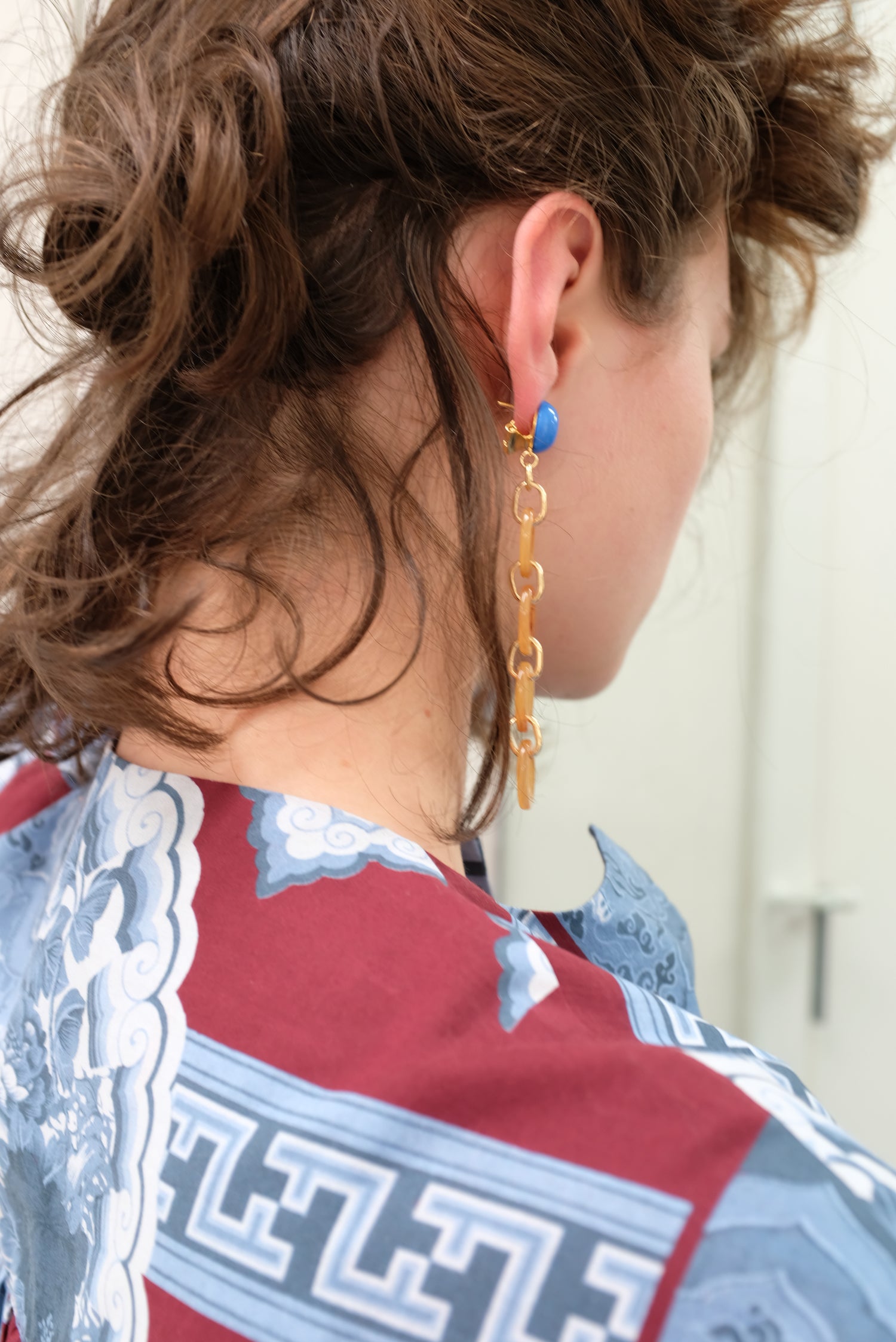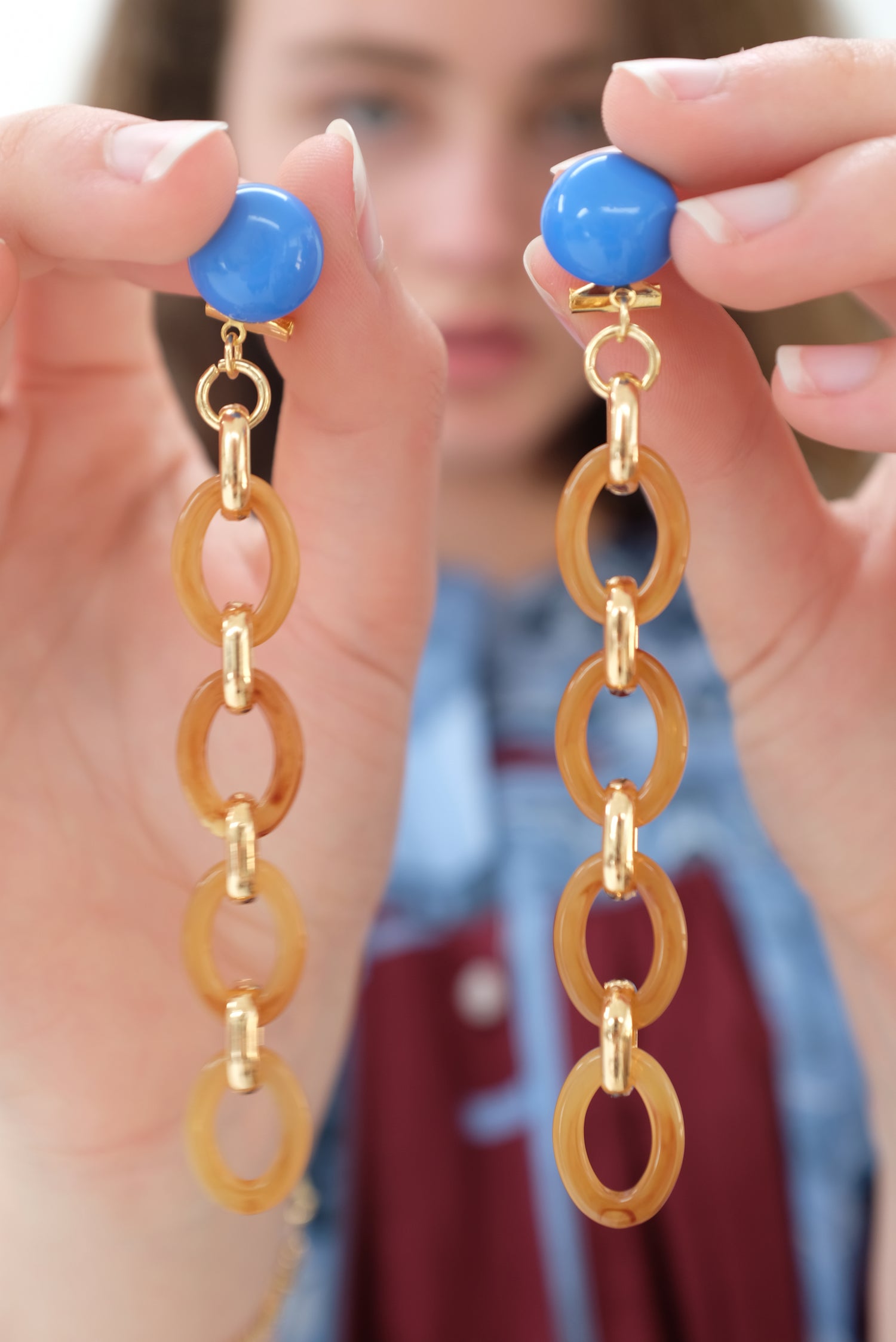 Acrylic chain drop earrings with metal accents. Stud fastening for pierced ears. Plated steel post. Aprox 4" drop.