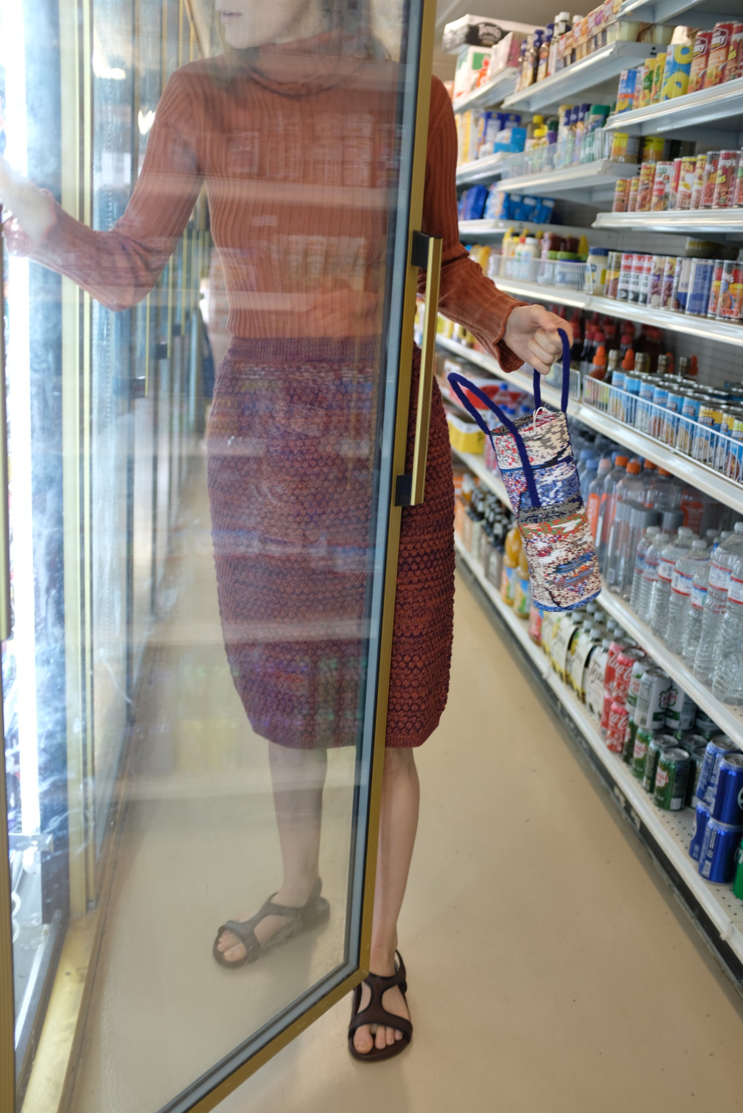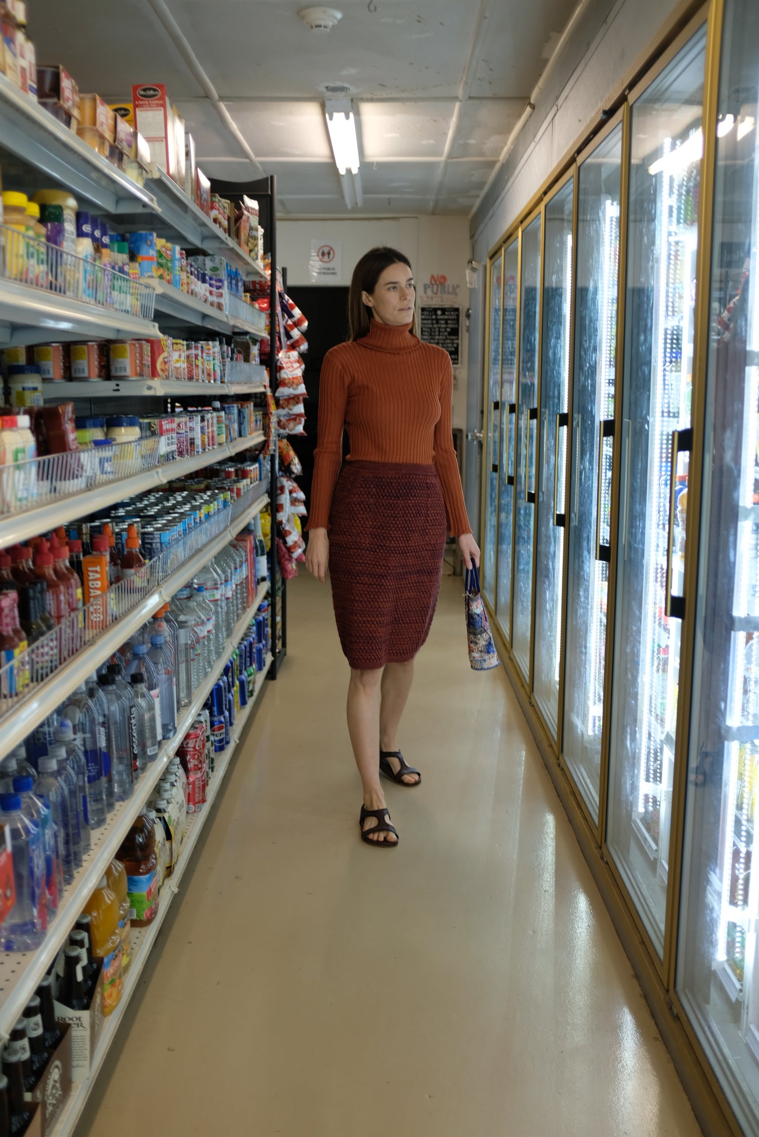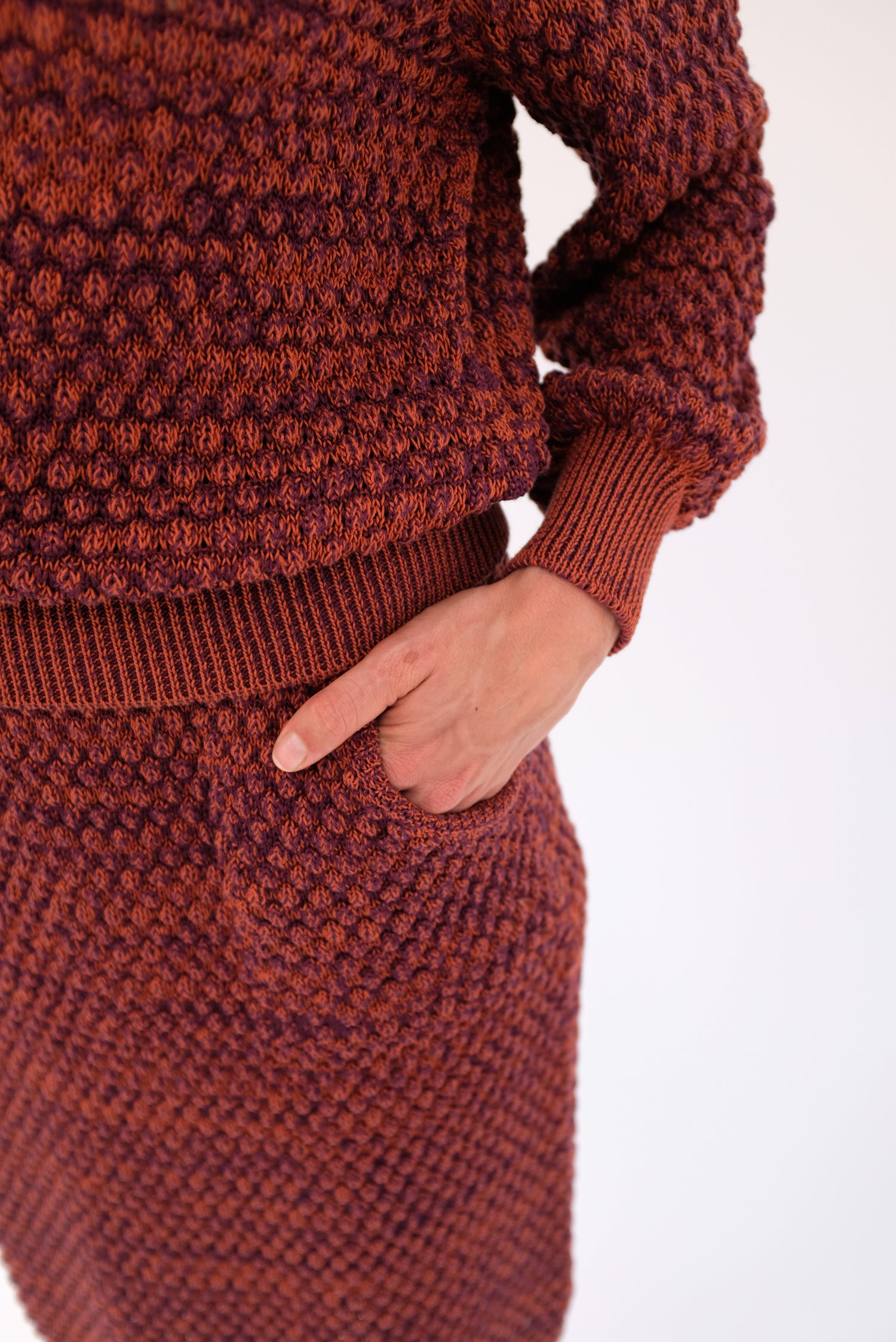 Gorgeous hand knit skirt, with a unique texture, medium weight. Washable luxurious 100% Peruvian pima cotton. Side pockets. Exclusive to Beklina. Runs true to size.