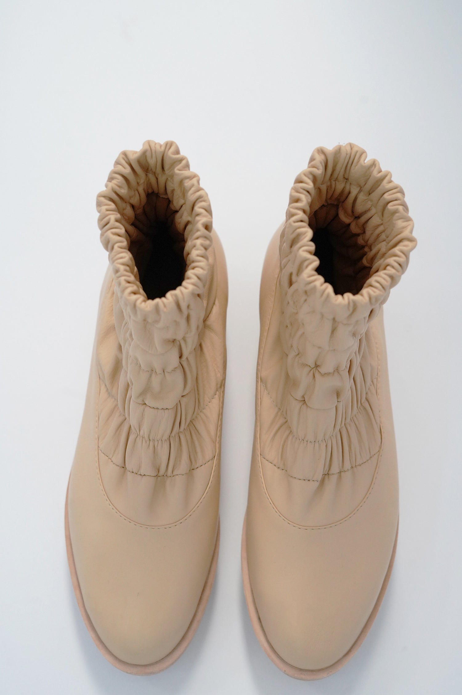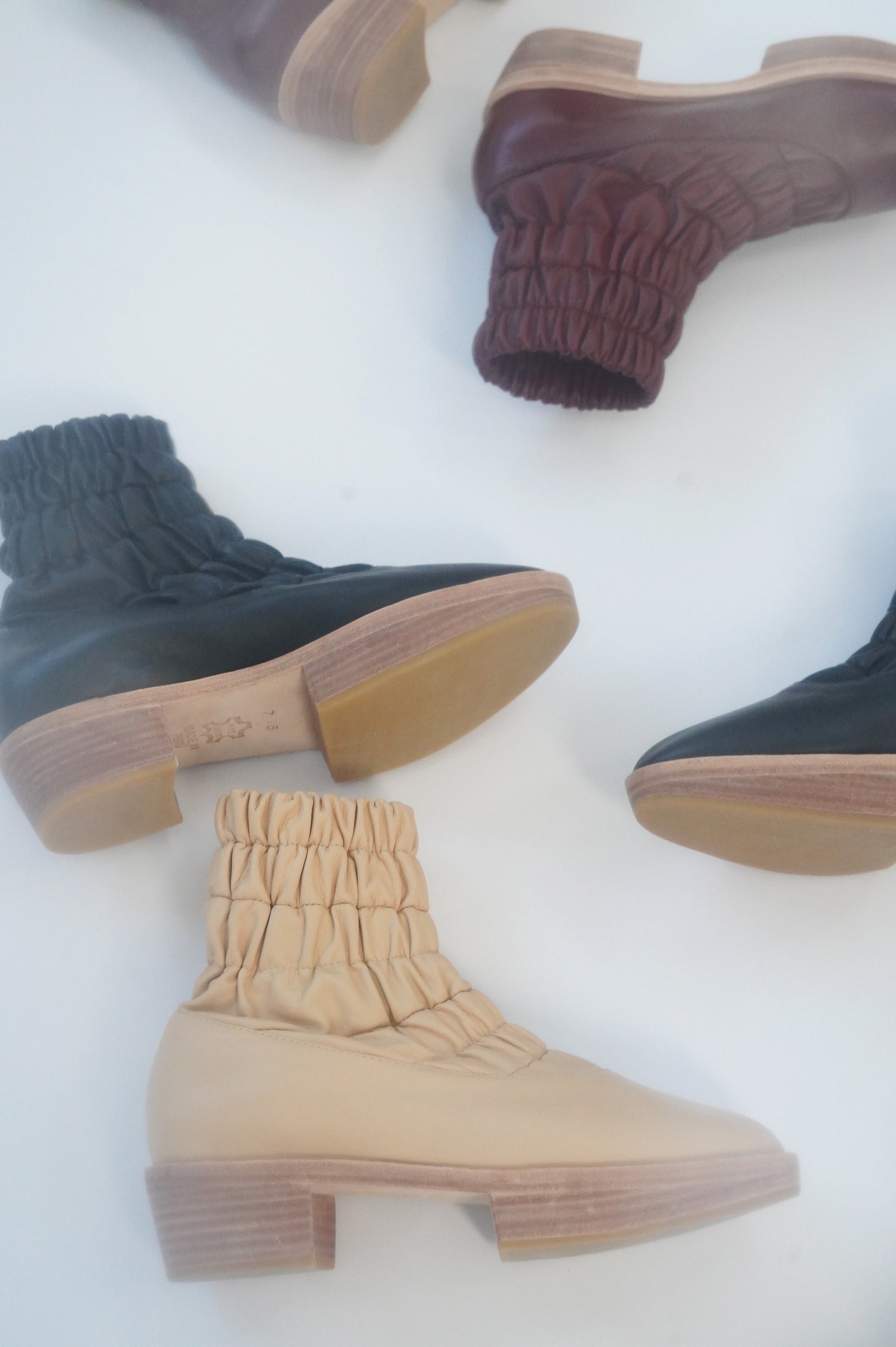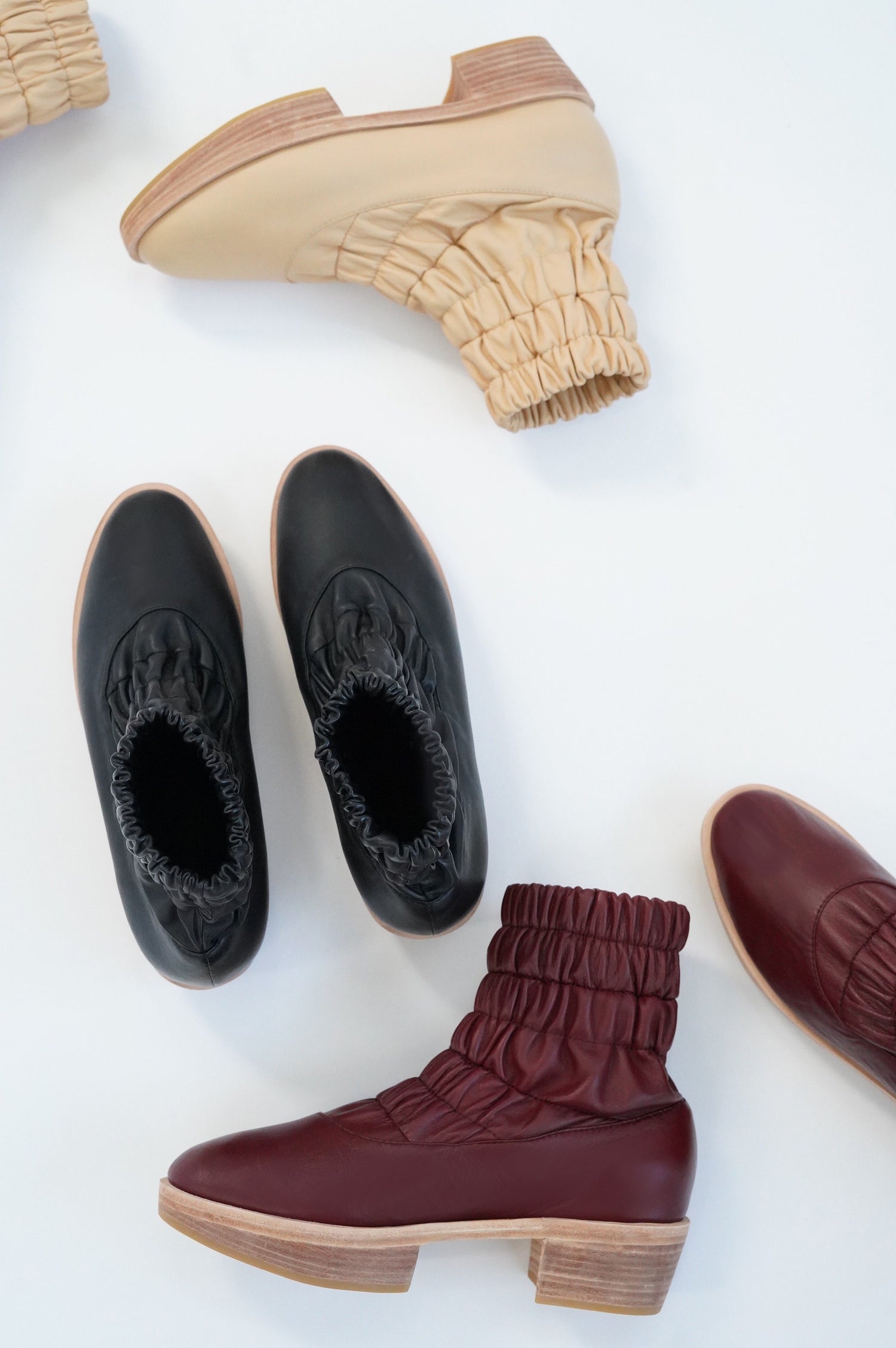 Buttery soft glove leather upper, with a luxurious glove fit that molds to your feet. Gathered leather elastic covered shaft. Heel is in two parts so they feel like you're wearing flats.