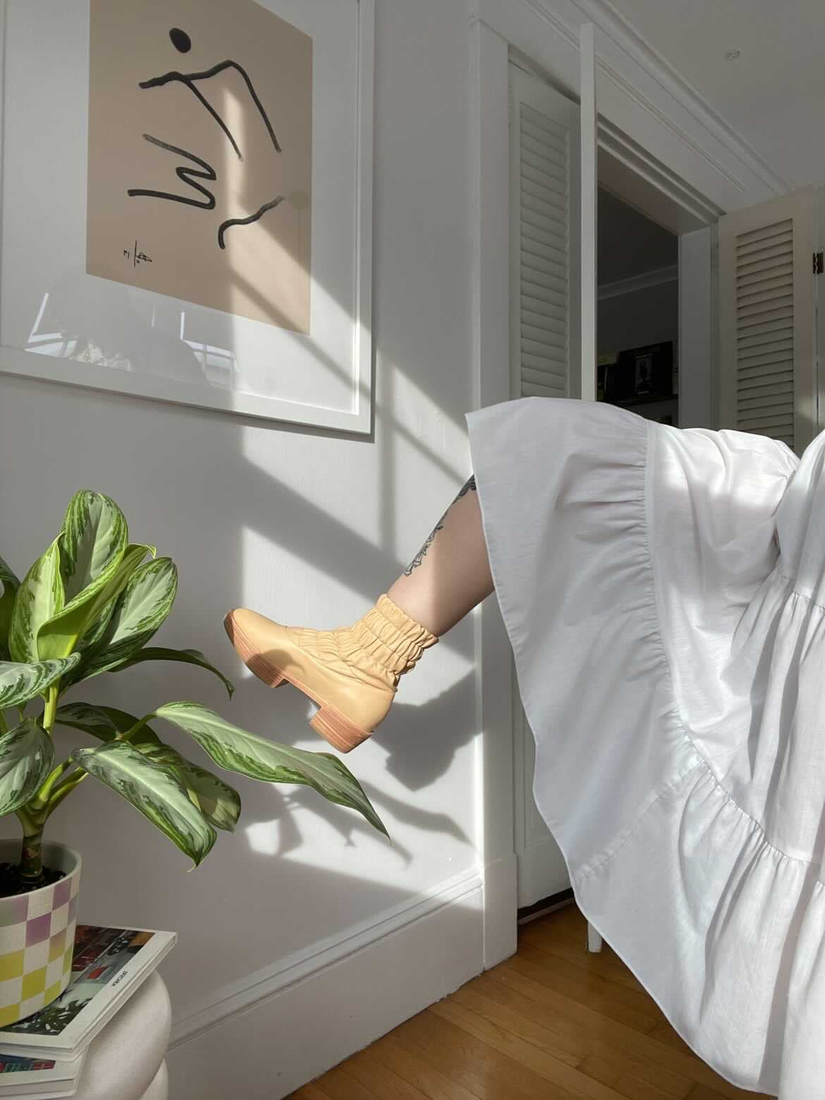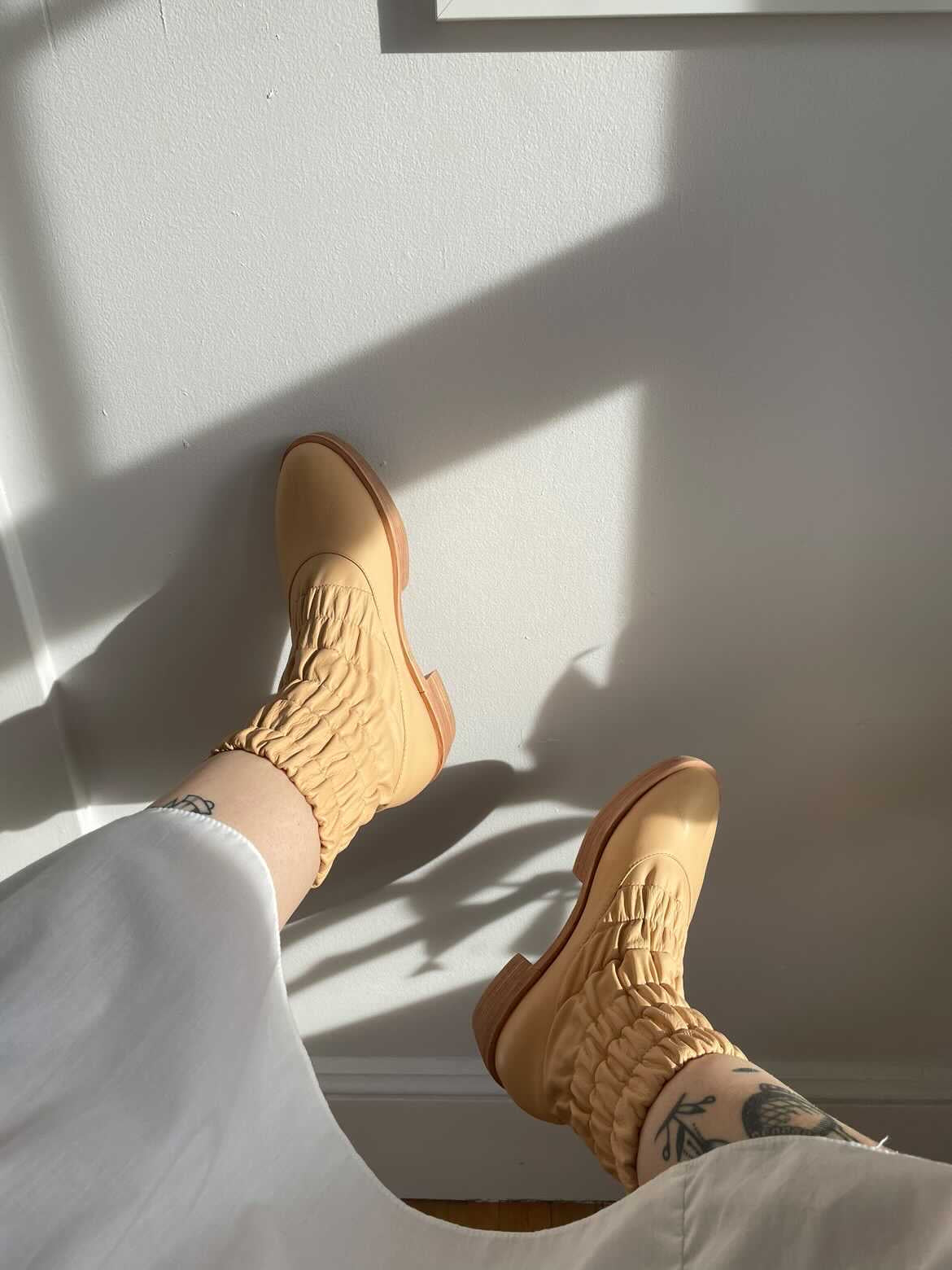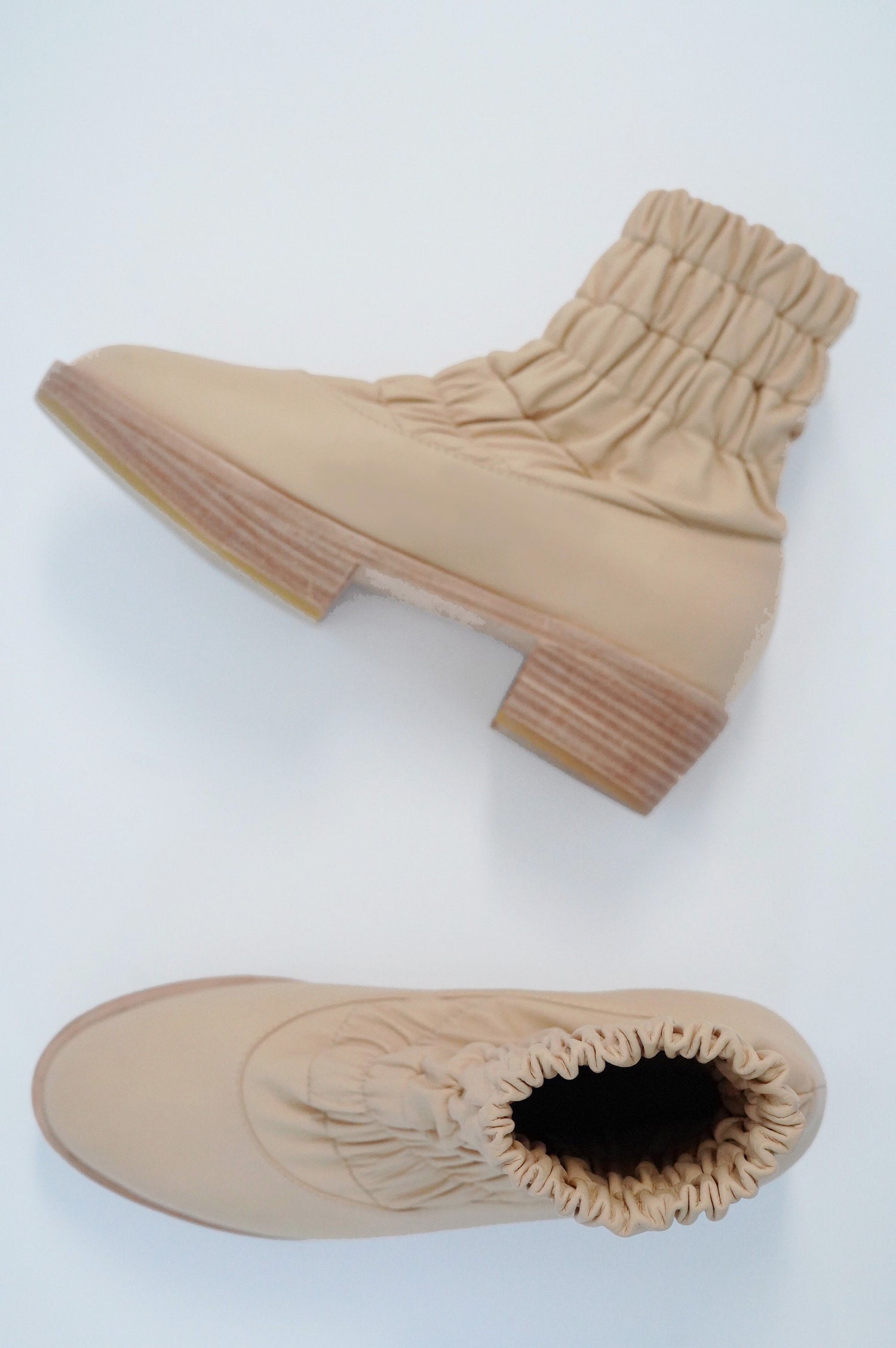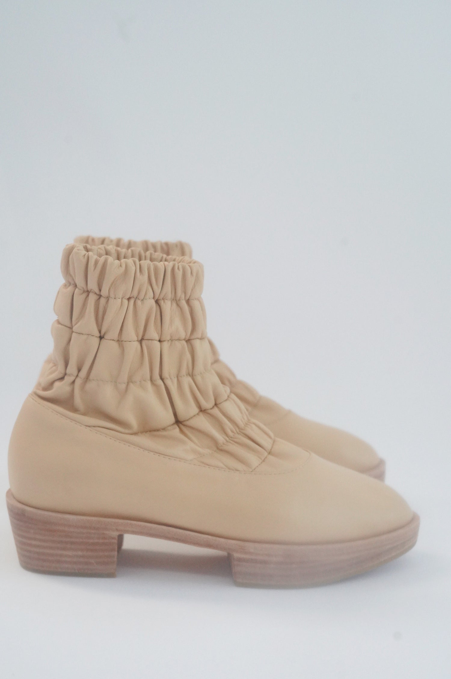 Buttery soft glove leather upper, with a luxurious glove fit that molds to your feet. Gathered leather elastic covered shaft. Heel is in two parts so they feel like you're wearing flats.