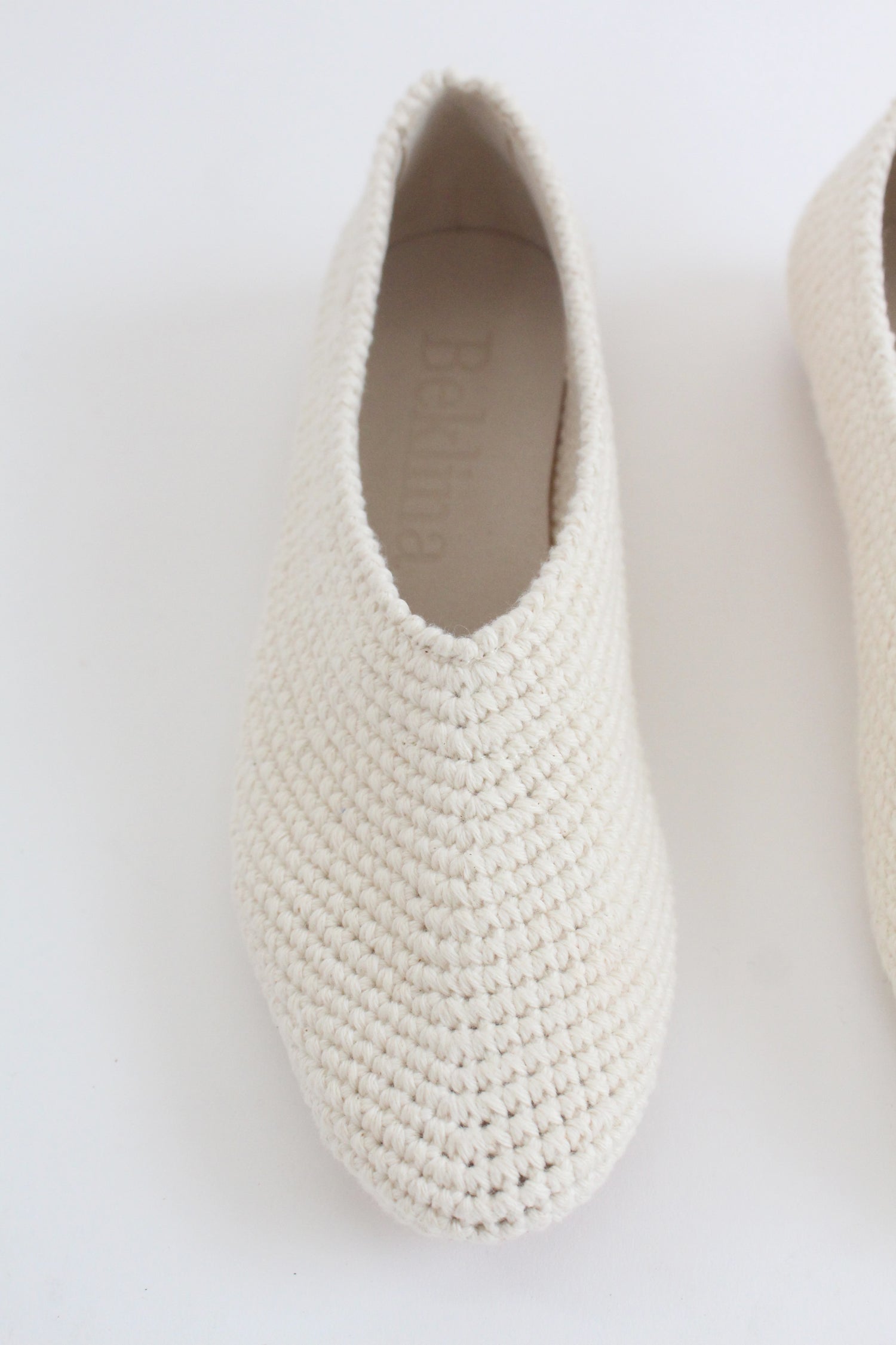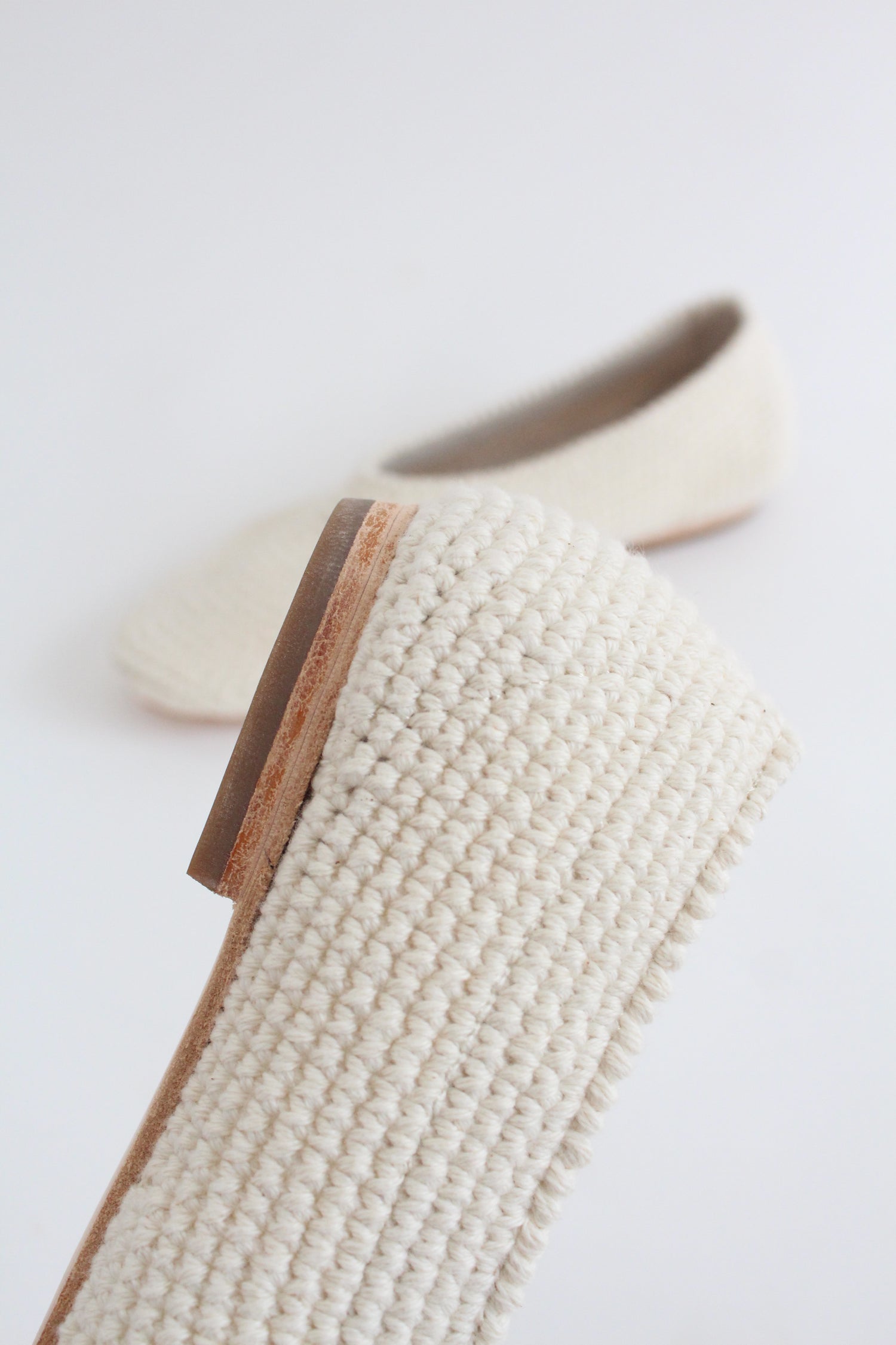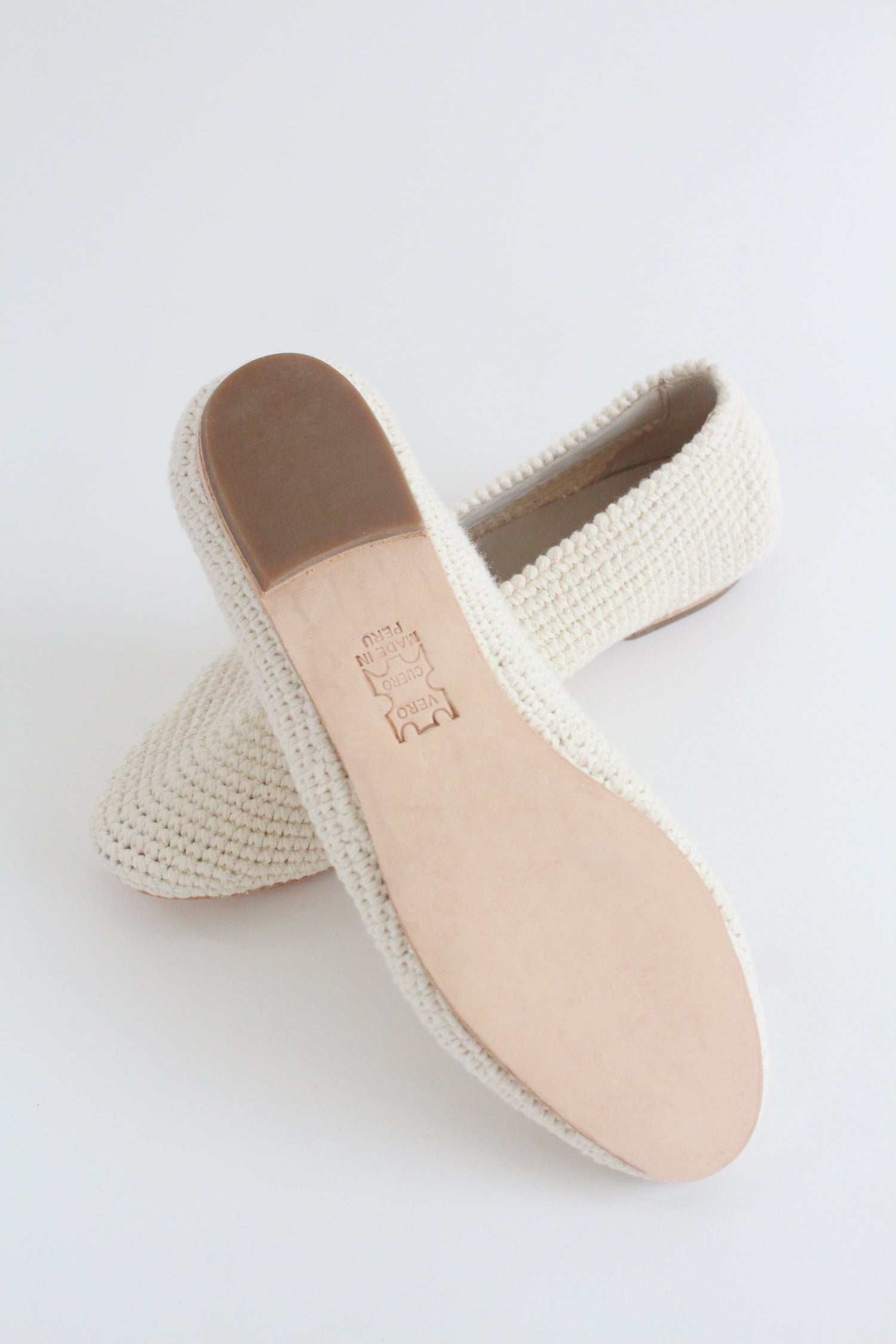 100% Hand crocheted Peruvian cotton, natural unbleached cotton. Luxurious glove fitting flats that mold to your feet and breathe. We're extremely proud of these beautiful handmade shoes.