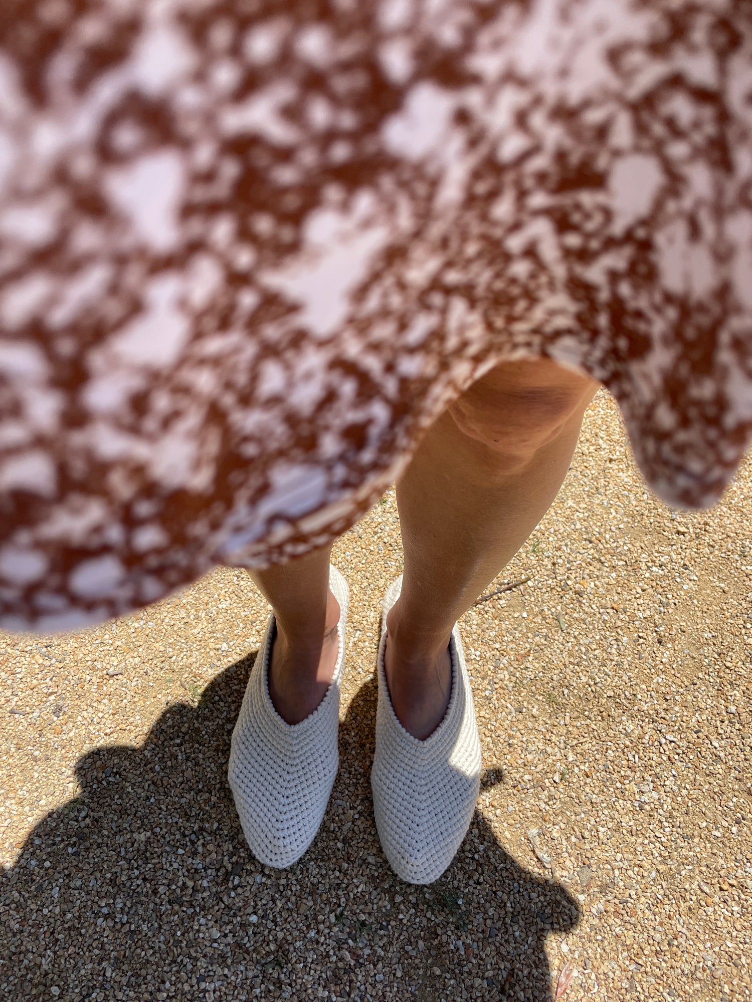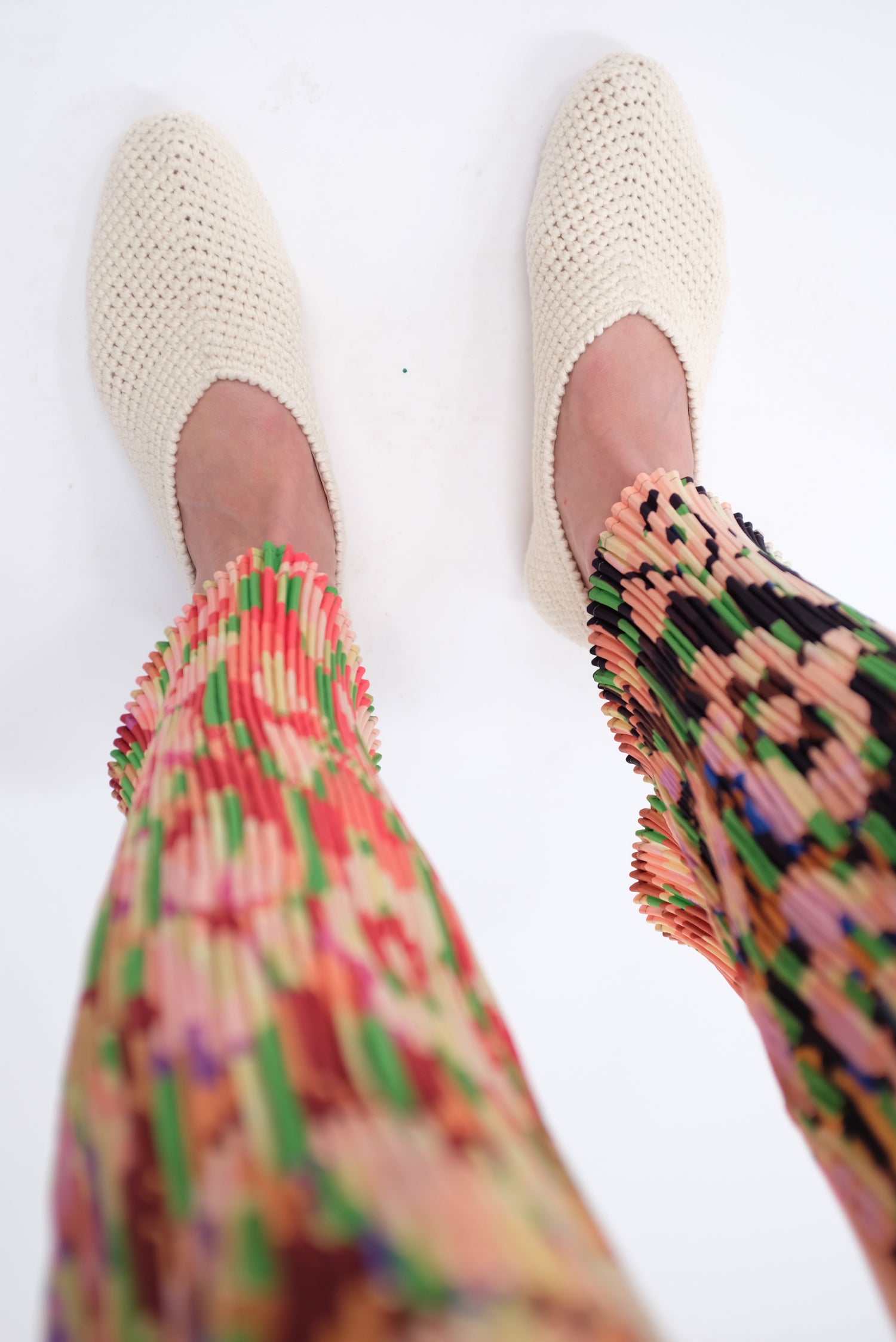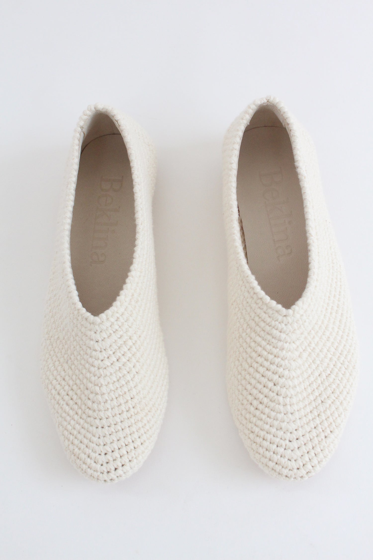 100% Hand crocheted Peruvian cotton, natural unbleached cotton. Luxurious glove fitting flats that mold to your feet and breathe. We're extremely proud of these beautiful handmade shoes.