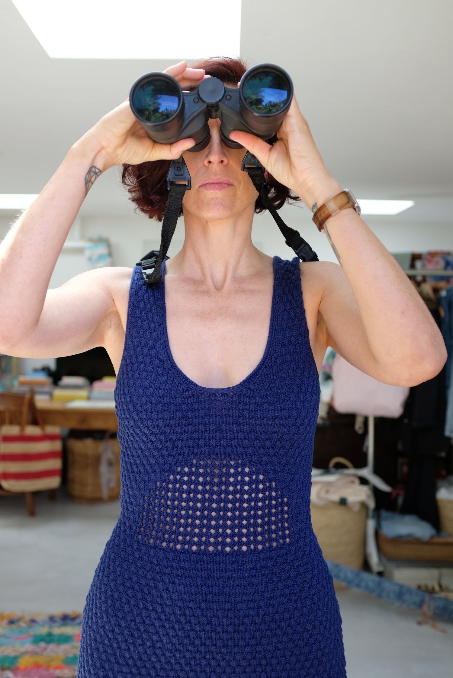 Gorgeous hand knit tank dress, with a unique mesh design details and texture, medium weight. Washable, 100% luxurious Pima cotton. Natural stretch and give from the knit, making it an easy fitting style that adjusts to your natural shape.
