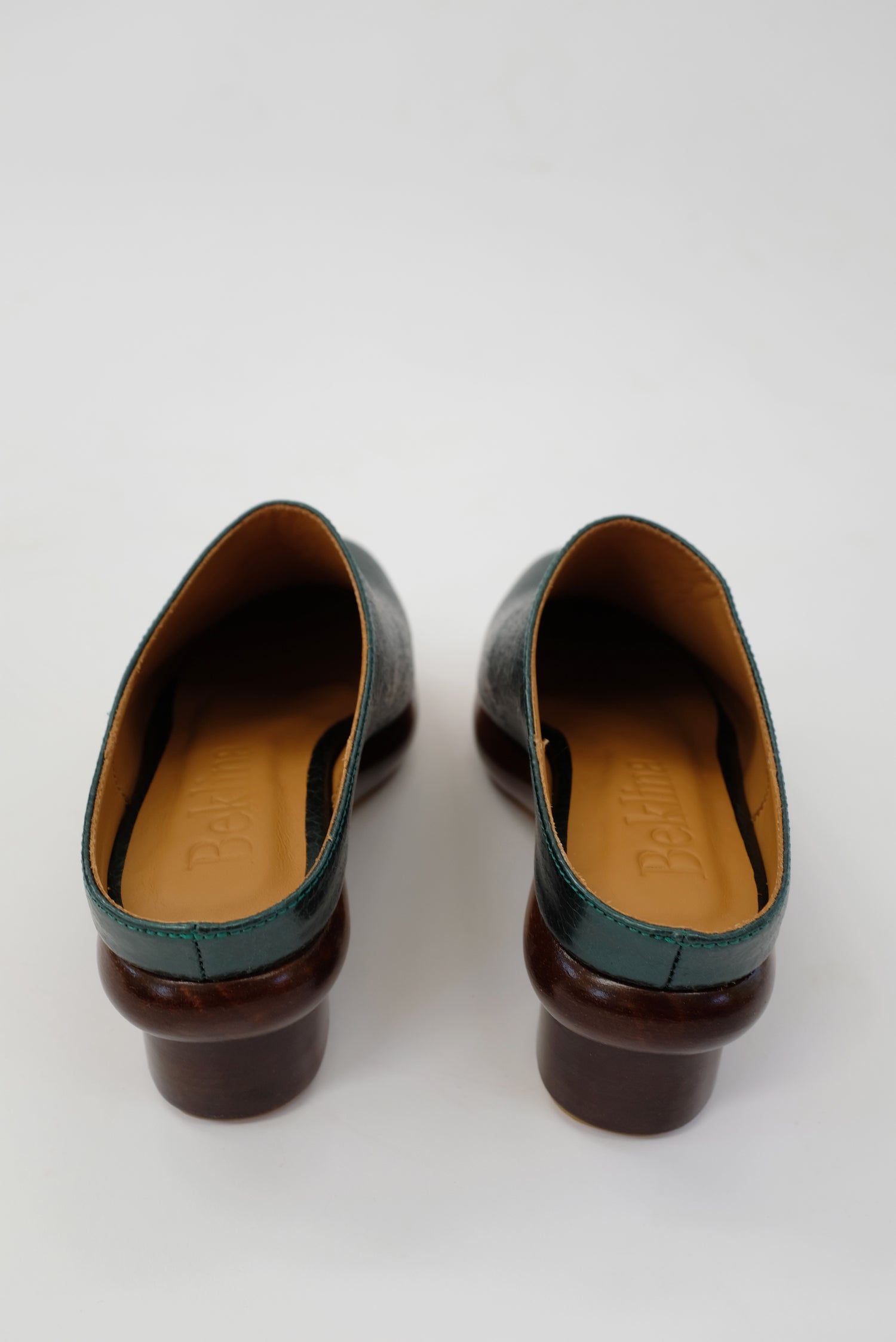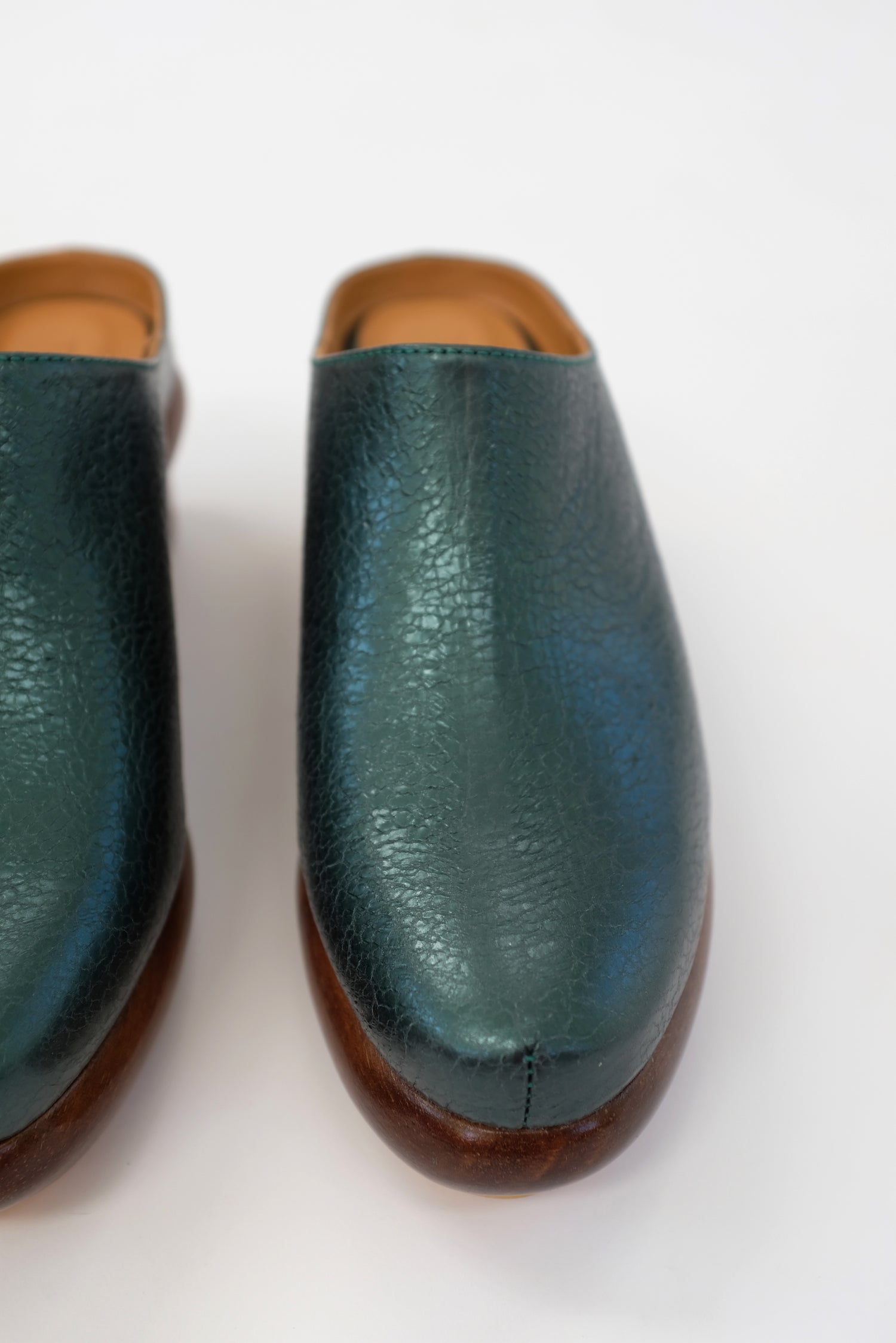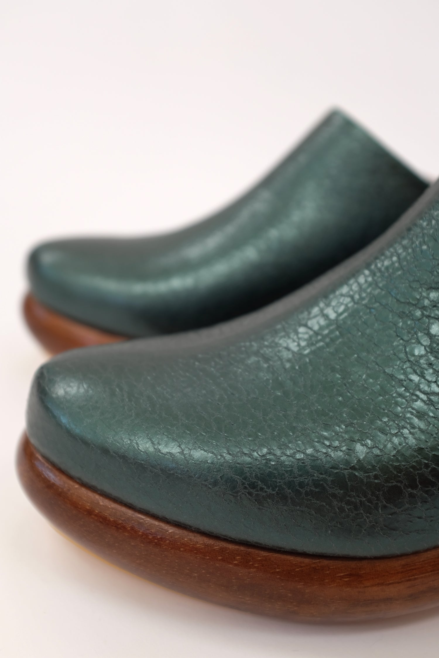 Artfully hand carved wooden platform heel, 100% soft leather uppers and leather lined, lacquered 1" to 2" platform heel. Ultra comfortable, padded, all-day-wearable, wood clog. Free of staples. These run small, we suggest going up a size.