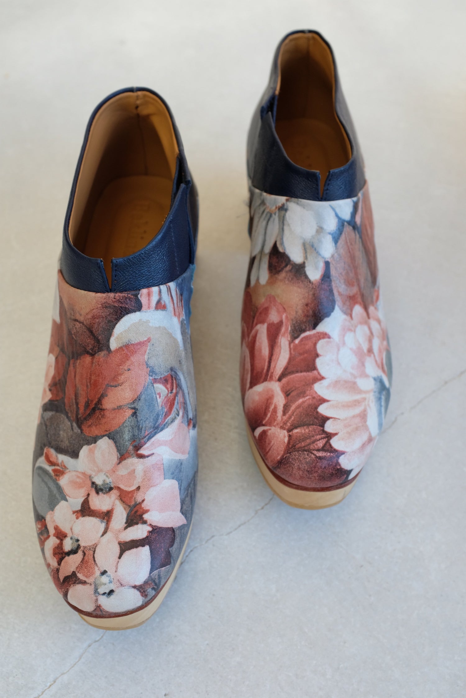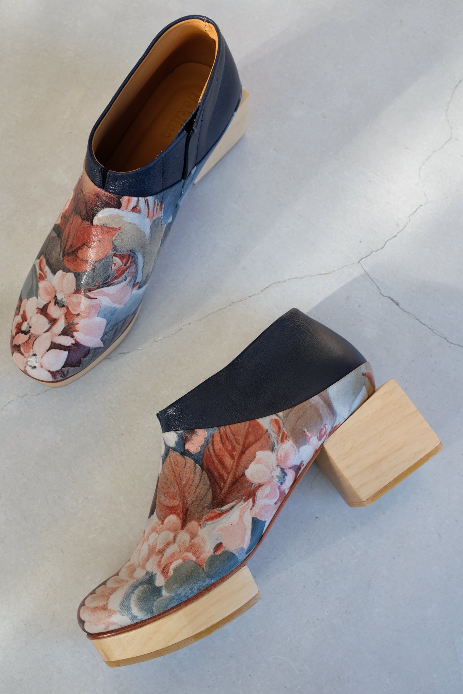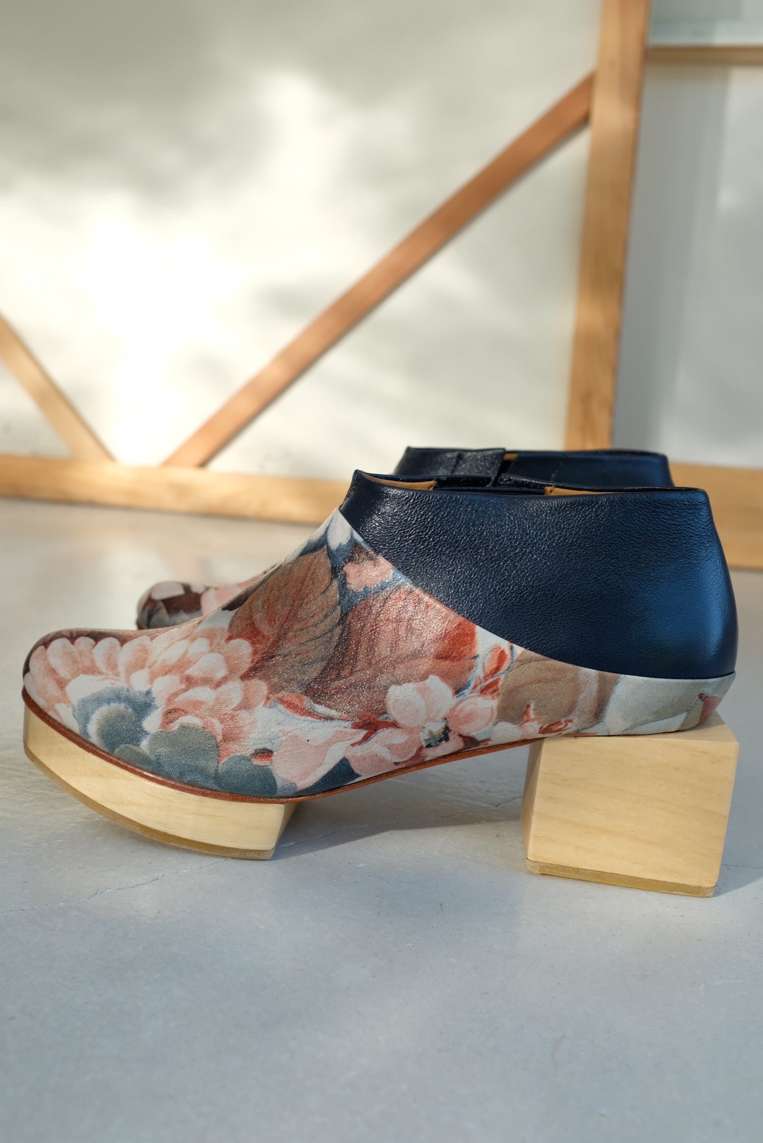 Hand carved wooden platform split heel, comfy 100% Italian leather uppers and leather lined, hidden side elastic for easy on and off, 2" back heel and 1" front platform. The heel is split it two parts, allowing the shoe's middle leather layer base to bend, making it very wearable and ultra comfortable.