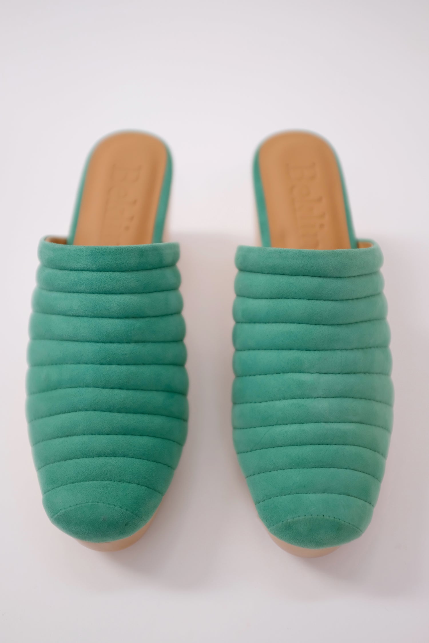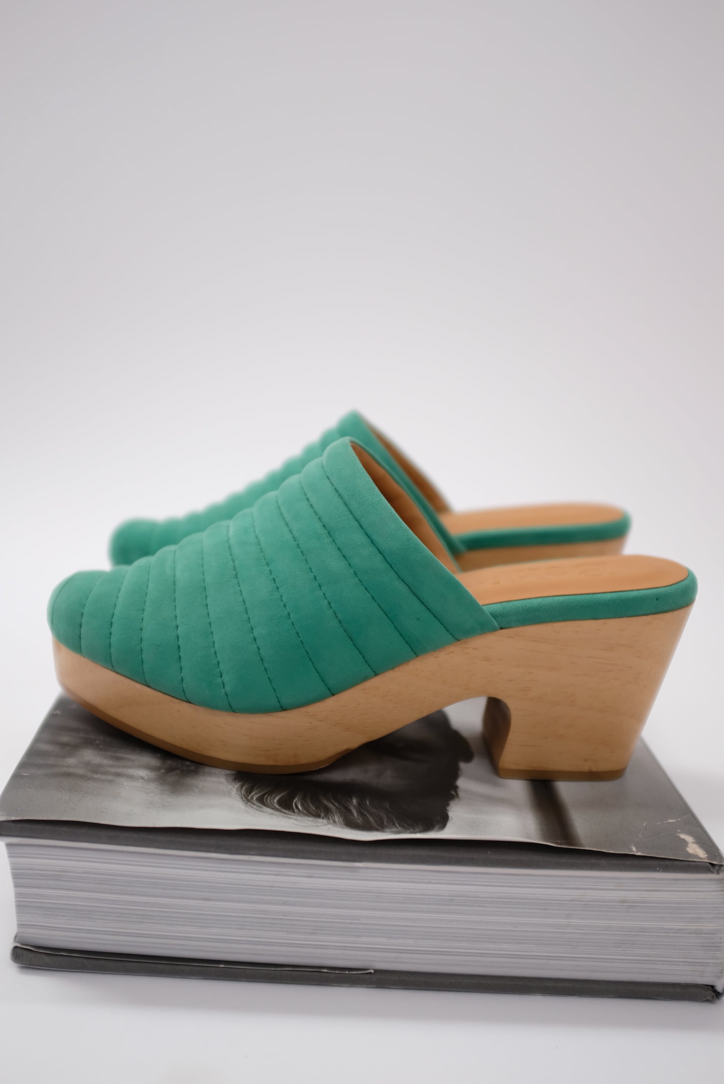 Hand carved wooden platform heel, 100% suede leather uppers and leather lined. 2 1/2" heel. Ultra comfortable, all-day-wearable, wood wedge clogs. Free of staples. Running true to size. If between sizes or on the wider side, we suggest going up a half size.