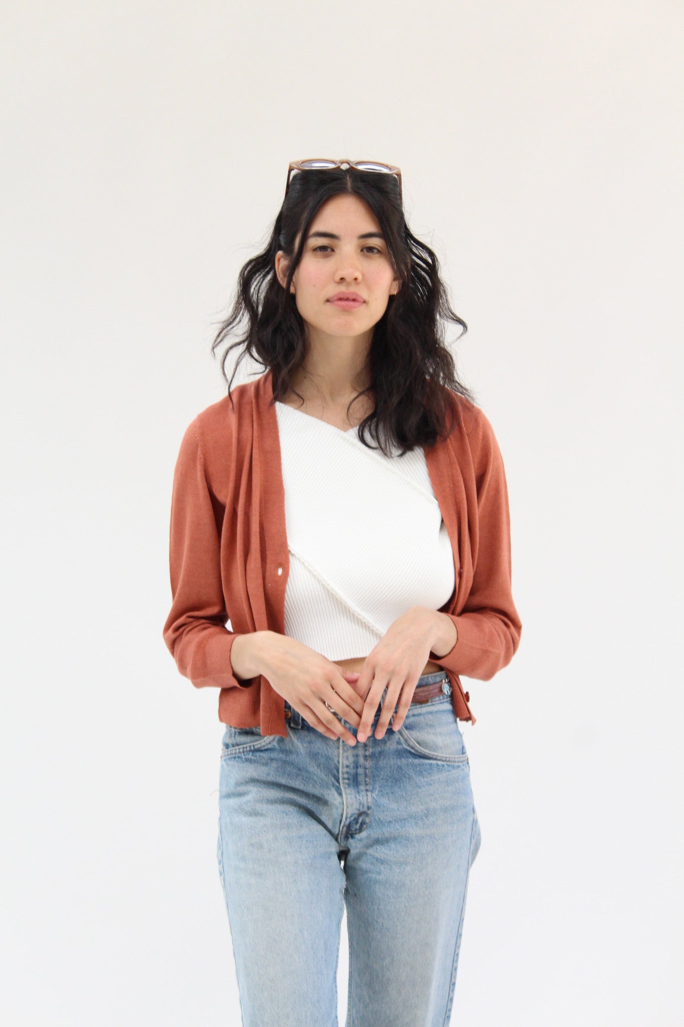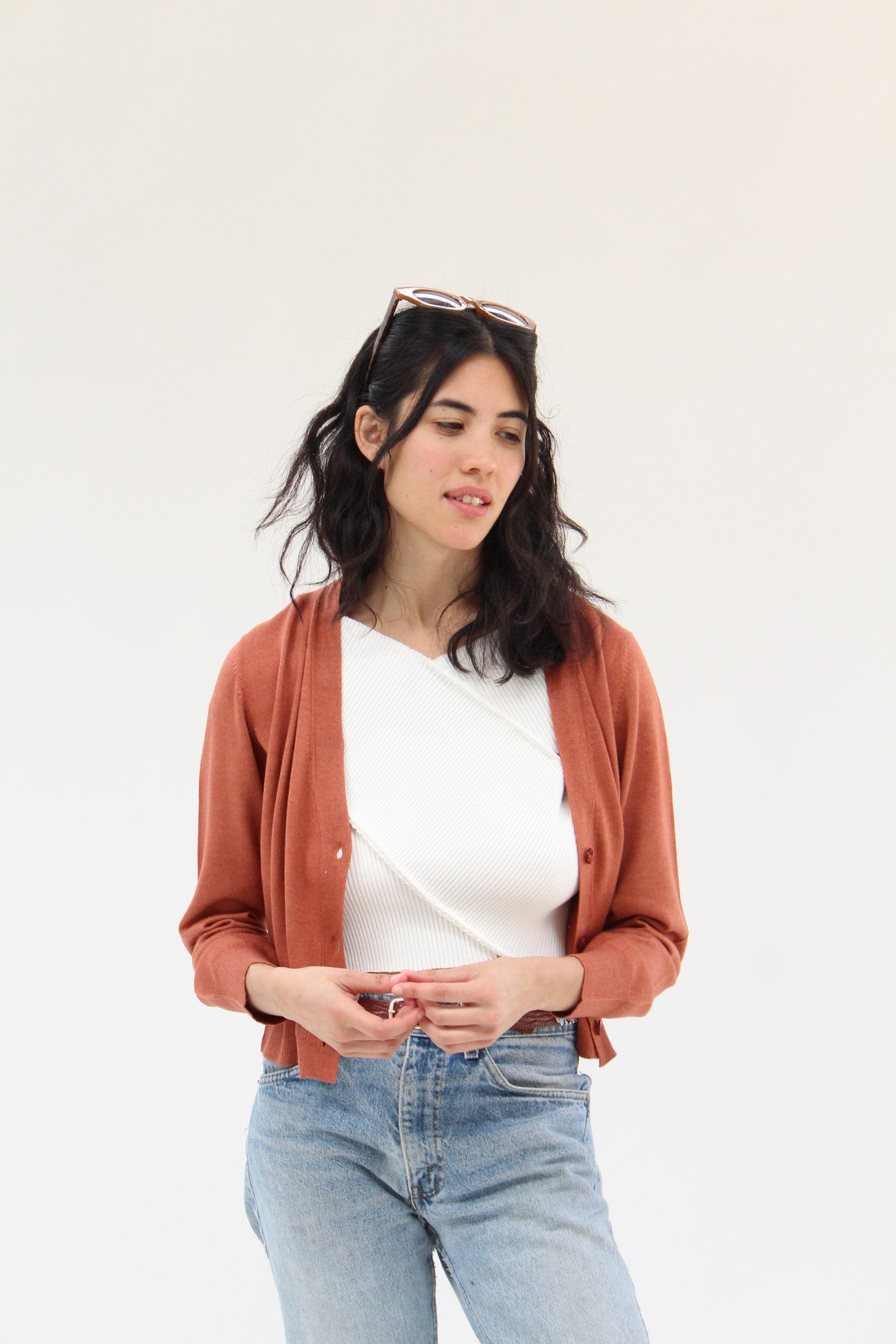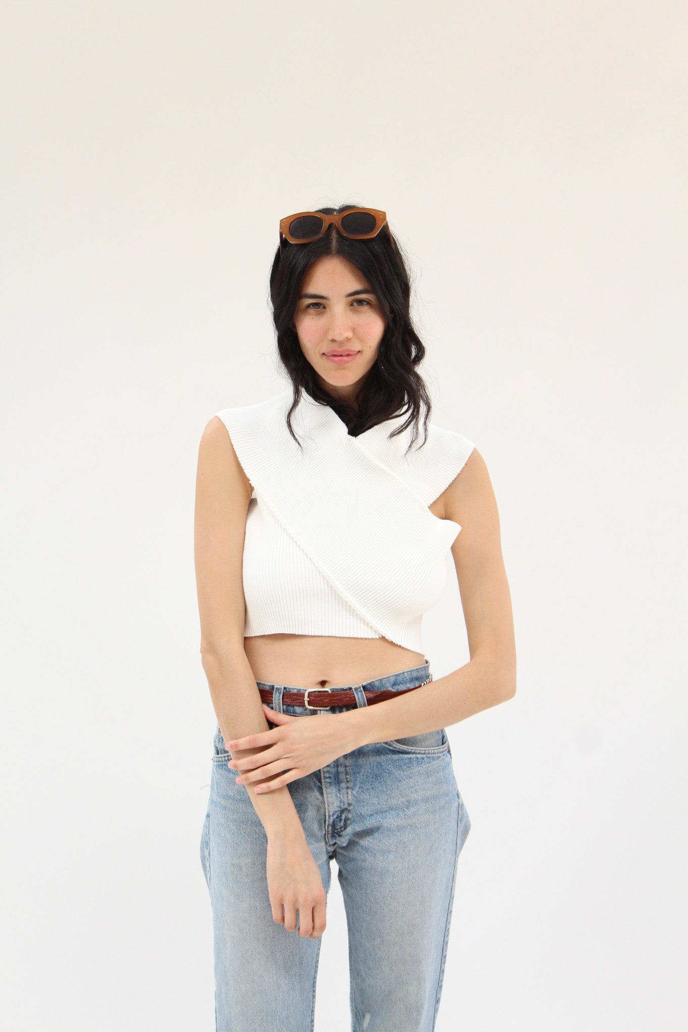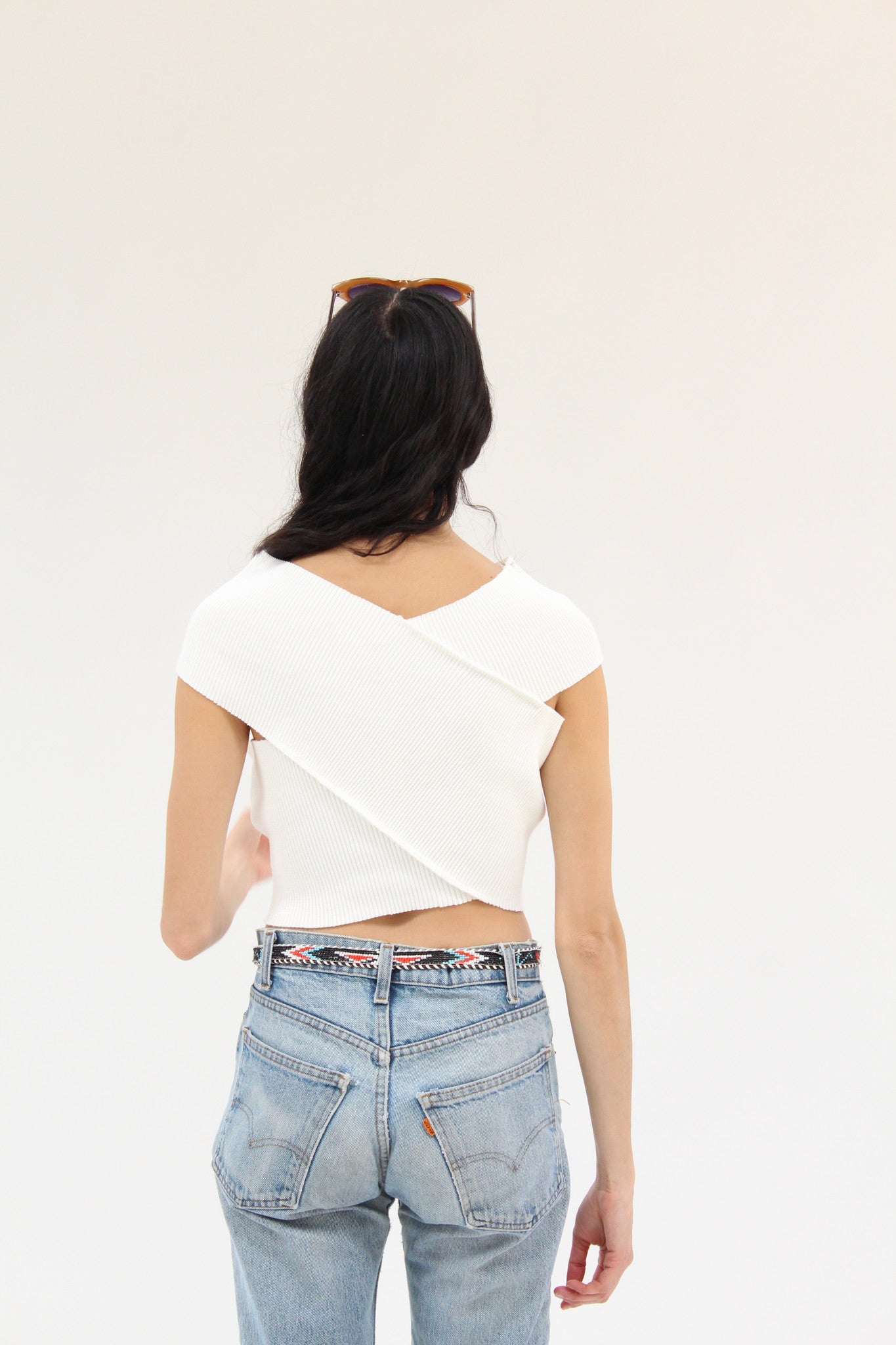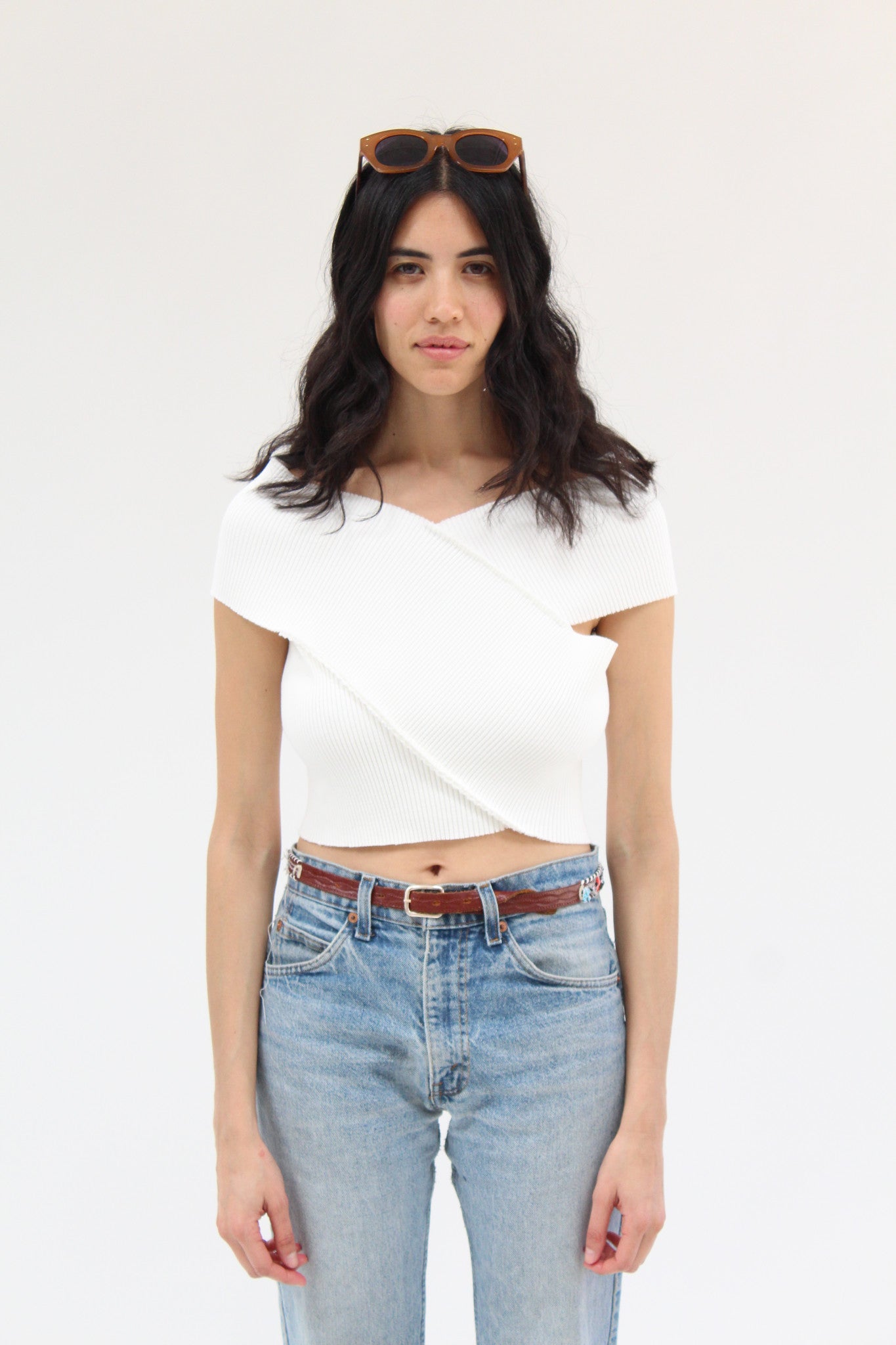 White 100% cotton rib top. Runs true, stretchy heavy knit rib. Sarah is wearing size small. Can be worn on or off the shoulders.