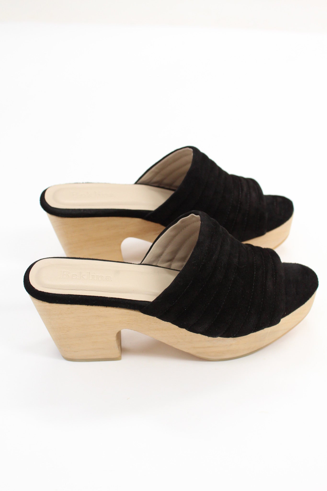 Hand carved wooden platform heel, 100% suede leather uppers and leather lined.