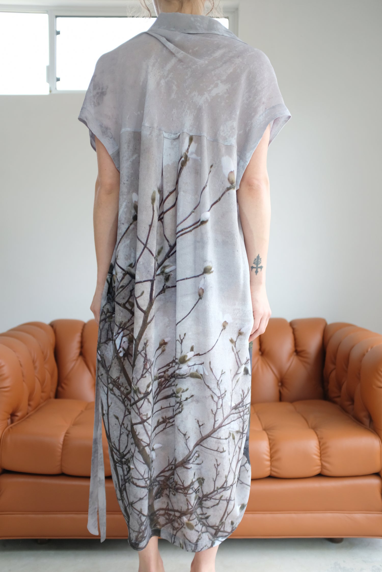 100% Silk, gorgeous print. Detachable belt, shirt collar, button down front, loose fitting, enclosed seams, two hip pockets. Wear in multiple ways. Total length 45"