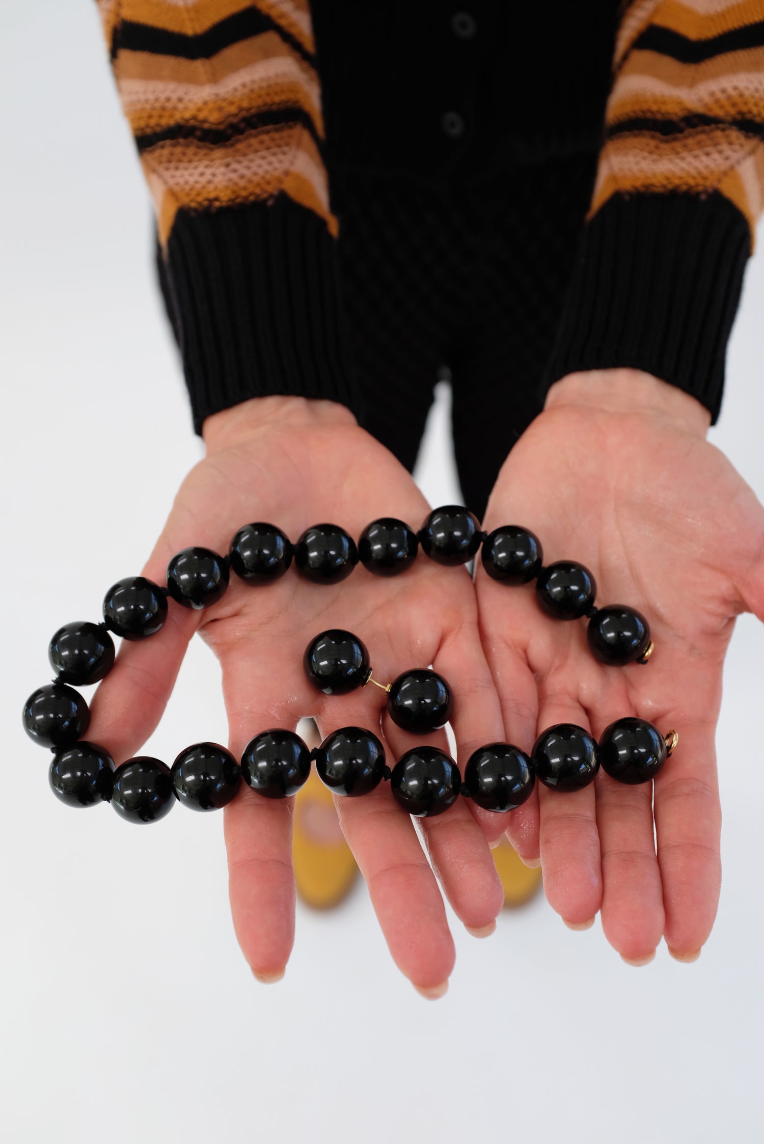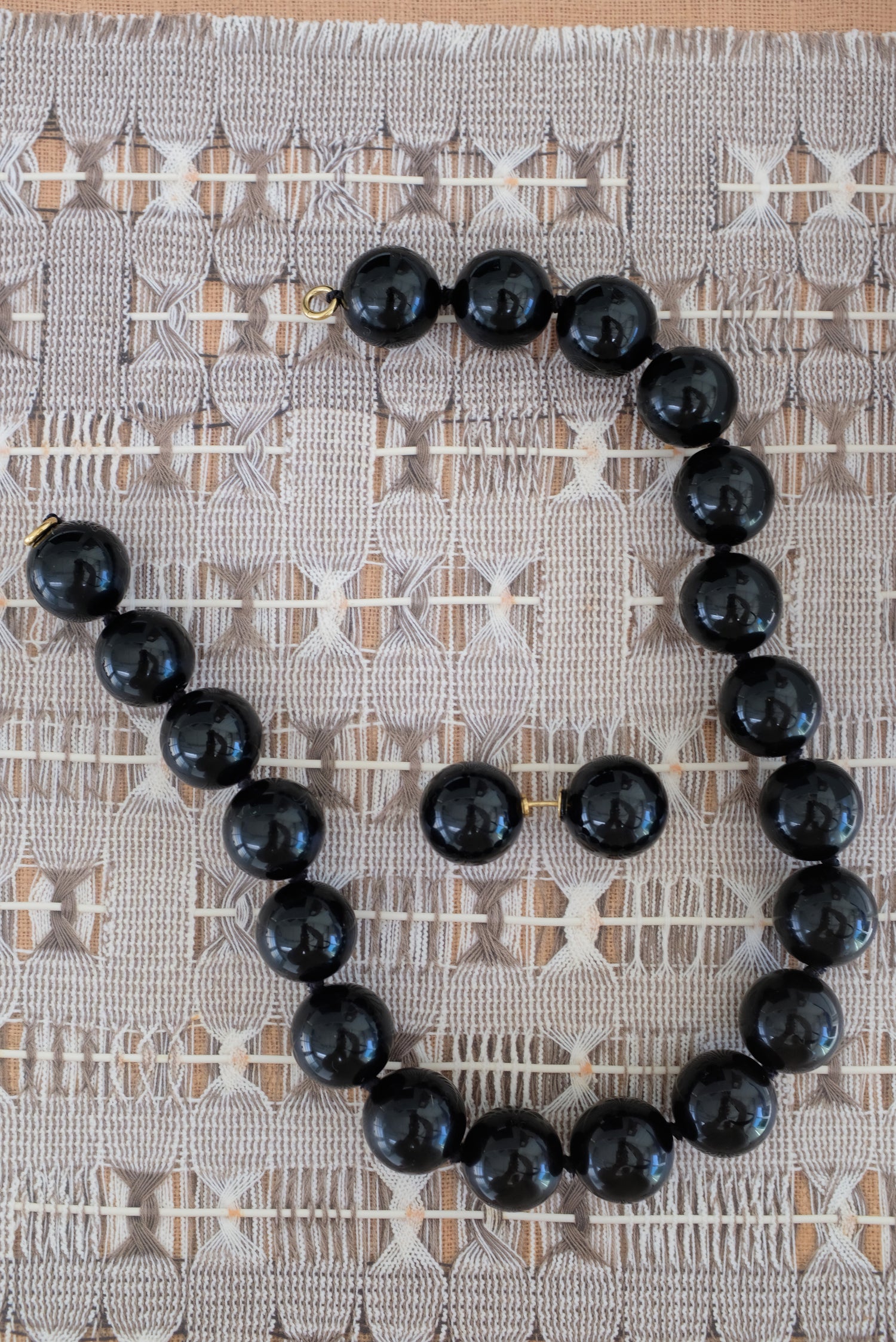 Gold plated sterling silver and 18mm onyx beads short necklace with an onyx earring piece. The earring can be used separately and it can also be used as the clasp of a chain. Aprox 18"