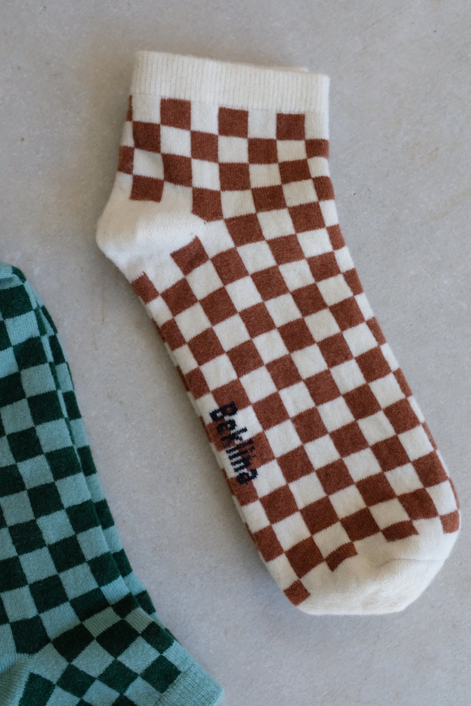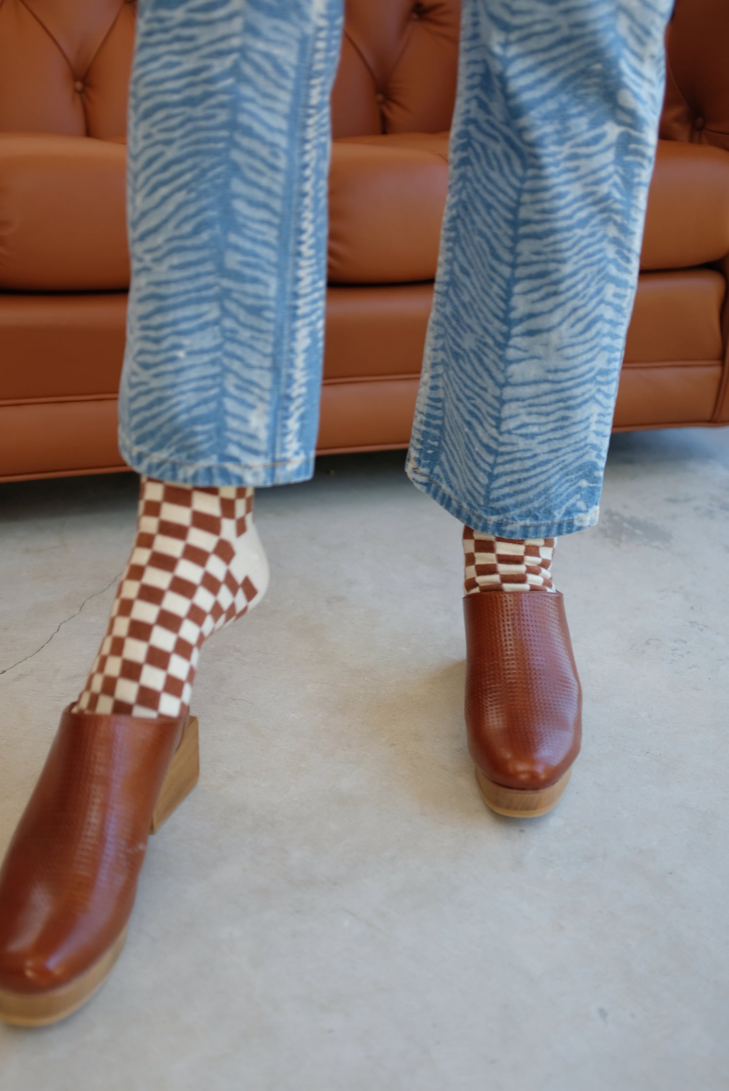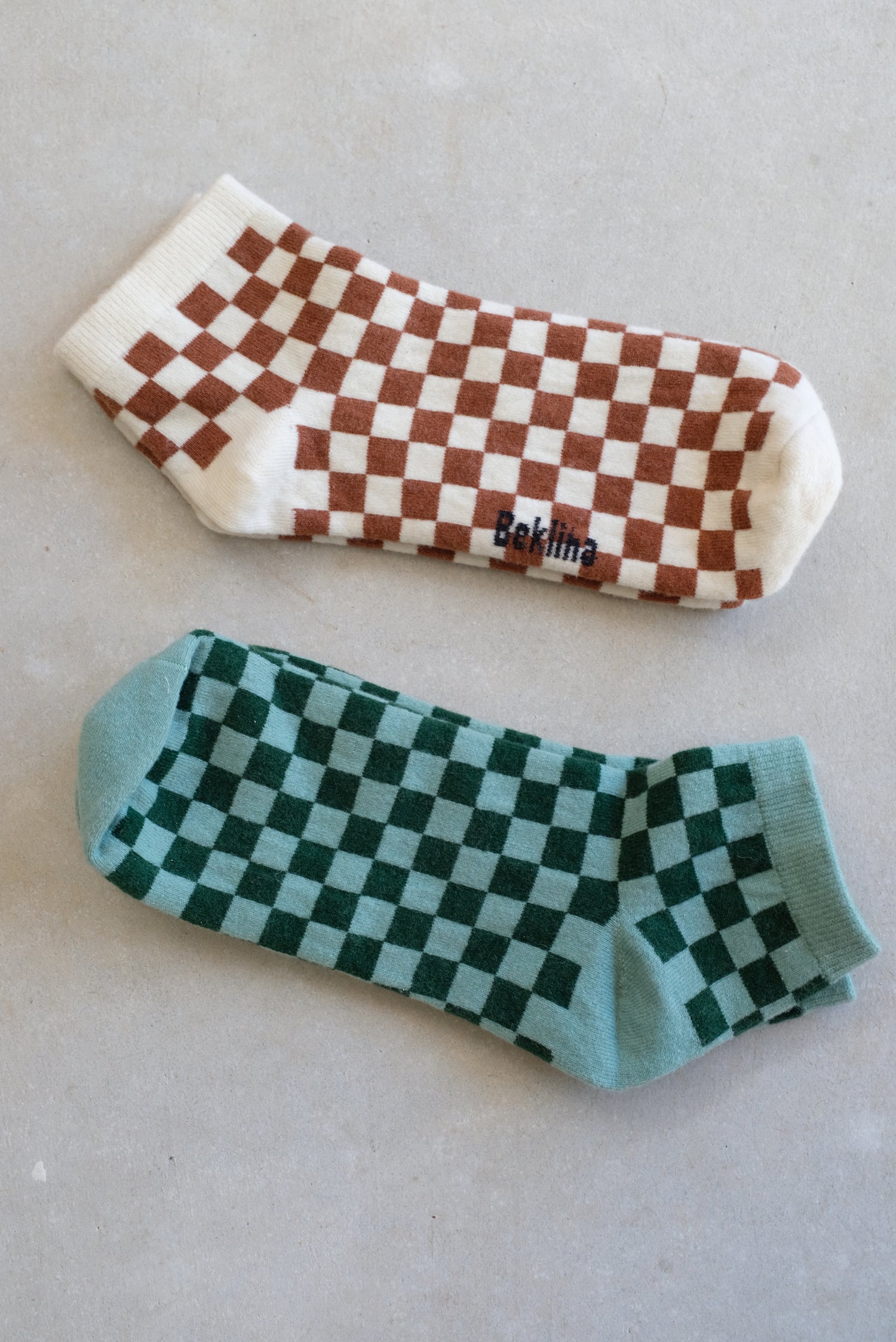 Available in 2 checkerboard color ways: cocoa/ivory, flora/fauna.