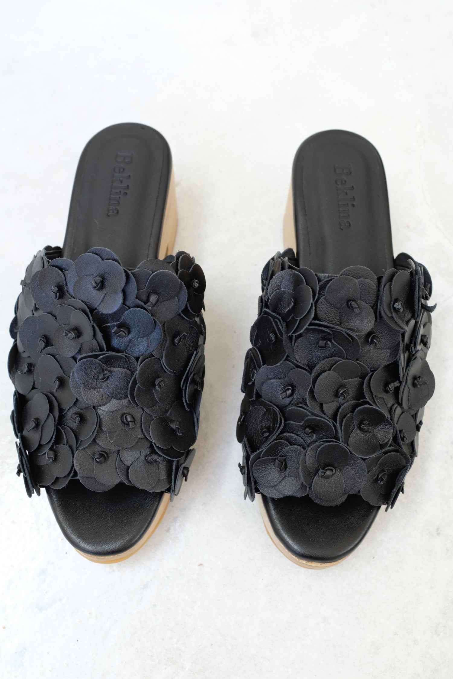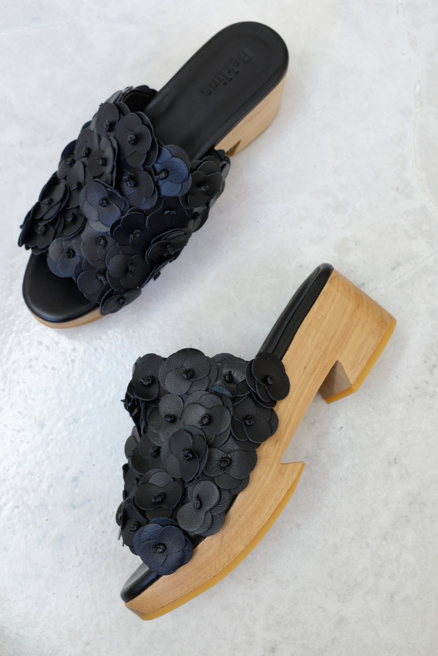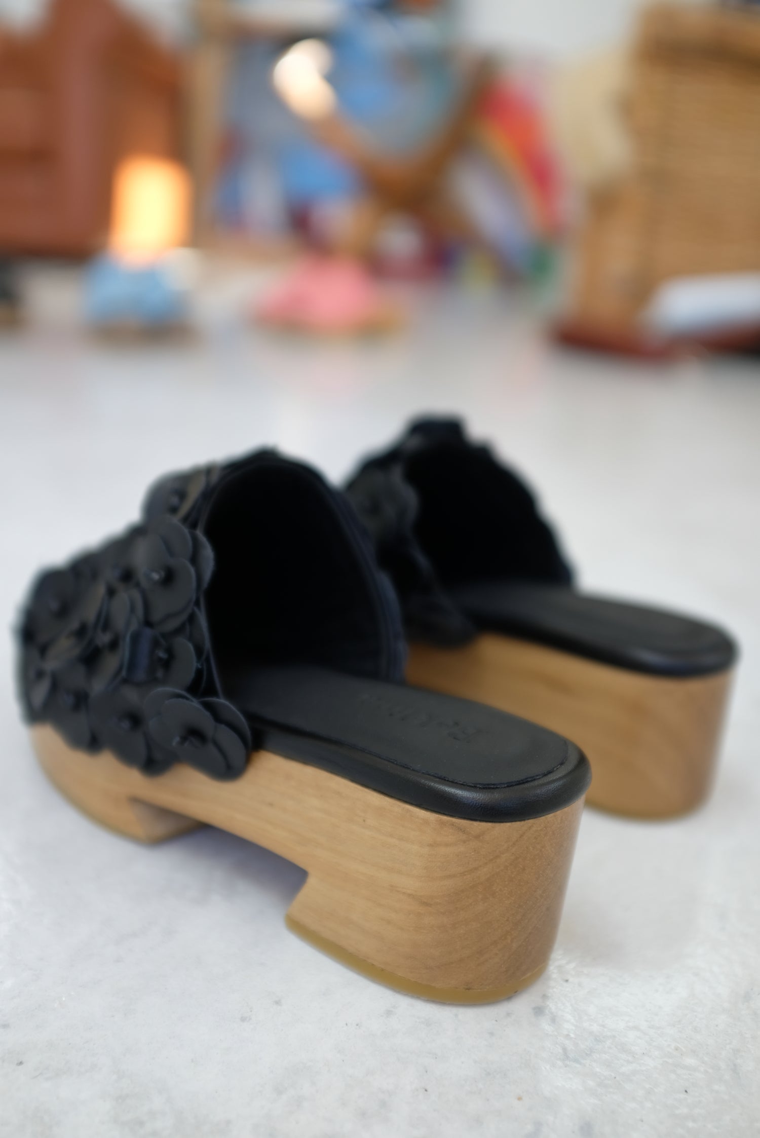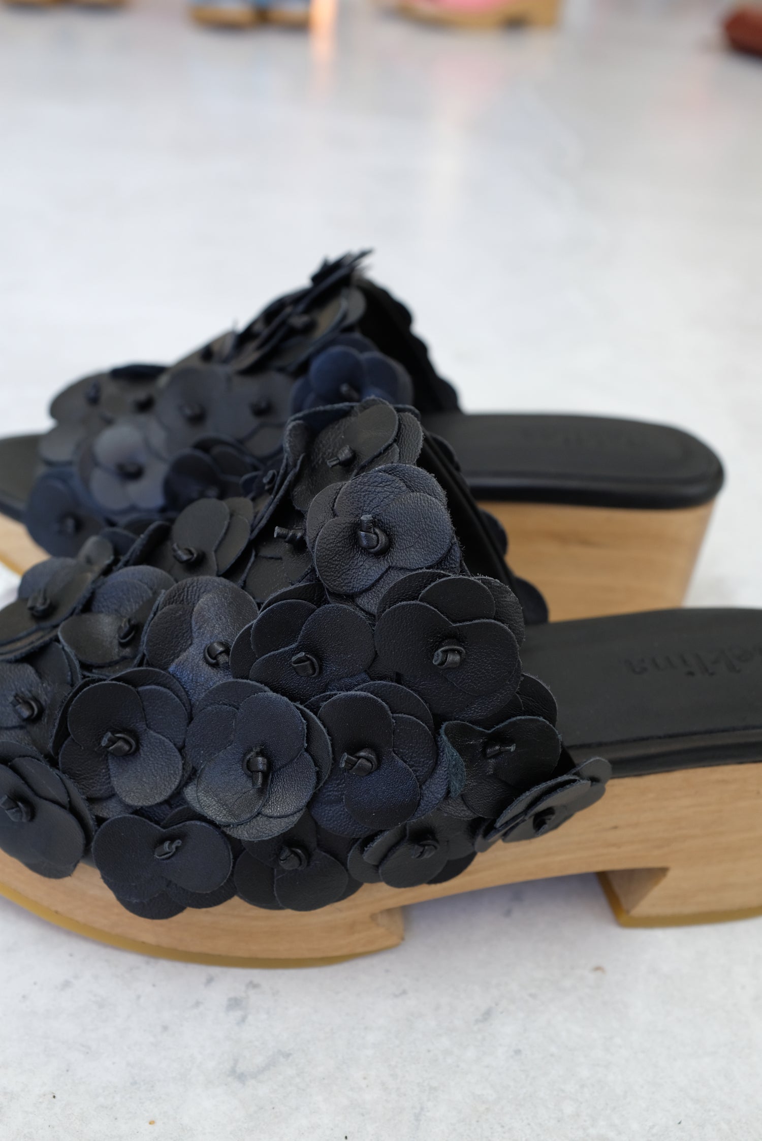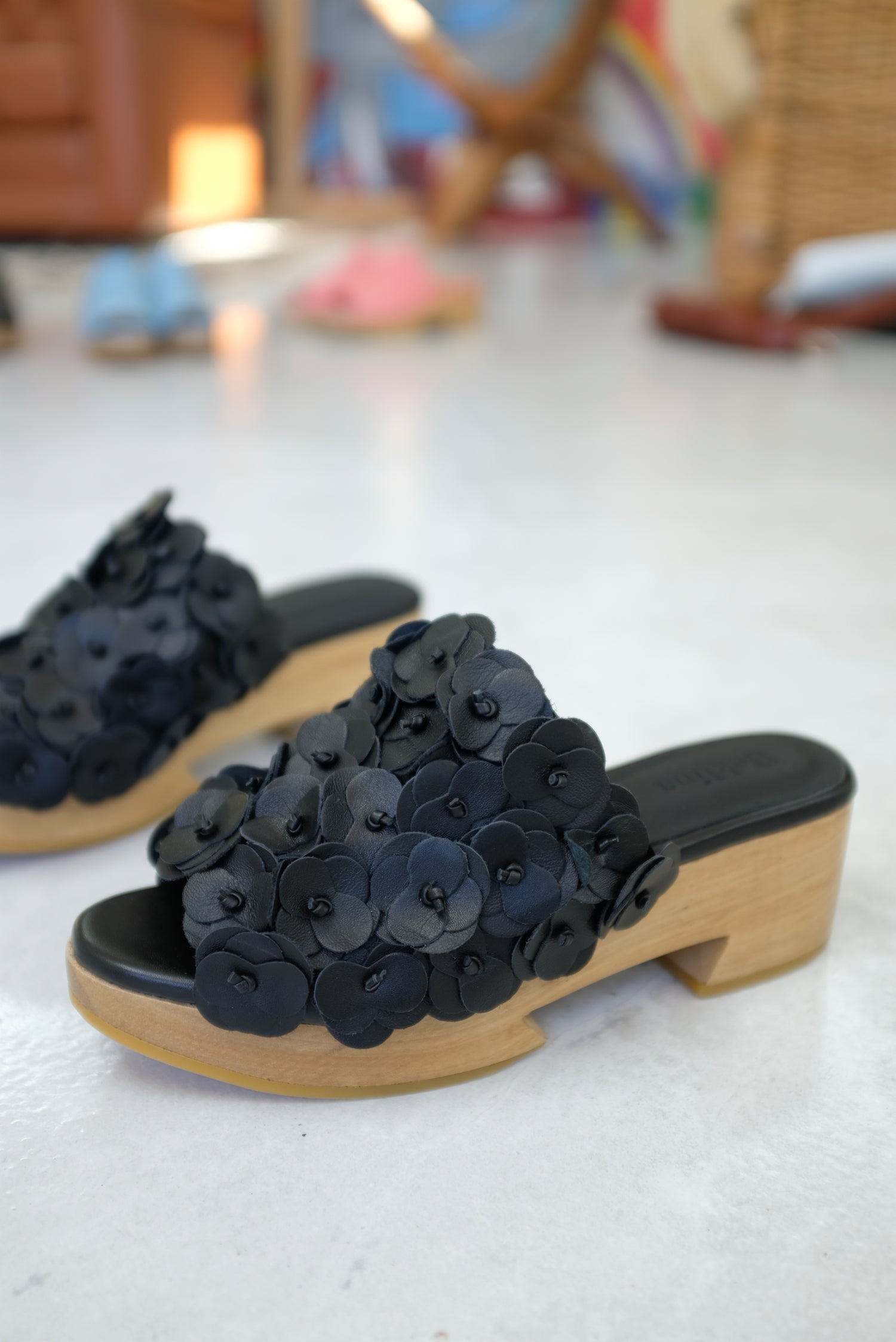 Covered in leather orange blossoms, statement clogs. Hand carved architectural clog heel with cut out detail. Lower heel than our classic ribbed clog, also extremely comfortable. Soft leather. 2" heel height. 100% Leather.