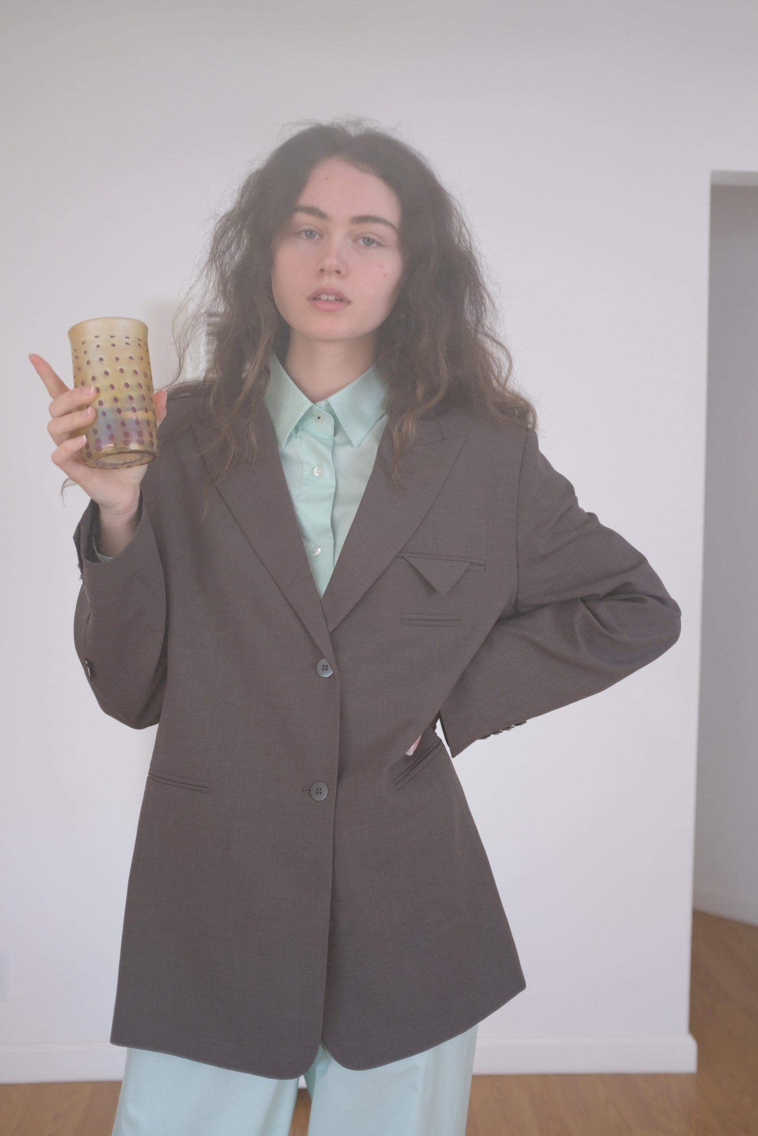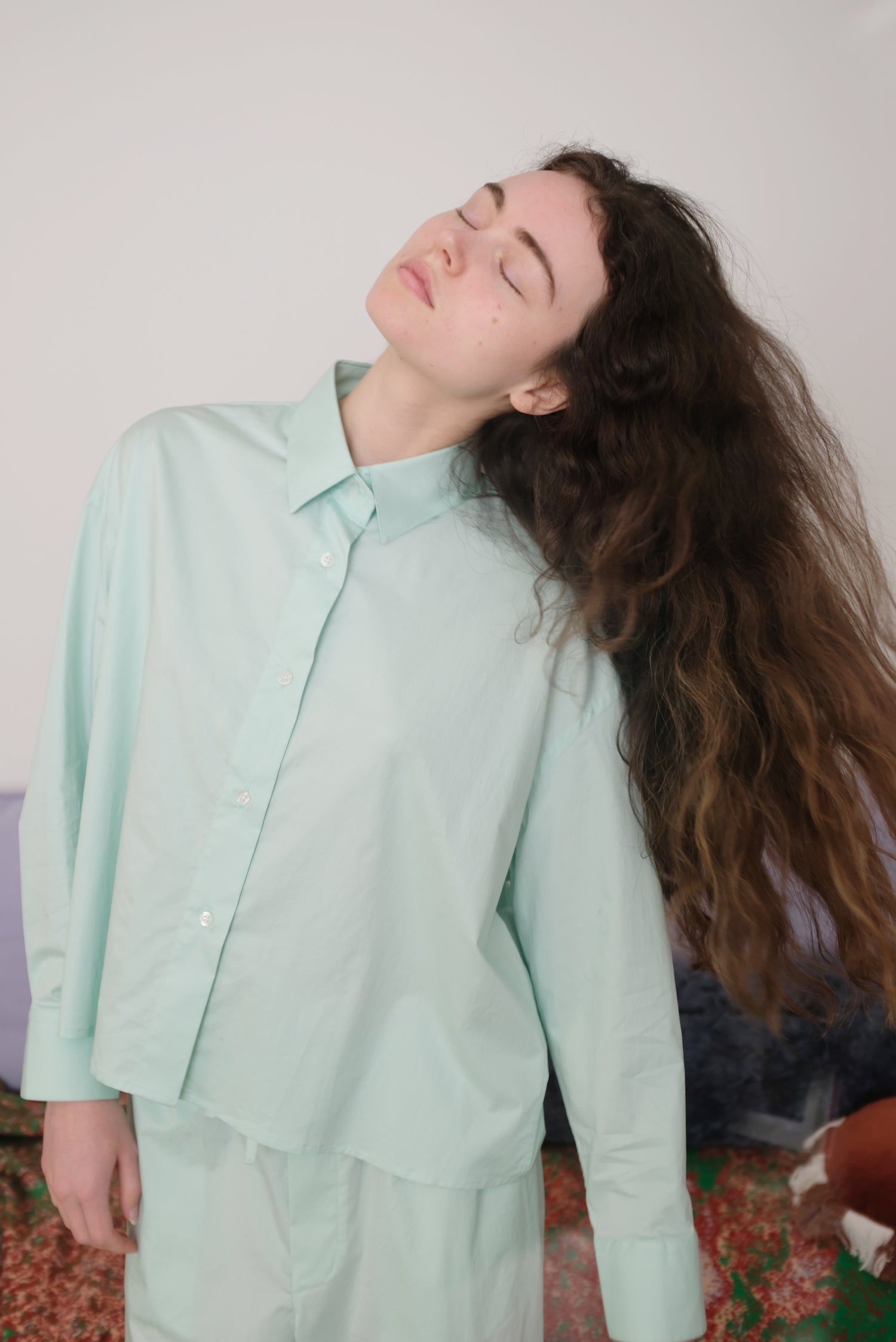 Timeless shirt in a special color designed with classic and light overisze fit. Details include long sleeves, pointed collar and two pleats in the back to add volume. It has a different finish due to the buttons on the cuffs and collar with contrasting stitching.