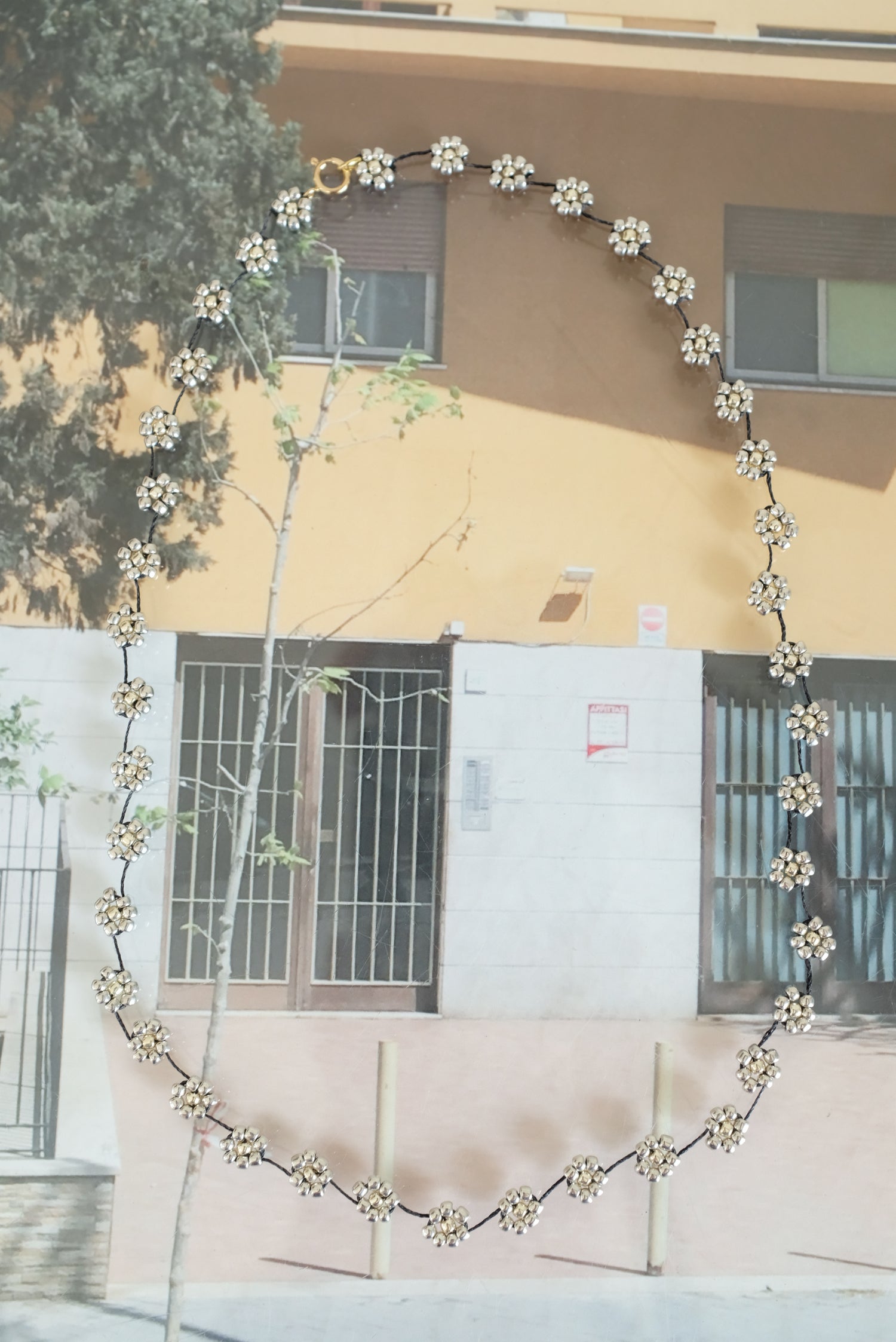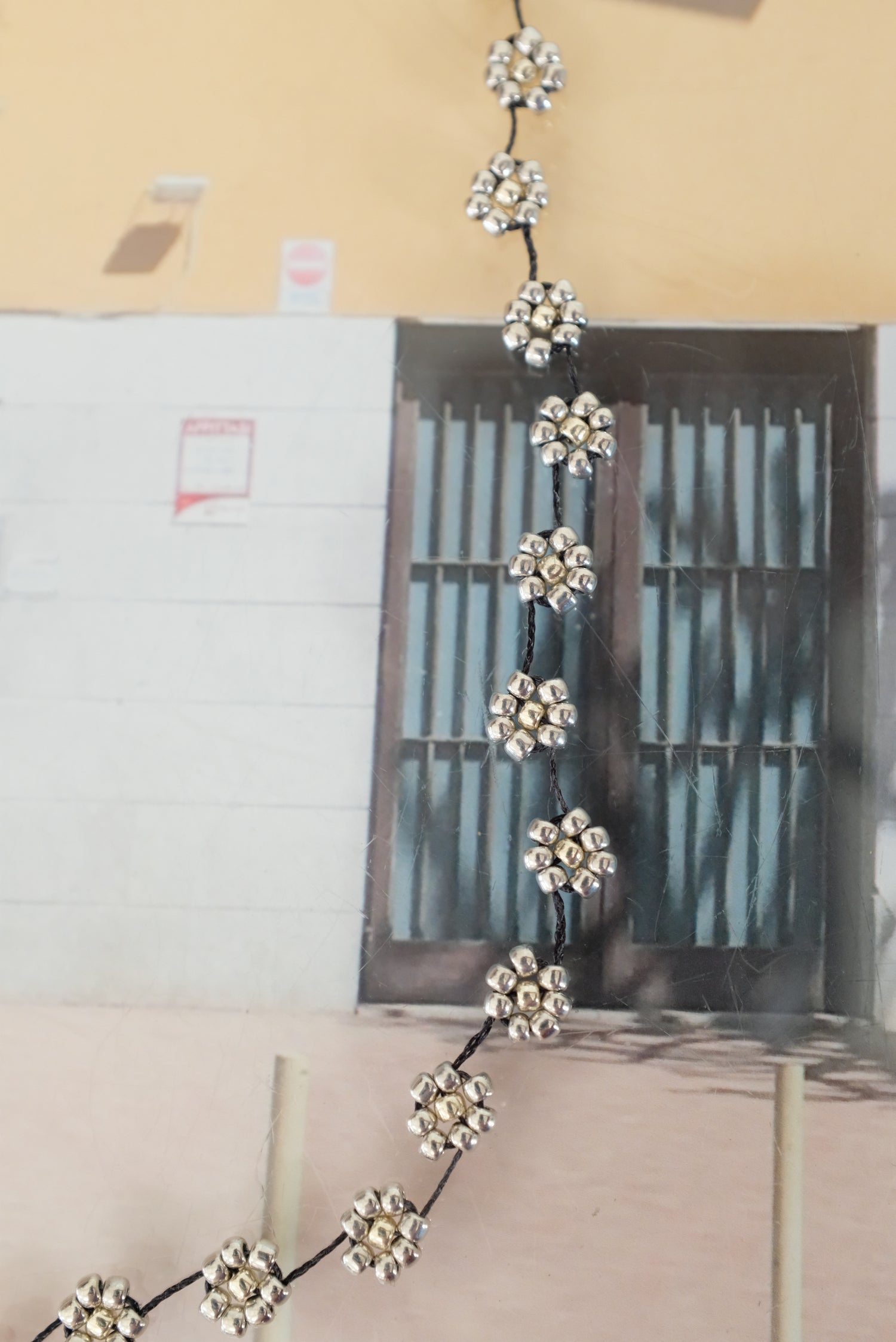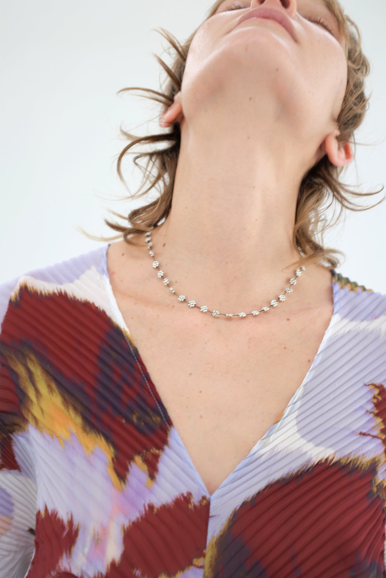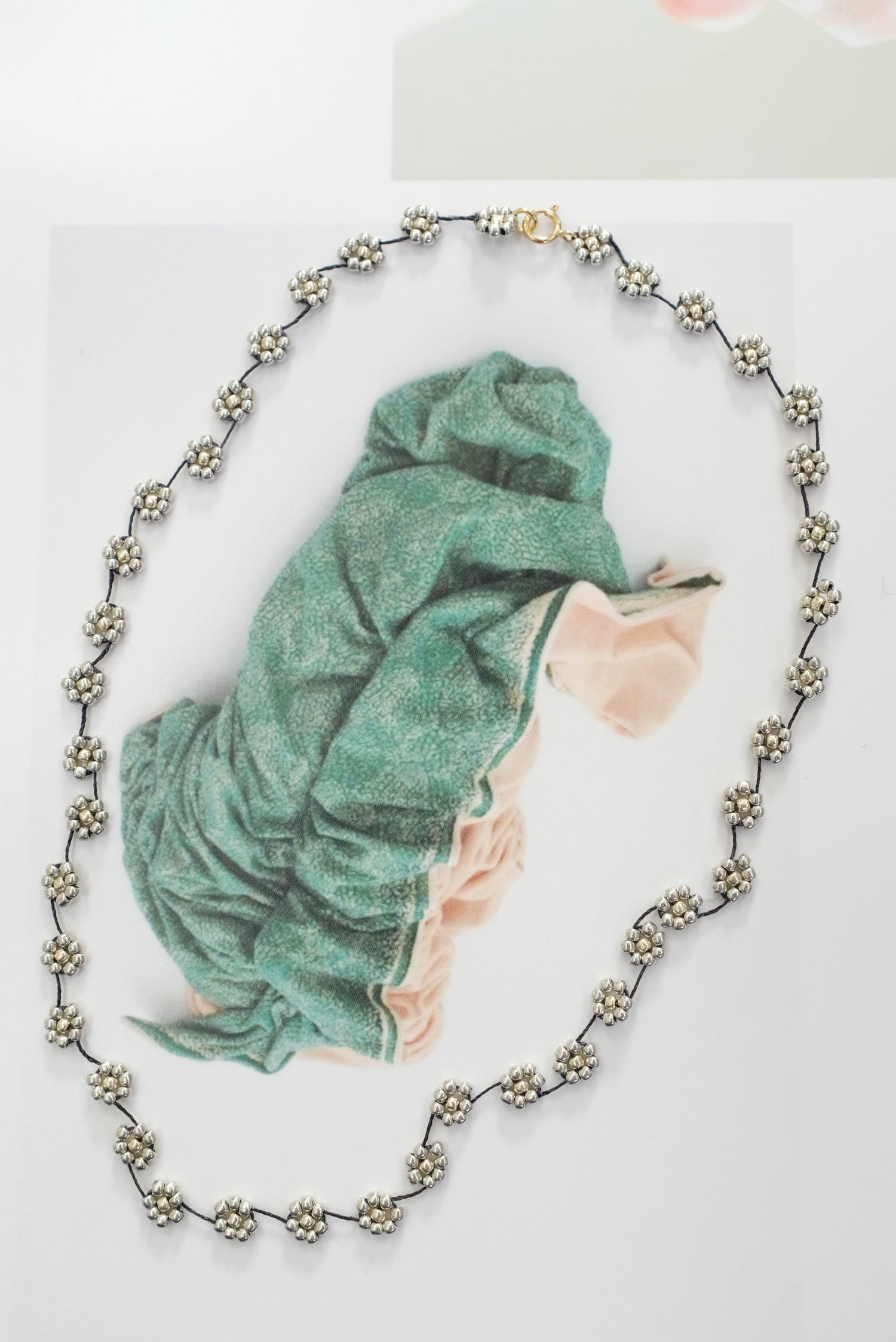 Silver beads hand strung in flower pattern, strong nylon thread, finished with silver filled lock. Aprox length is 17”.