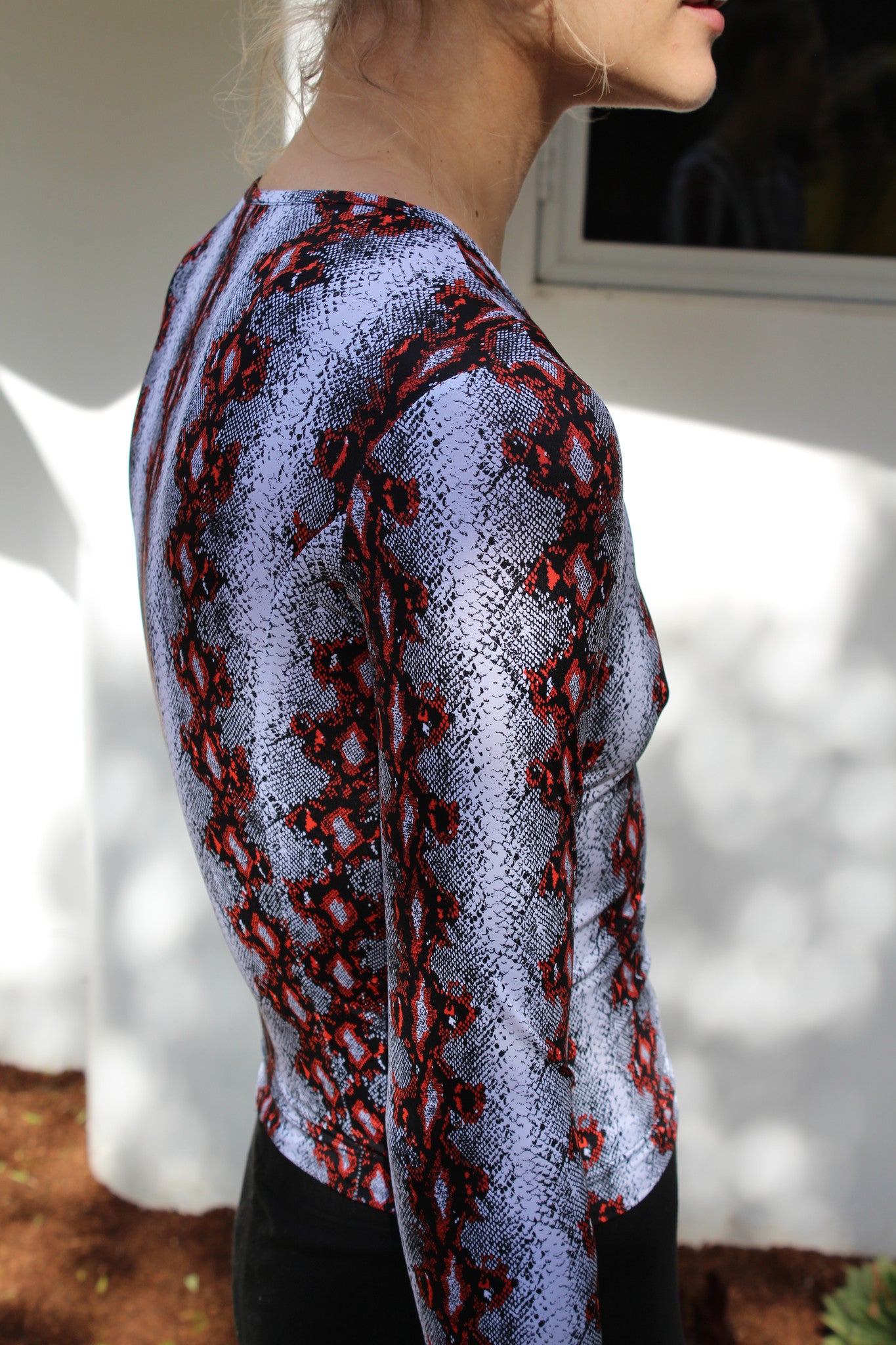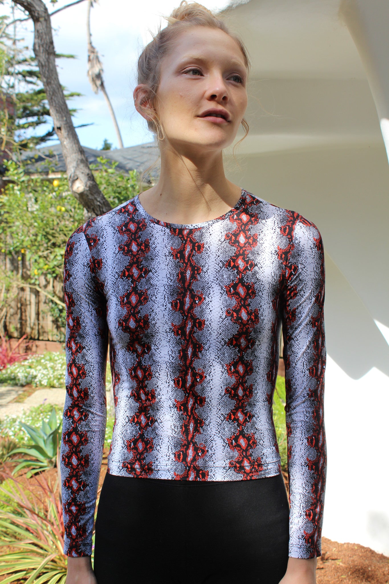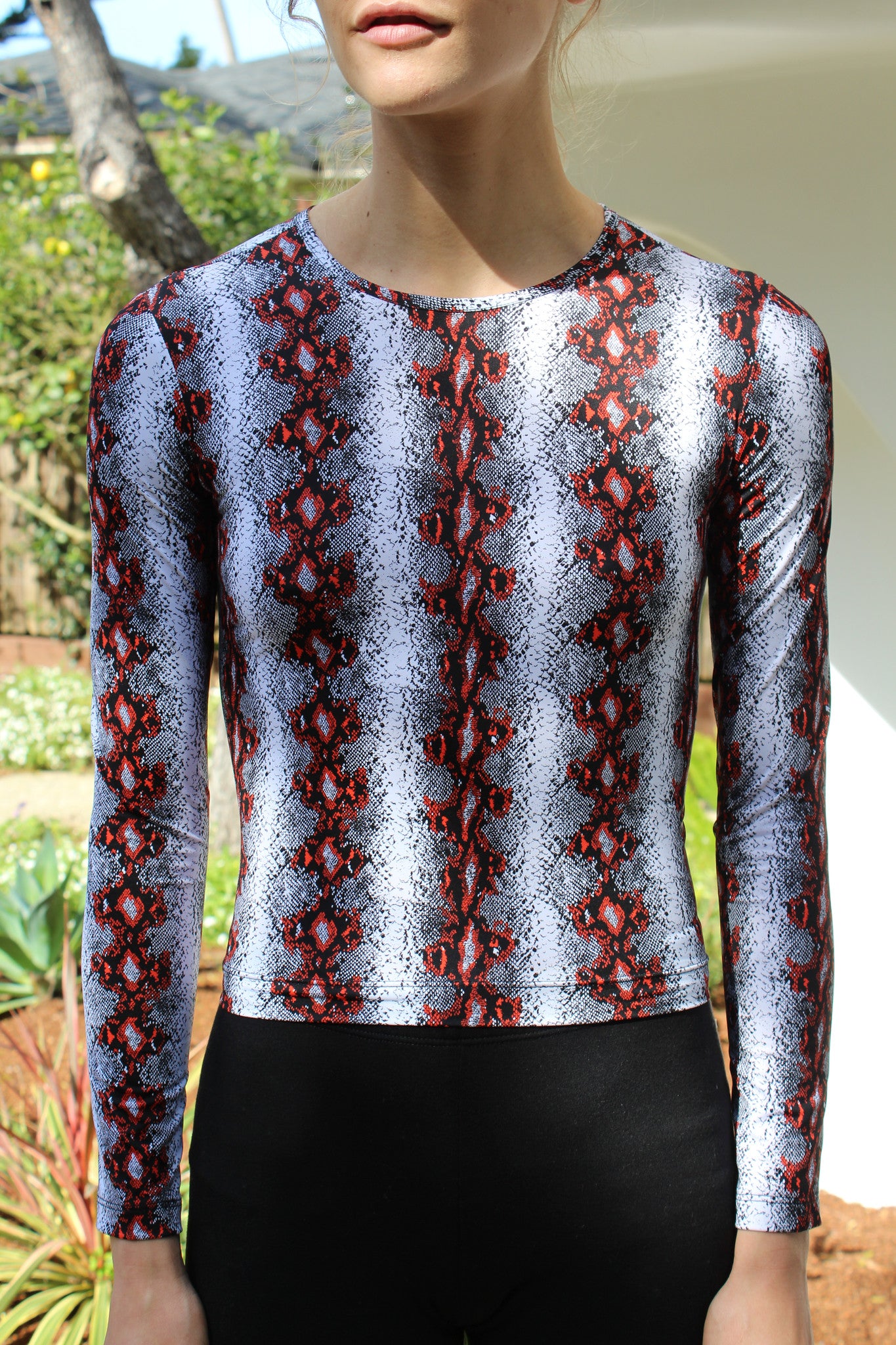 Long sleeve rash guard in Diamond back print, crew neck. 80% Nylon, 20% Elsatane. Runs fitted and runs true to size.