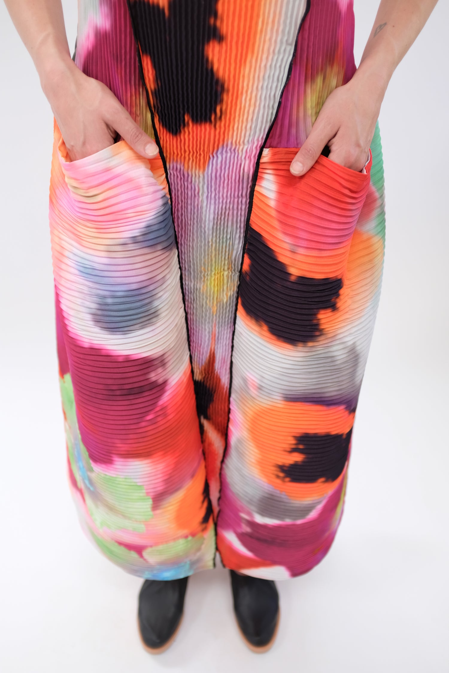 Beautiful hand made dress. Very limited edition. Hand pleated using arashi shibori technique. Pattern placement, pleating and measurements vary as each dress is handmade individually. Round neckline, seam detailing, two front pockets, shoulder pads for structure. One size fits most. 100% PES Chiffon.