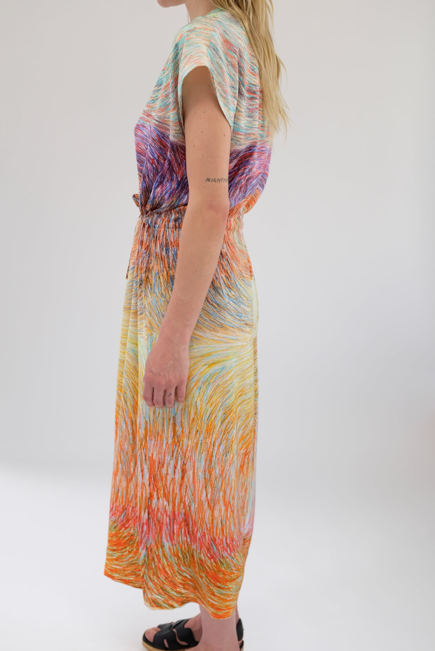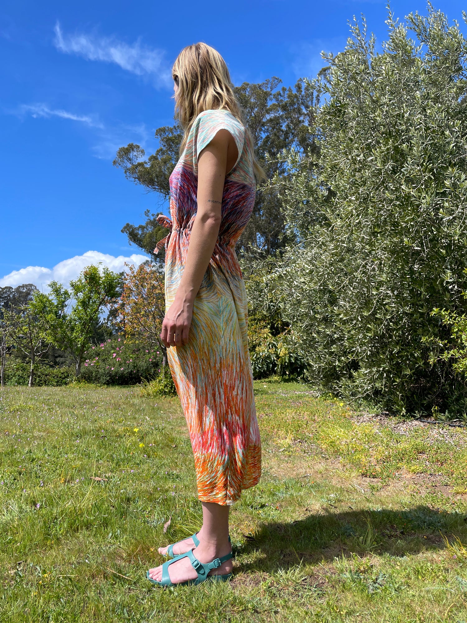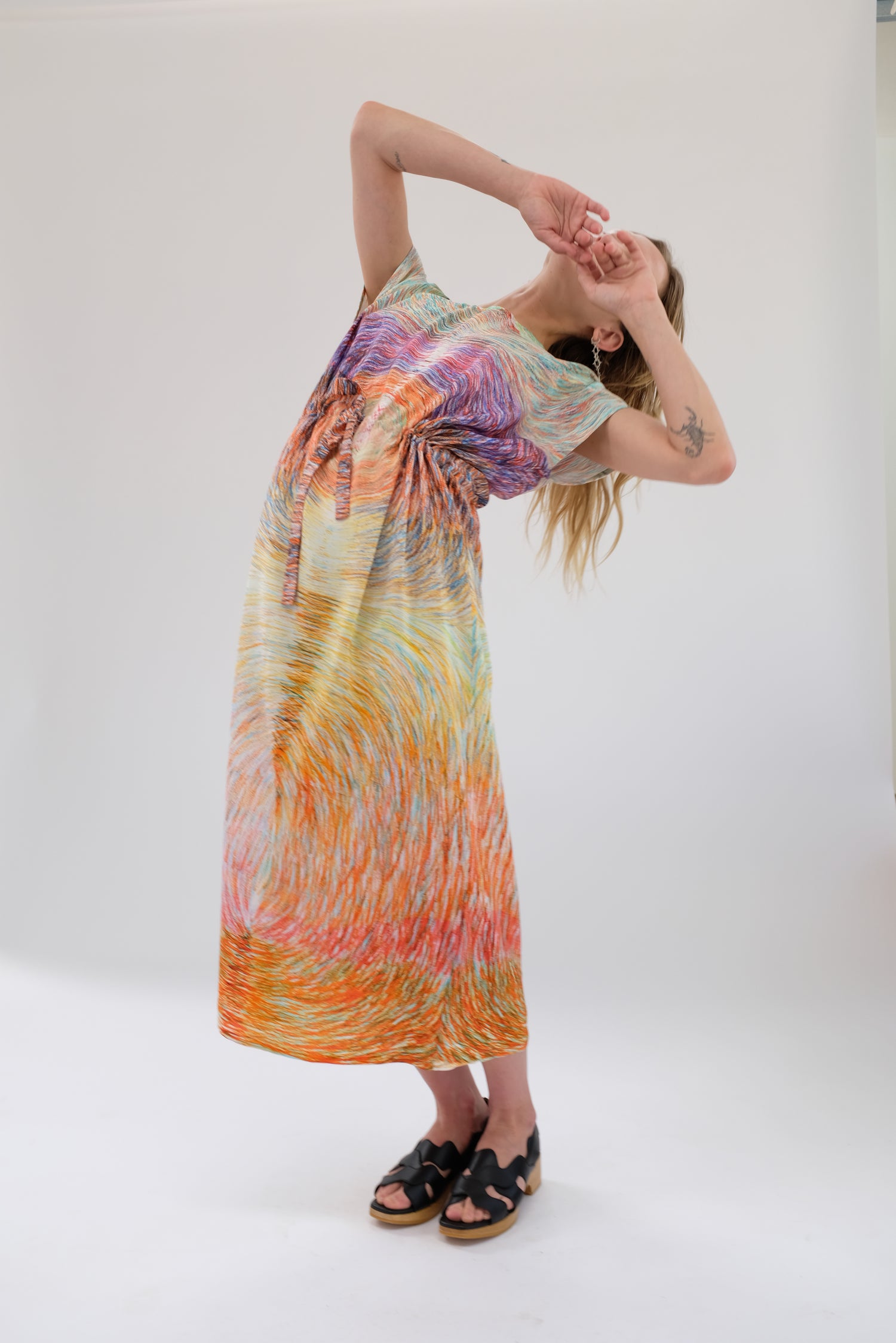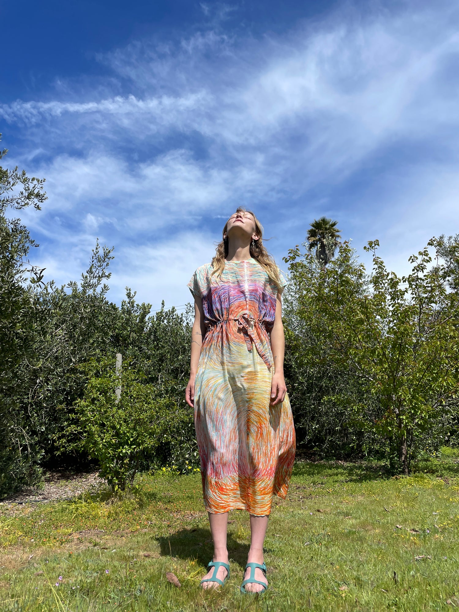 Luxurious silk dress, gorgeous colorfully patterned, one size fits most. Adjustable drawstring waist, cap sleeve, loose fitting, enclosed seams, hidden back zipper. 100% Silk. Can be worn loose or fitted.