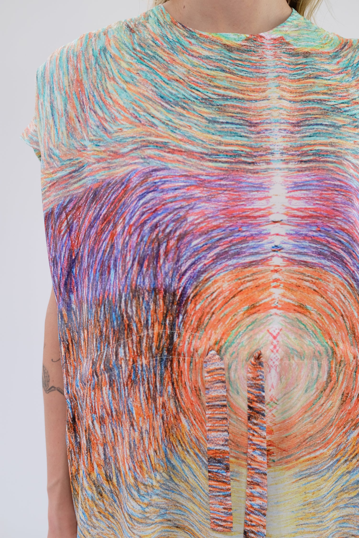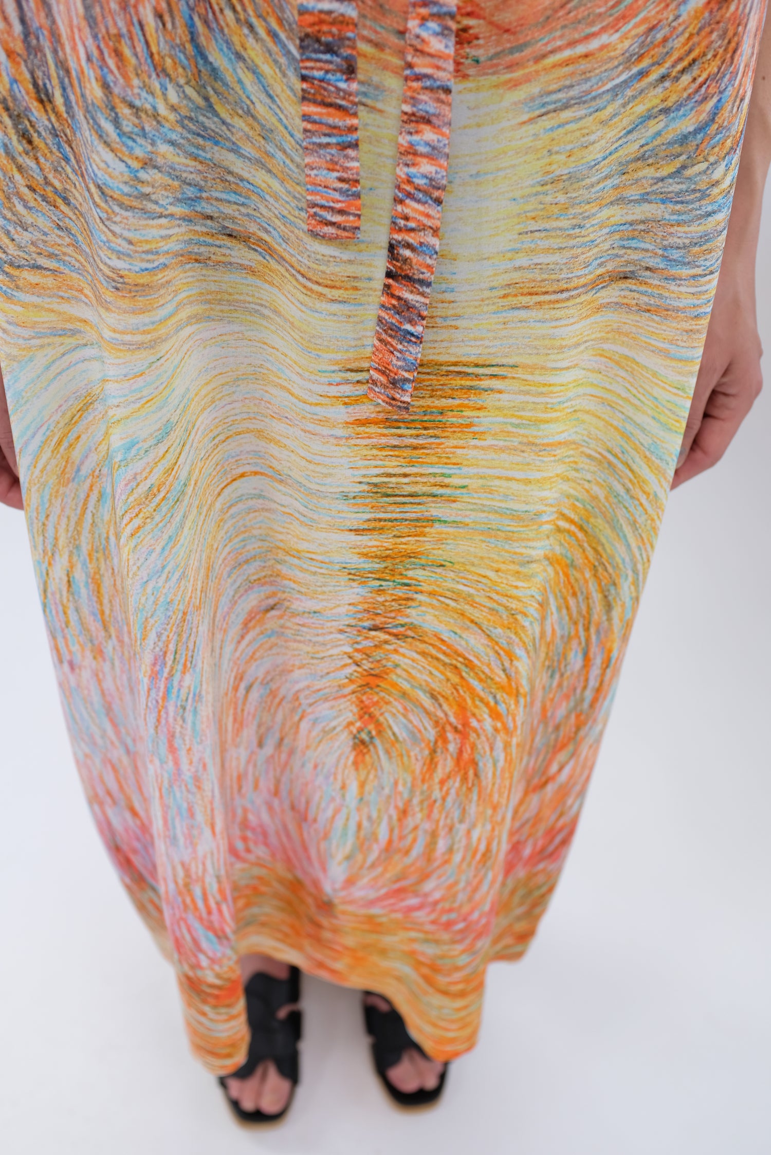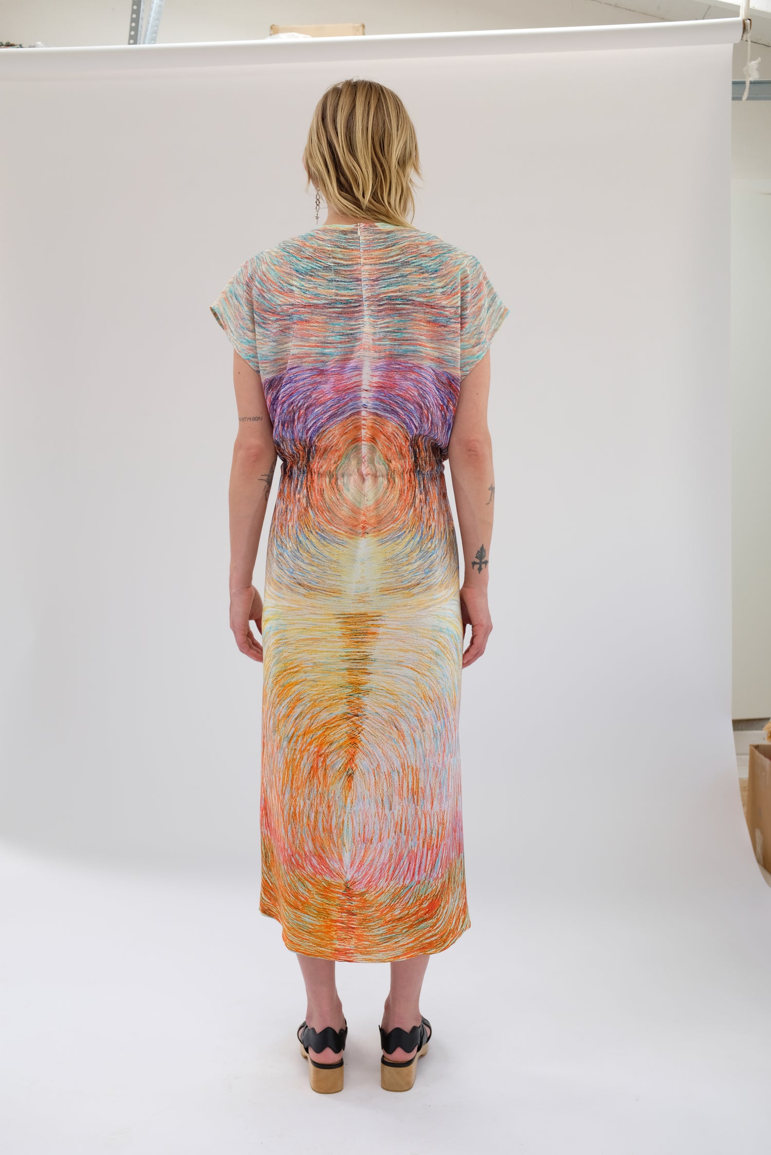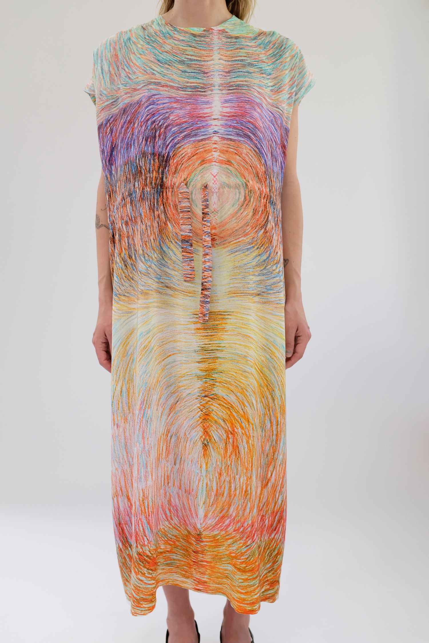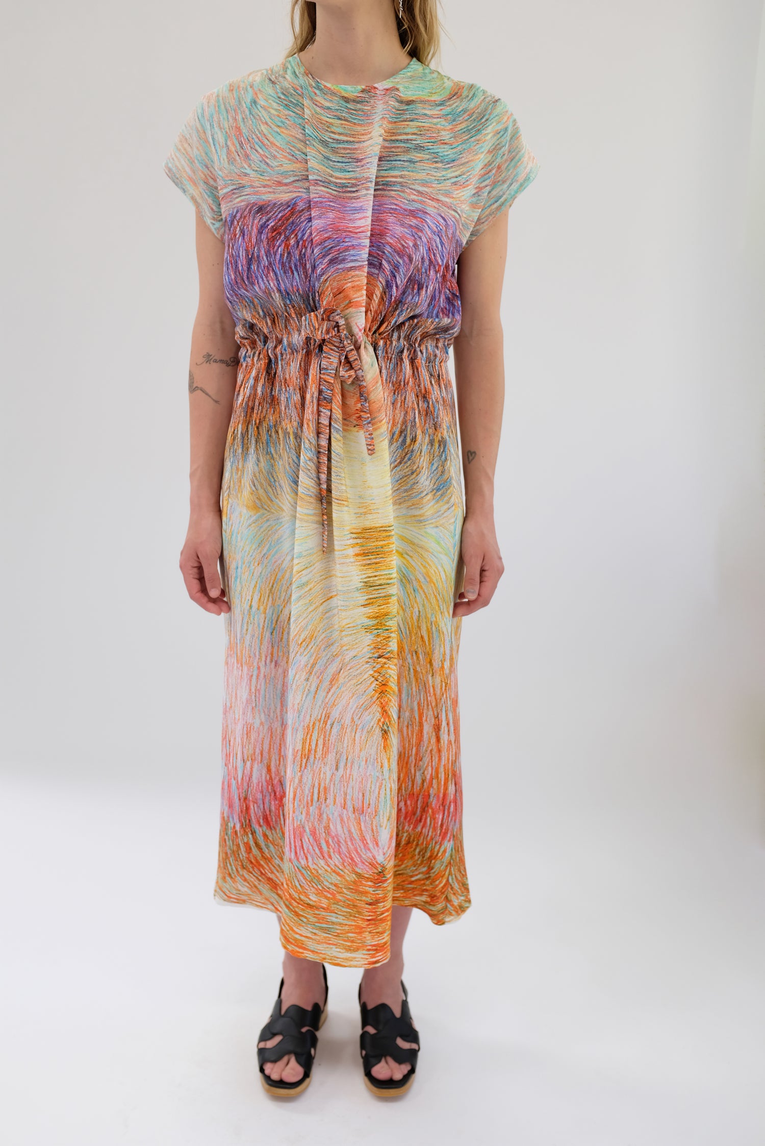 Luxurious silk dress, gorgeous colorfully patterned, one size fits most. Adjustable drawstring waist, cap sleeve, loose fitting, enclosed seams, hidden back zipper. 100% Silk. Can be worn loose or fitted.