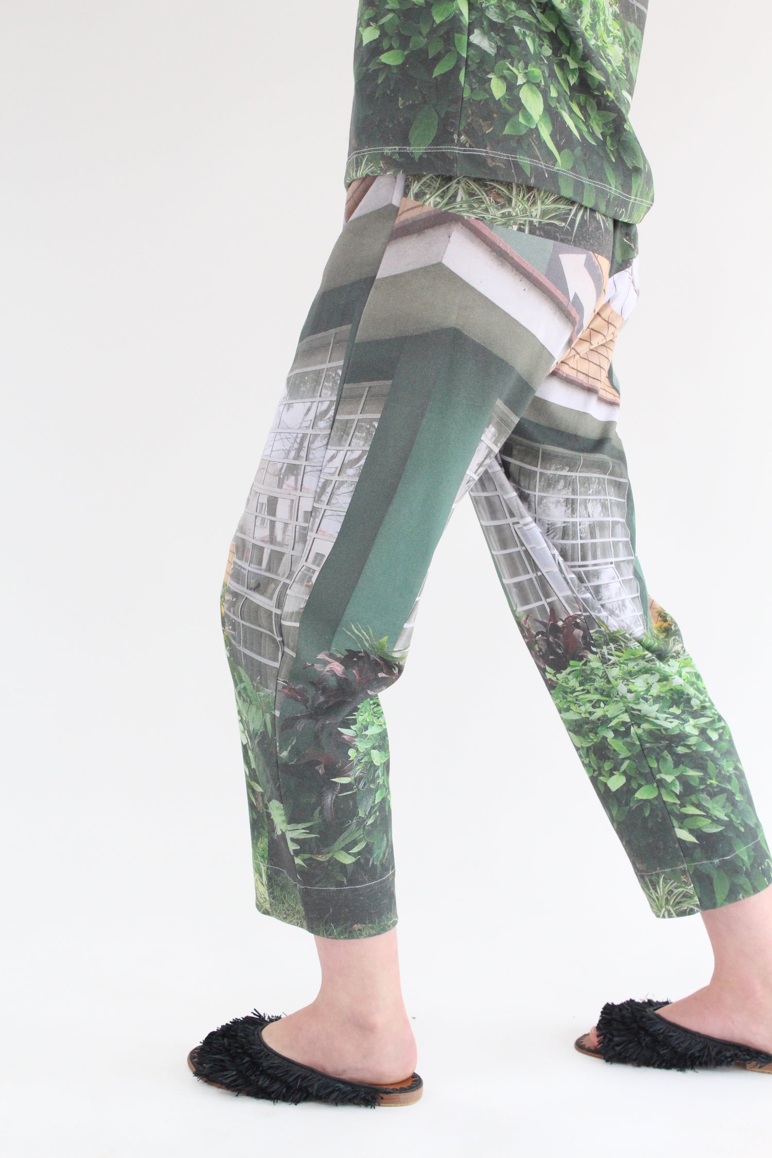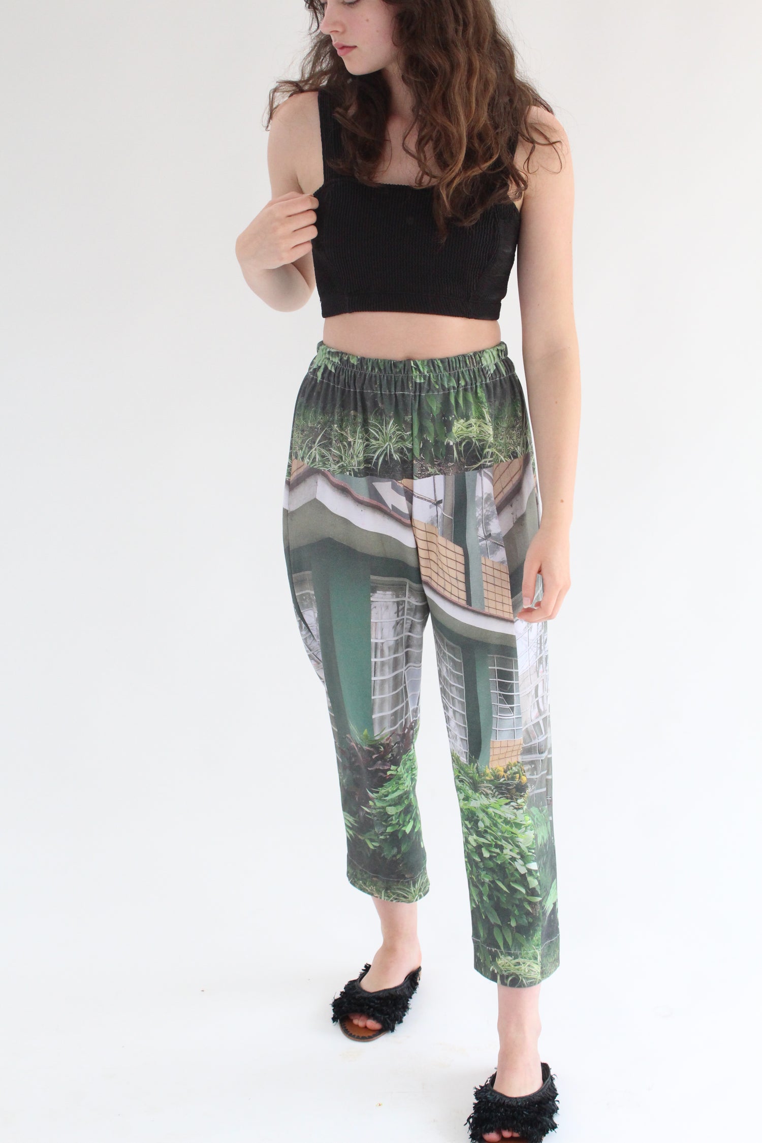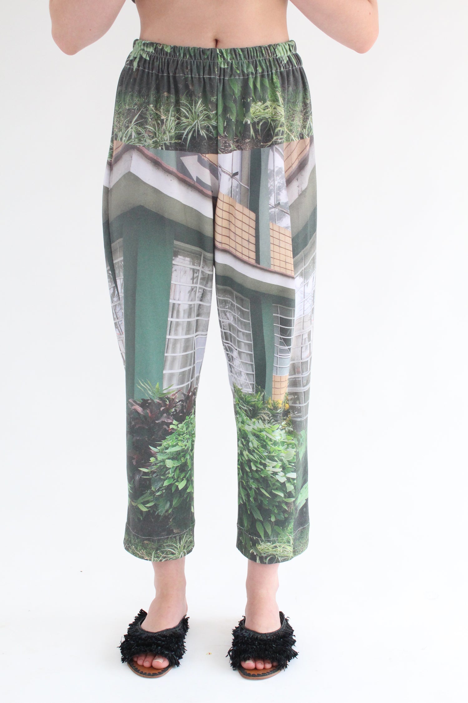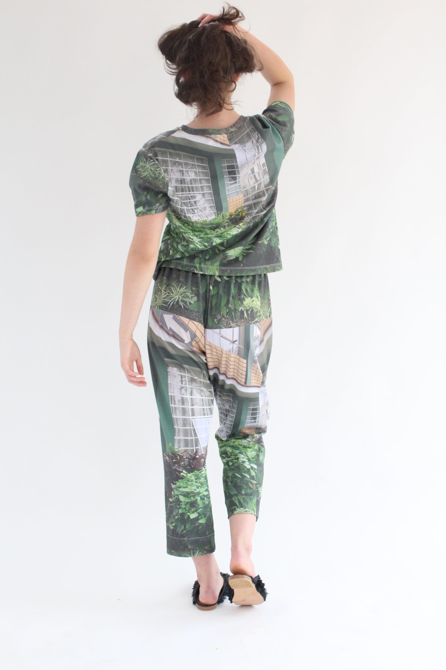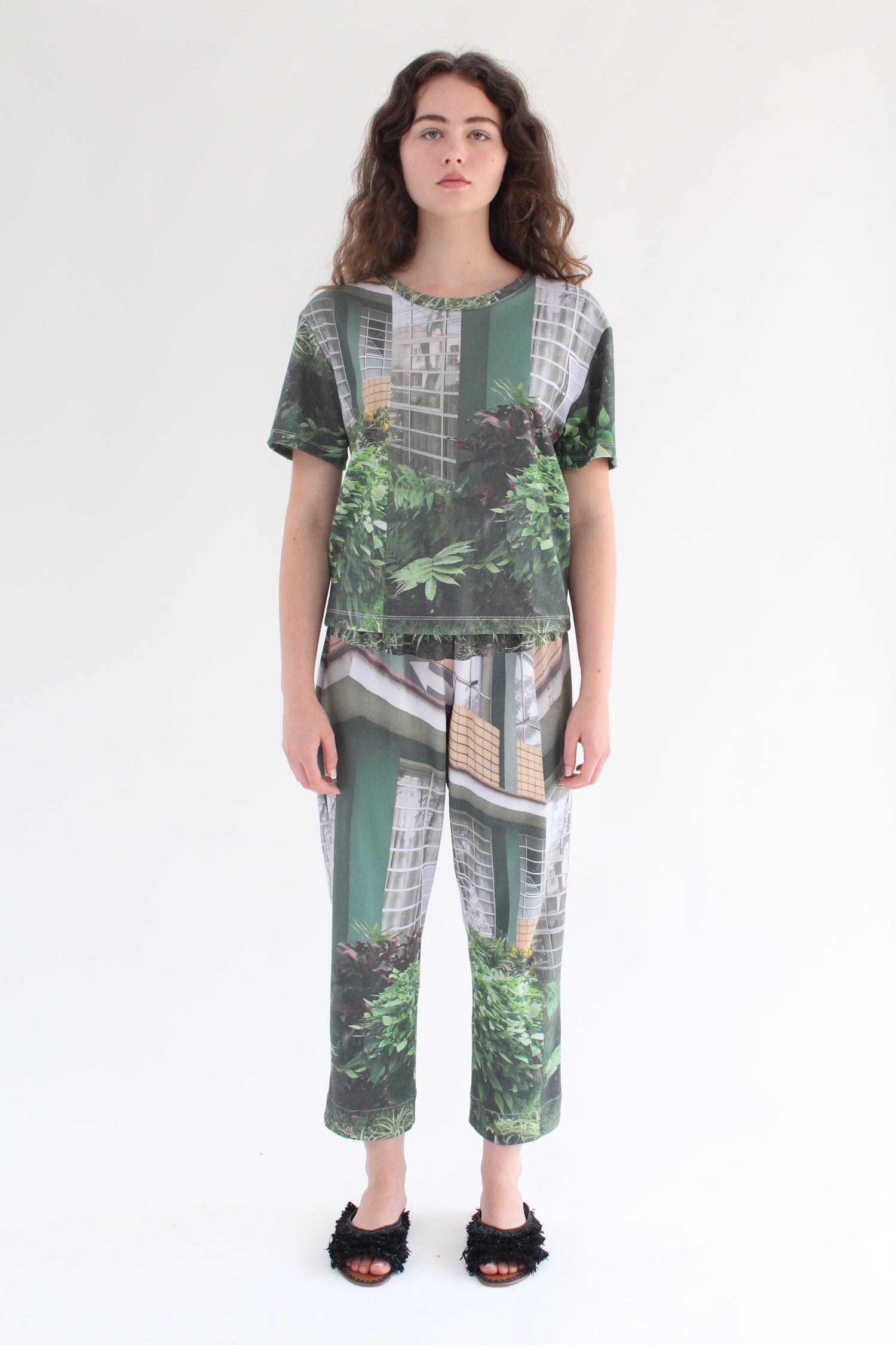 100% Organic cotton jersey, limited edition Lima Building print 2020. Slightly cropped, to be worn at true waist, loose drape fit. Model is wearing a small/medium. Total length form waist to hem is 36.5".
