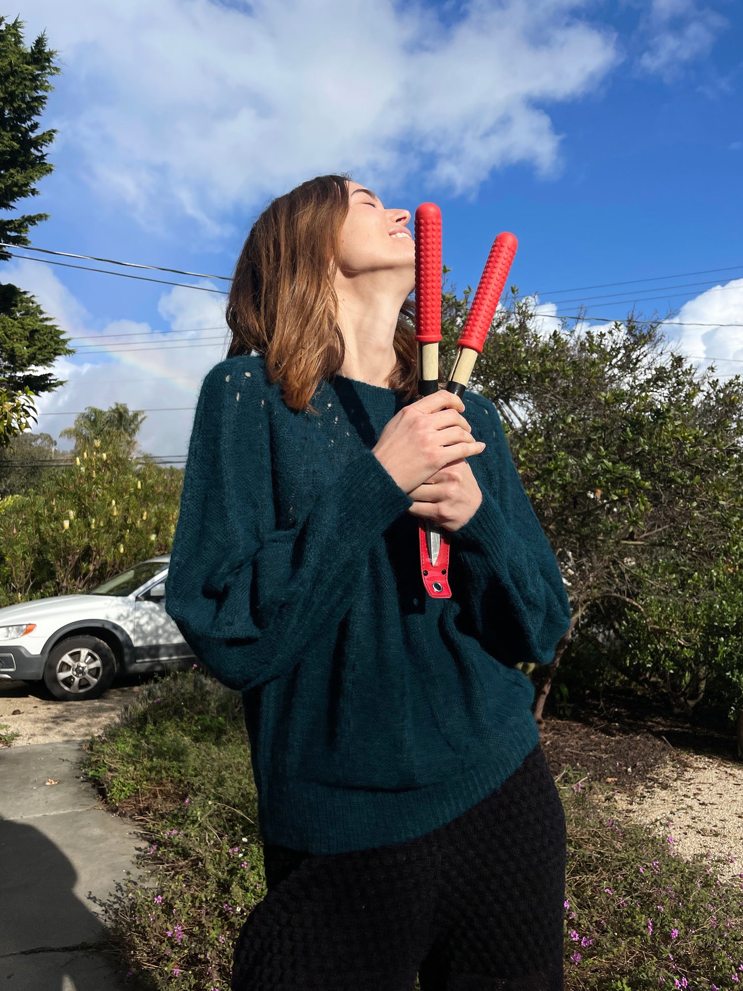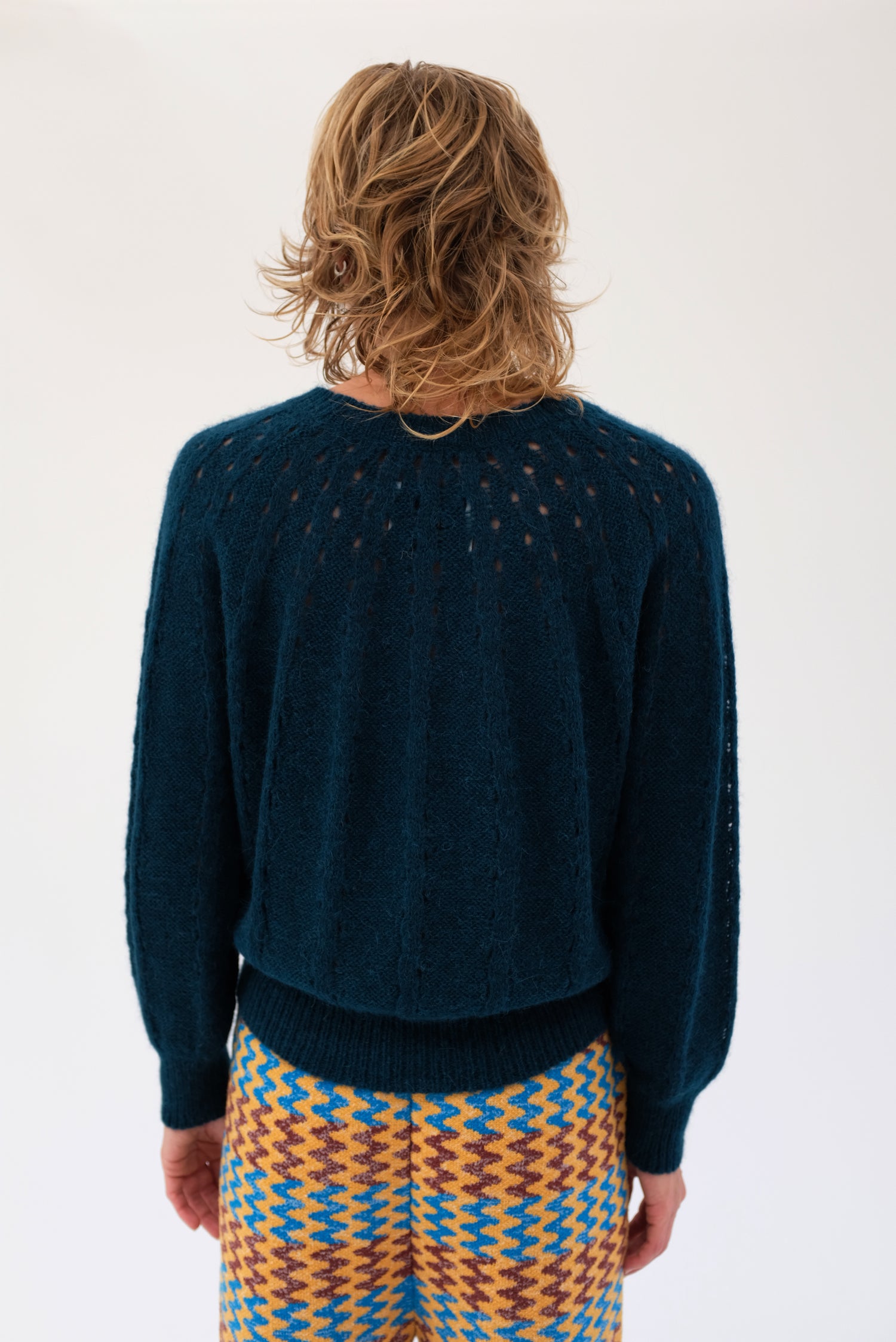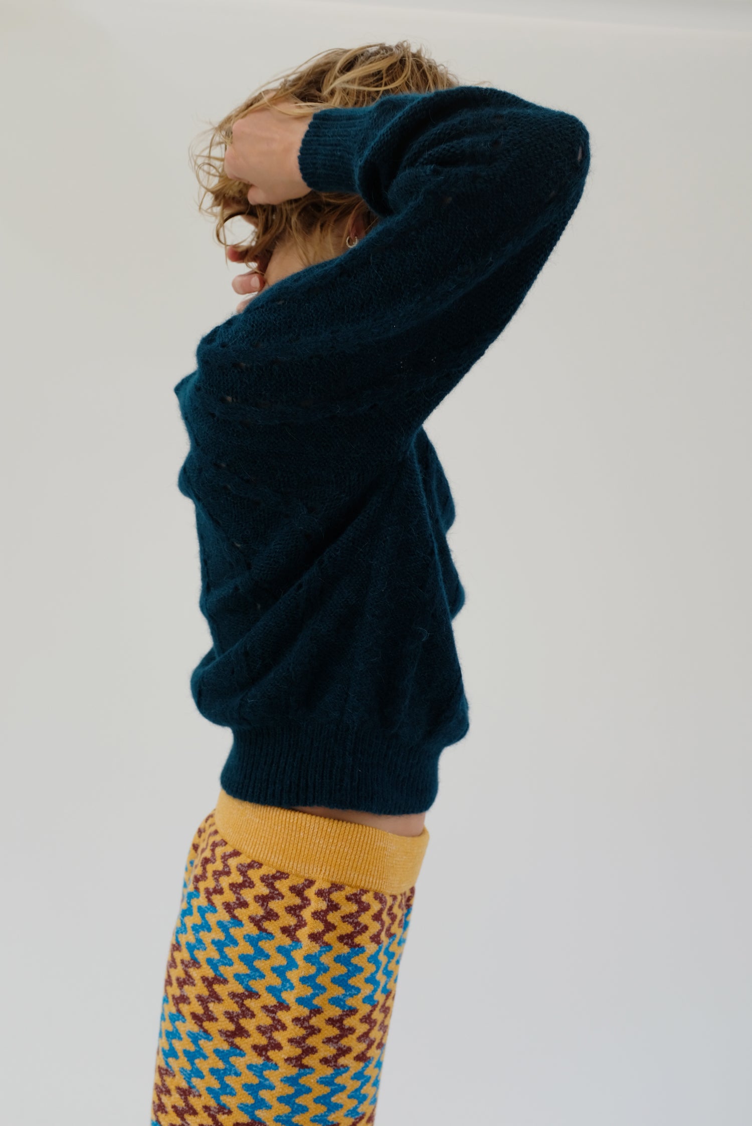 Gorgeous hand knit sweater, baby alpaca, aka, Peruvian cashmere, light as air, warm and crazy soft. An extra cozy, wake-up-and-go-to sweater, that easily fits into a daily wardrobe/uniform. 60% baby alpaca, 5% merino wool, 35% recycled polyamide. Exclusive to Beklina.