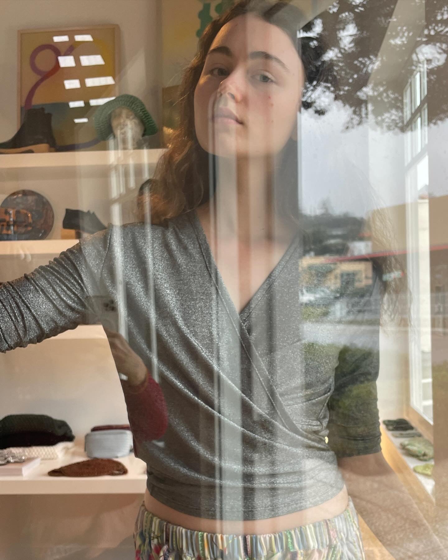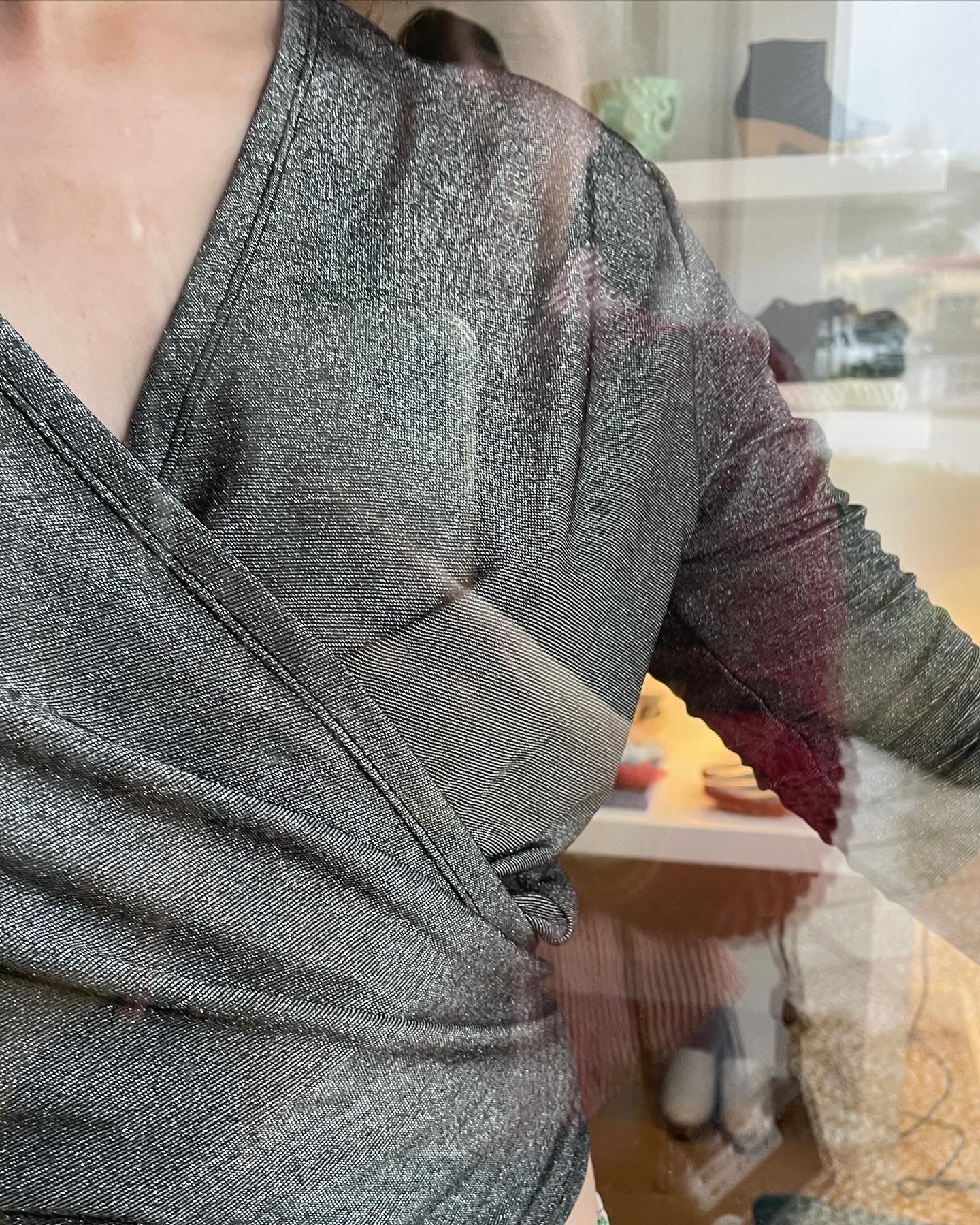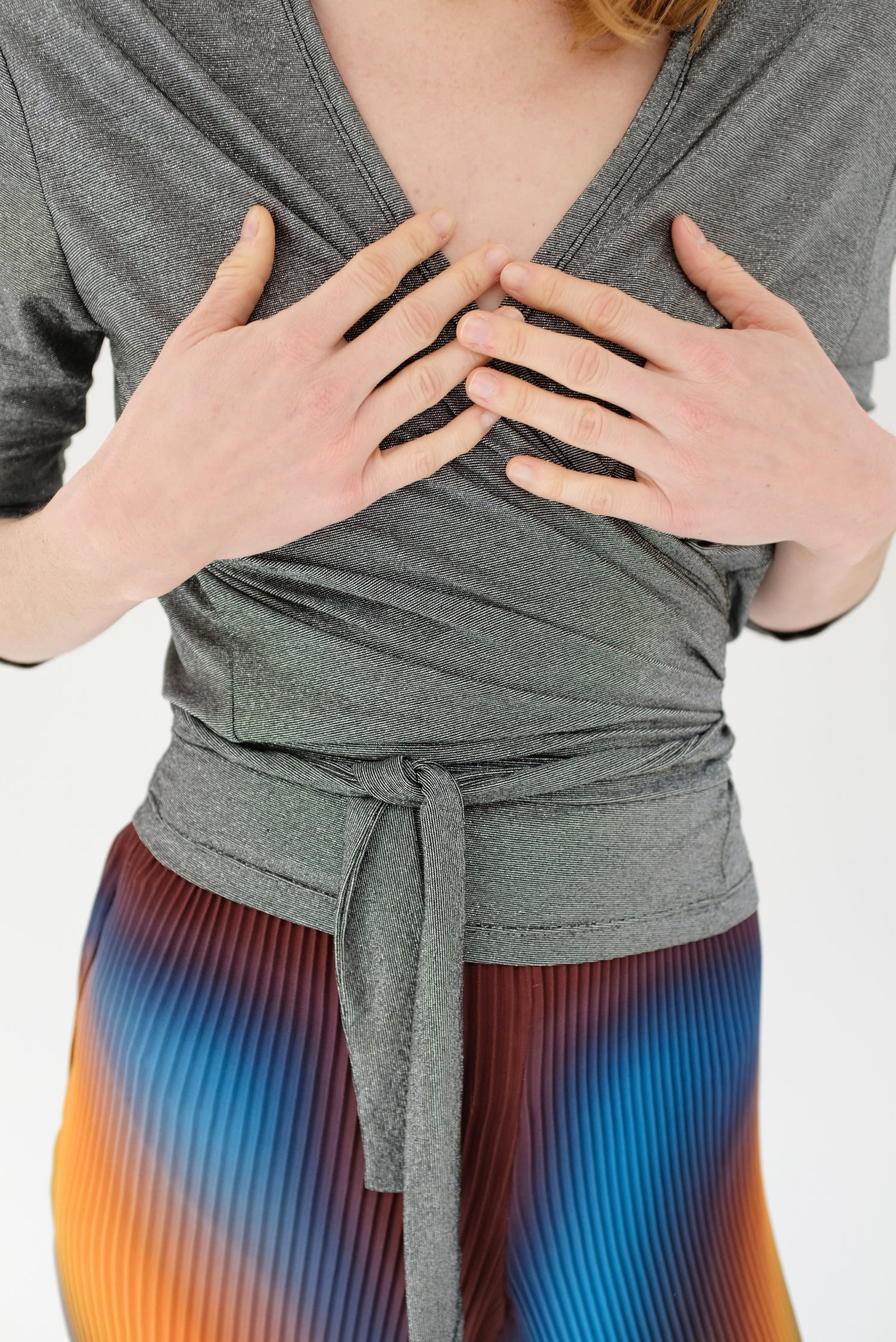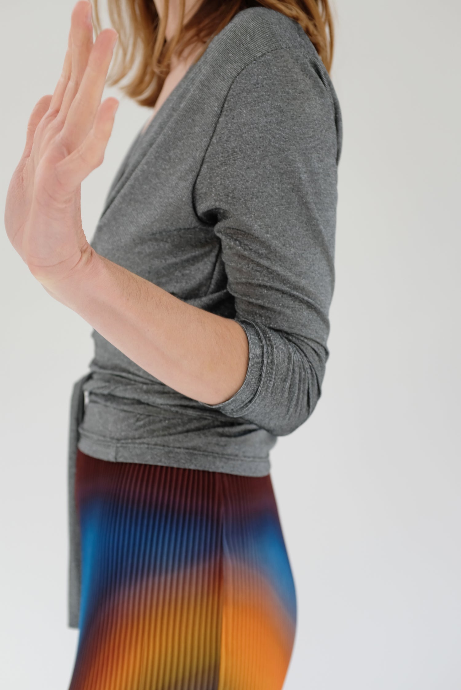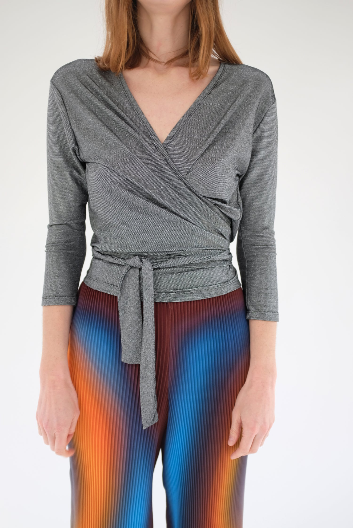 Metallic USA-made silky light jersey. Versatile wearings, tie in front, back, wear fitted or loose, or open. One size fits most, 3/4 sleeve, wear to the office or the gym!