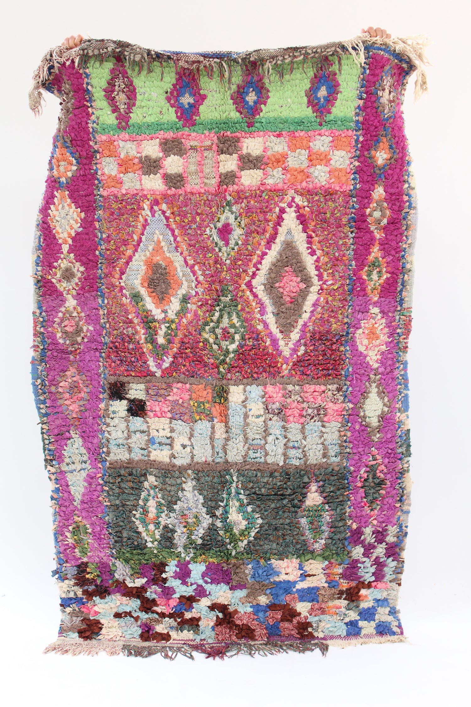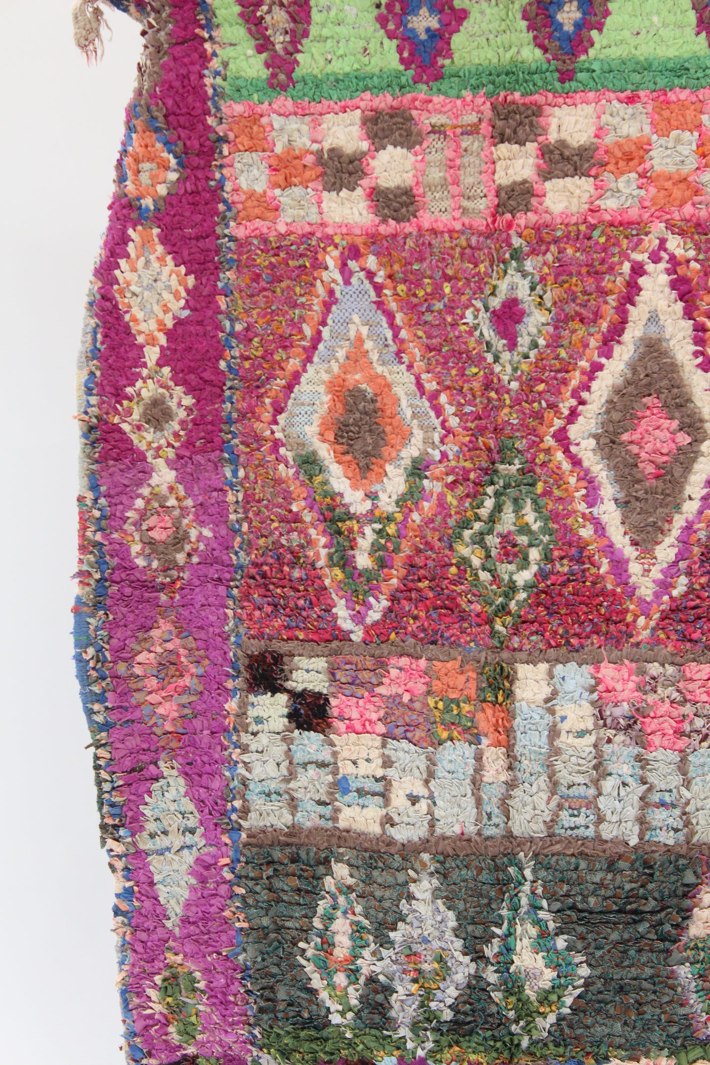 Morocco's Berber craft Boucherouite rugs. Can also be hung on walls. Authentic vintage rugs that make a colorful and warm statement. Made from sustainable materials by local artisans – including cotton, nylon and wool. Each is one of a kind.