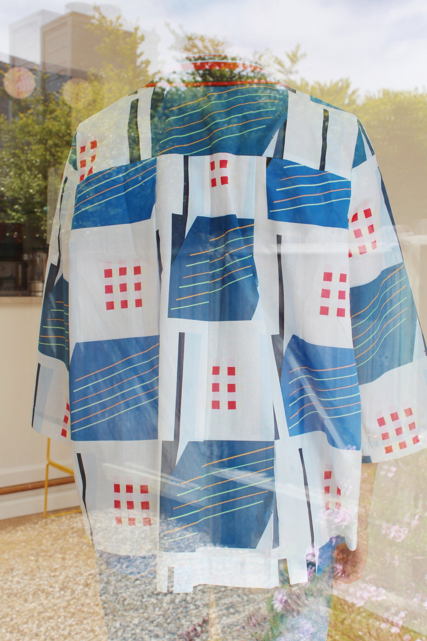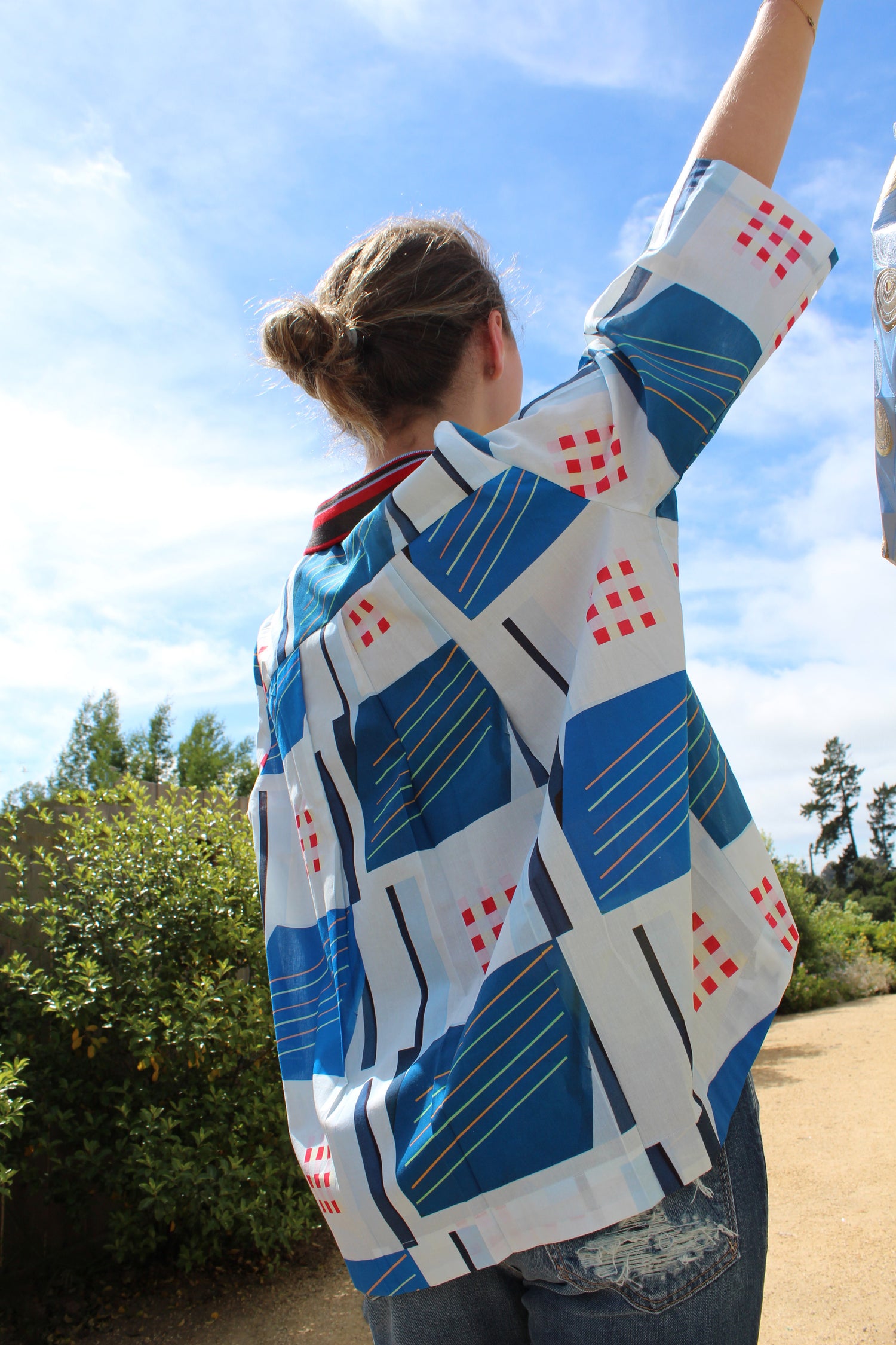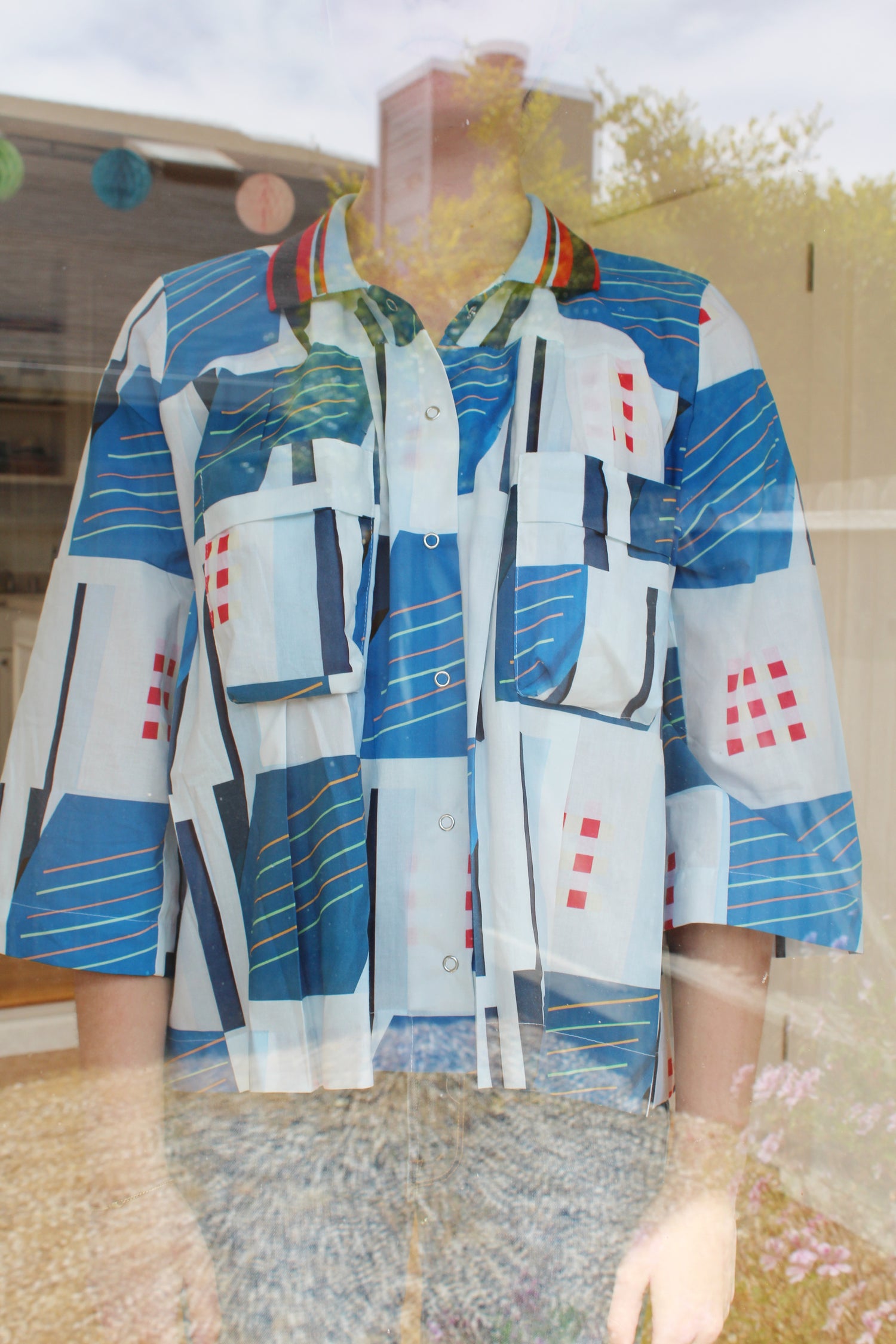Boxy cotton blouse, front pockets, knit collar, metal snaps down front, wear open or closed, loose fitting. Custom handmade print.