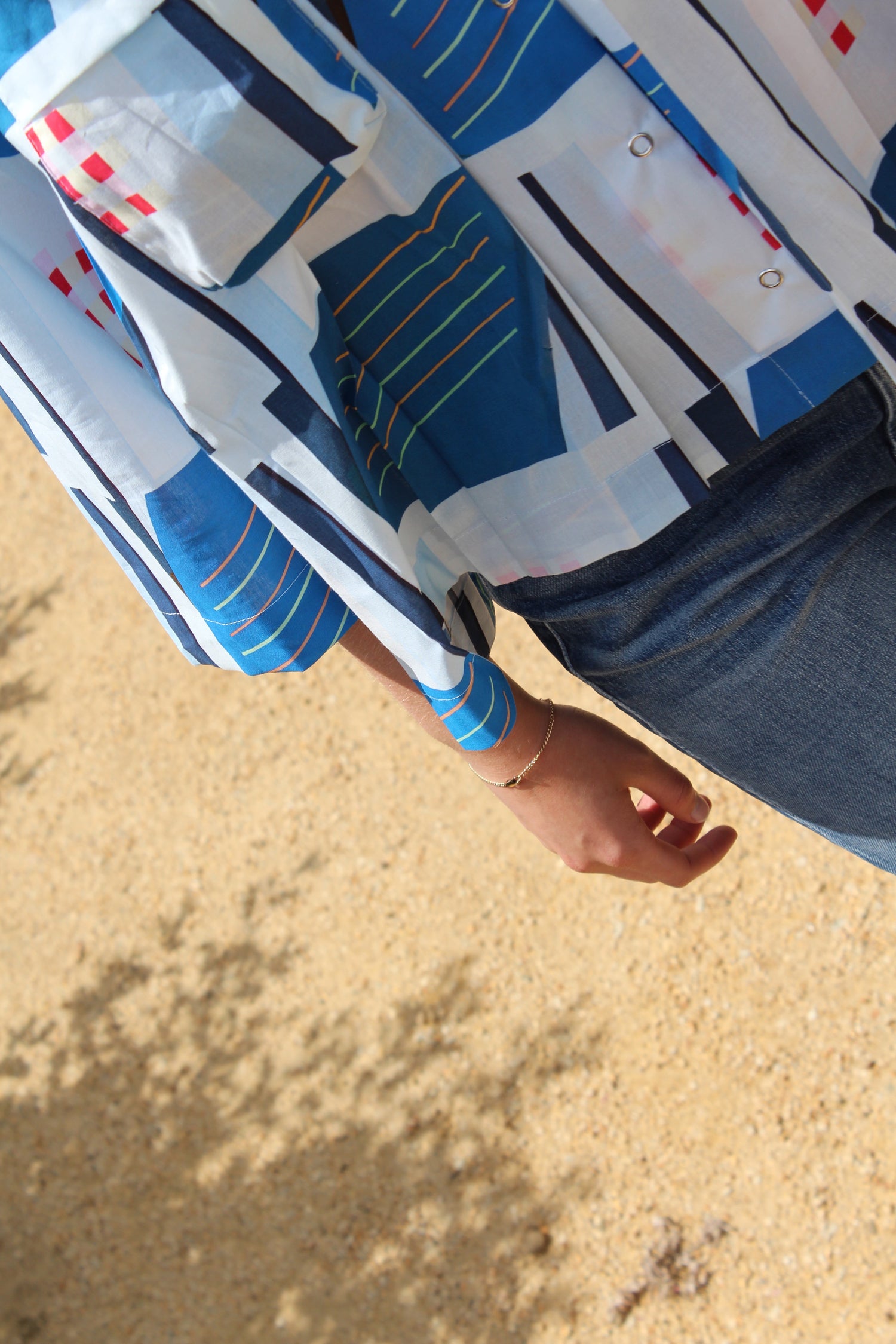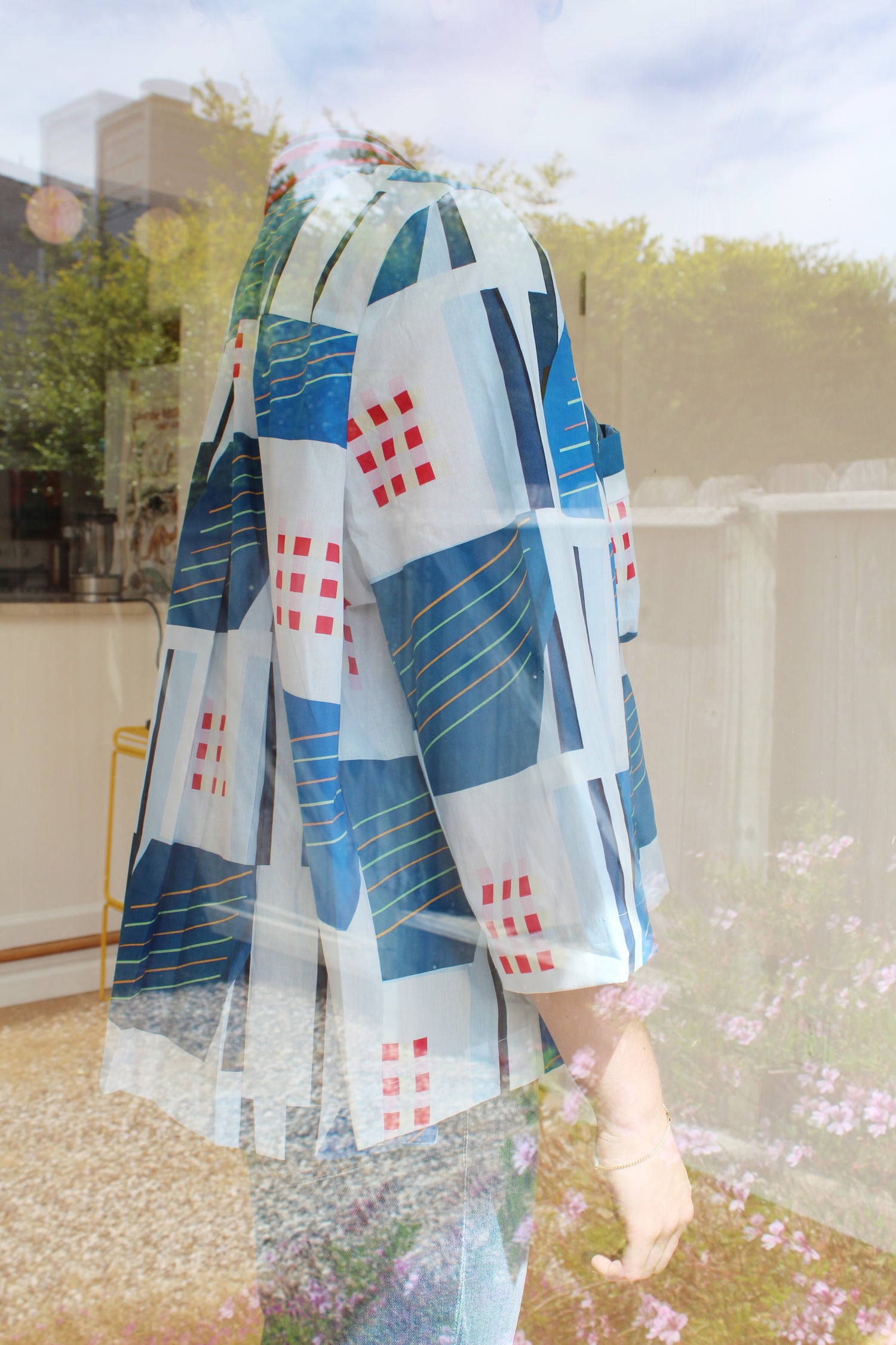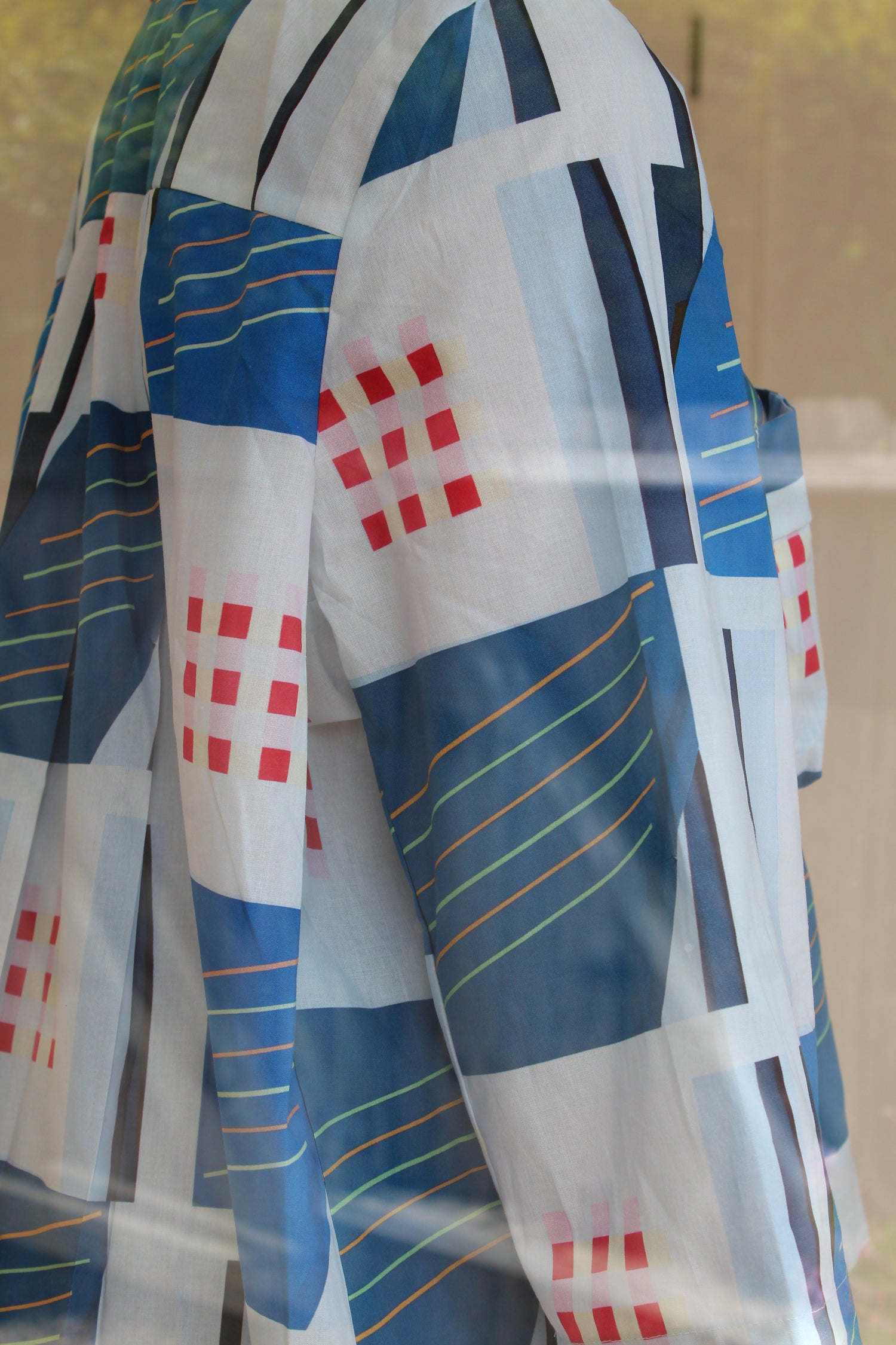 Boxy cotton blouse, front pockets, knit collar, metal snaps down front, wear open or closed, loose fitting. Custom handmade print.