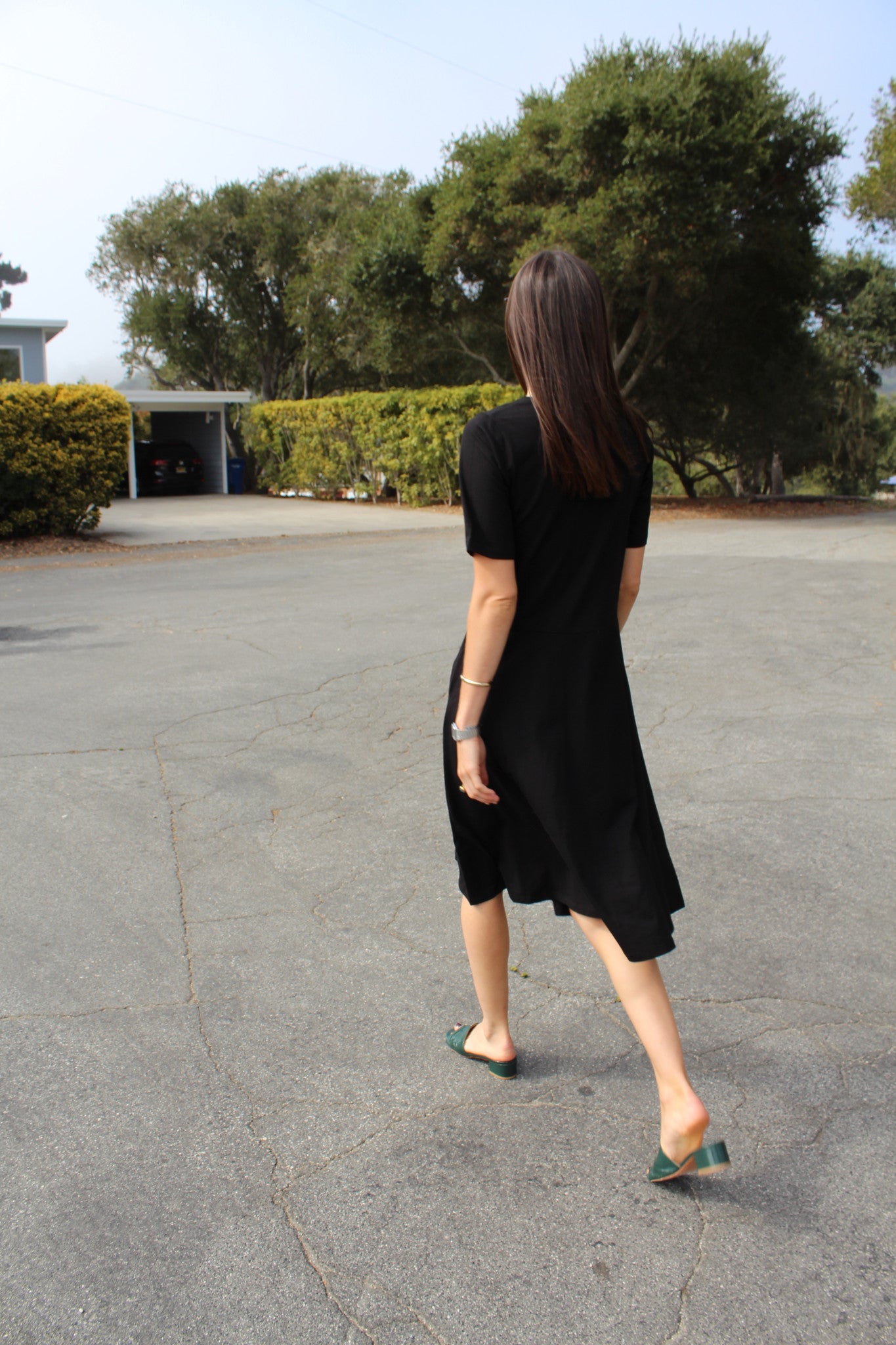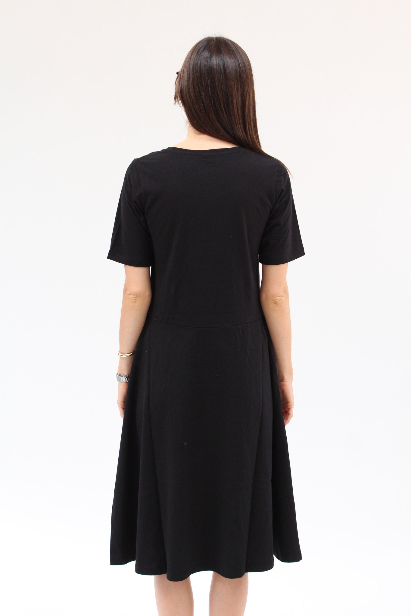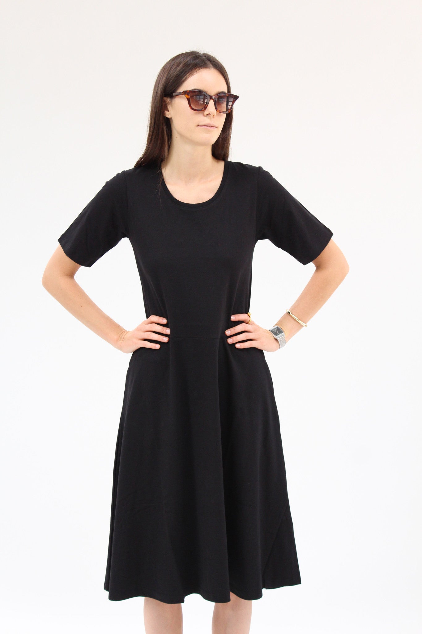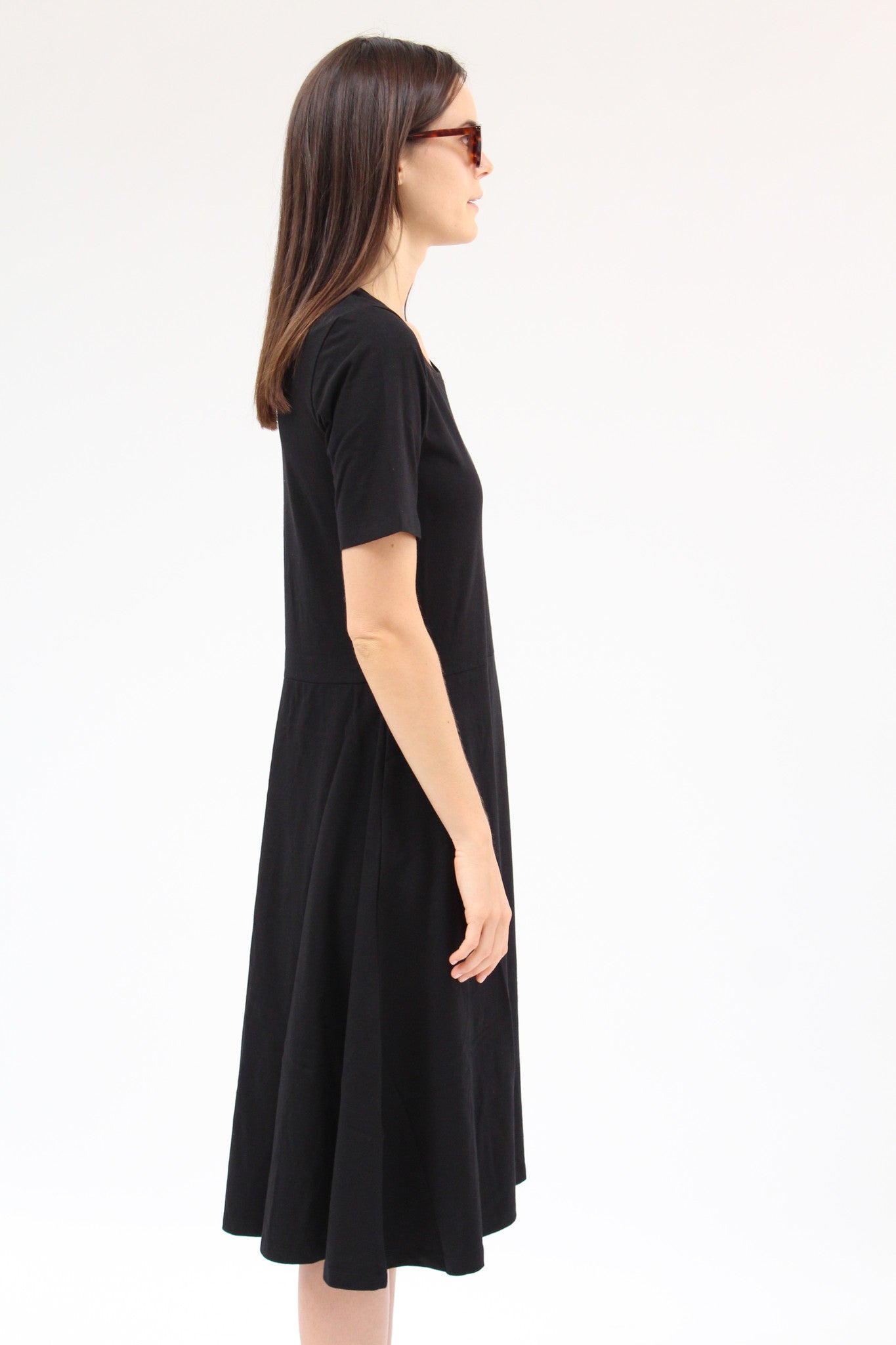 A shop favorite because it's so comfy and looks great on everyone. Half sleeve, ballet neckline, full long skirt. 100% certified fair trade organic cotton jersey. The jersey has a nice thickness and weight, not thin or light at all. It drapes and isn't sheer. Dress up or down, so classic and versatile.