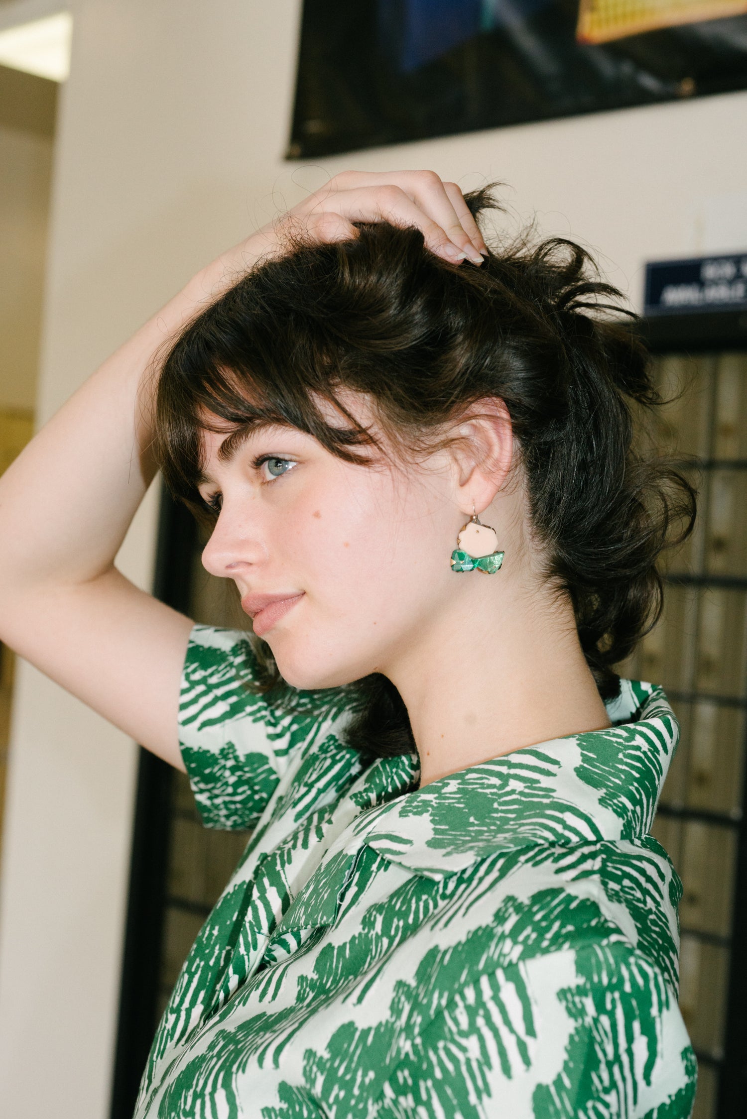 Each is one of a kind, works of art and collectable. Materials include hand sanded plexiglass, brass, sterling silver, fine silver, and found objects. Gems are set in brass frames, with a sterling silver ear hook.