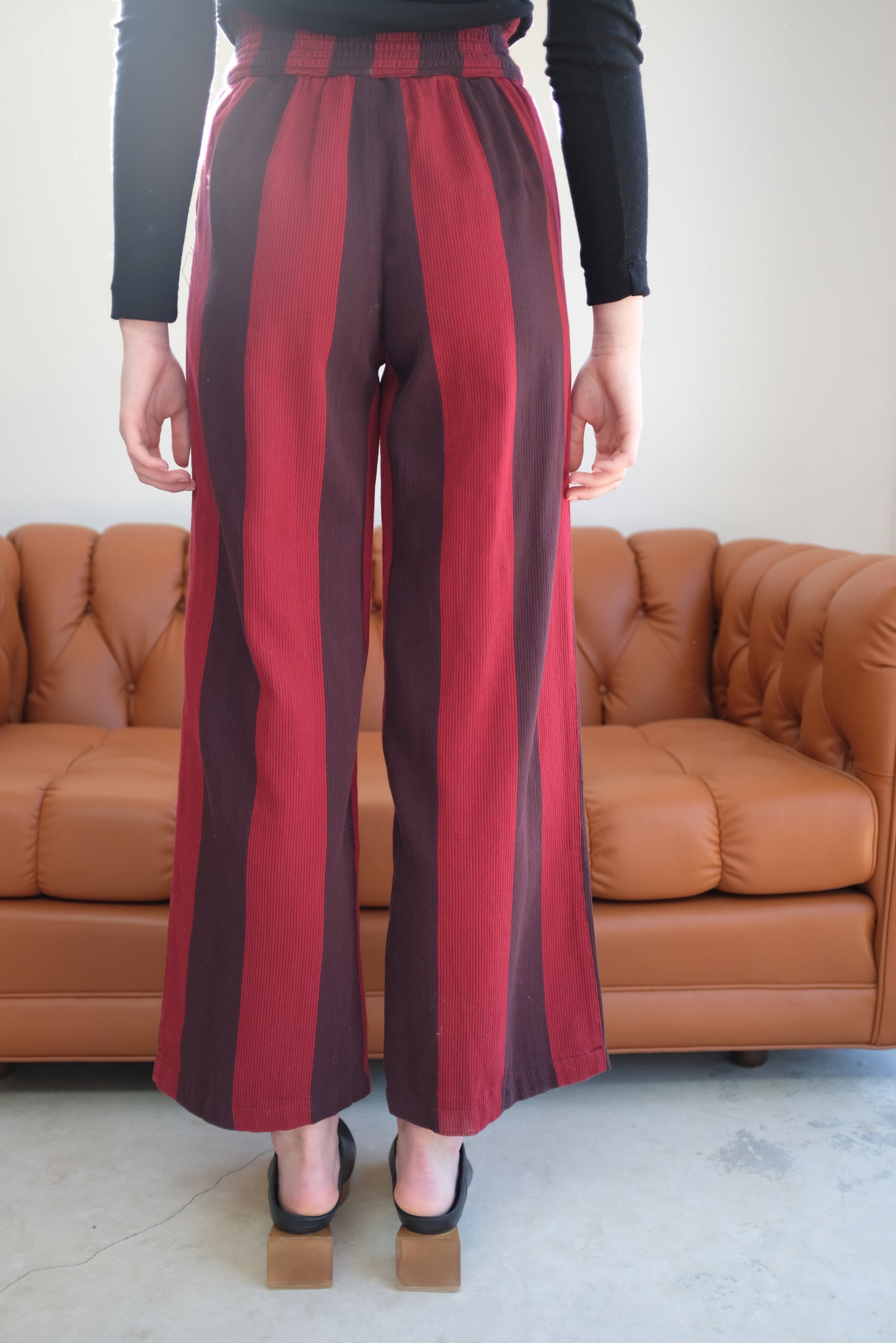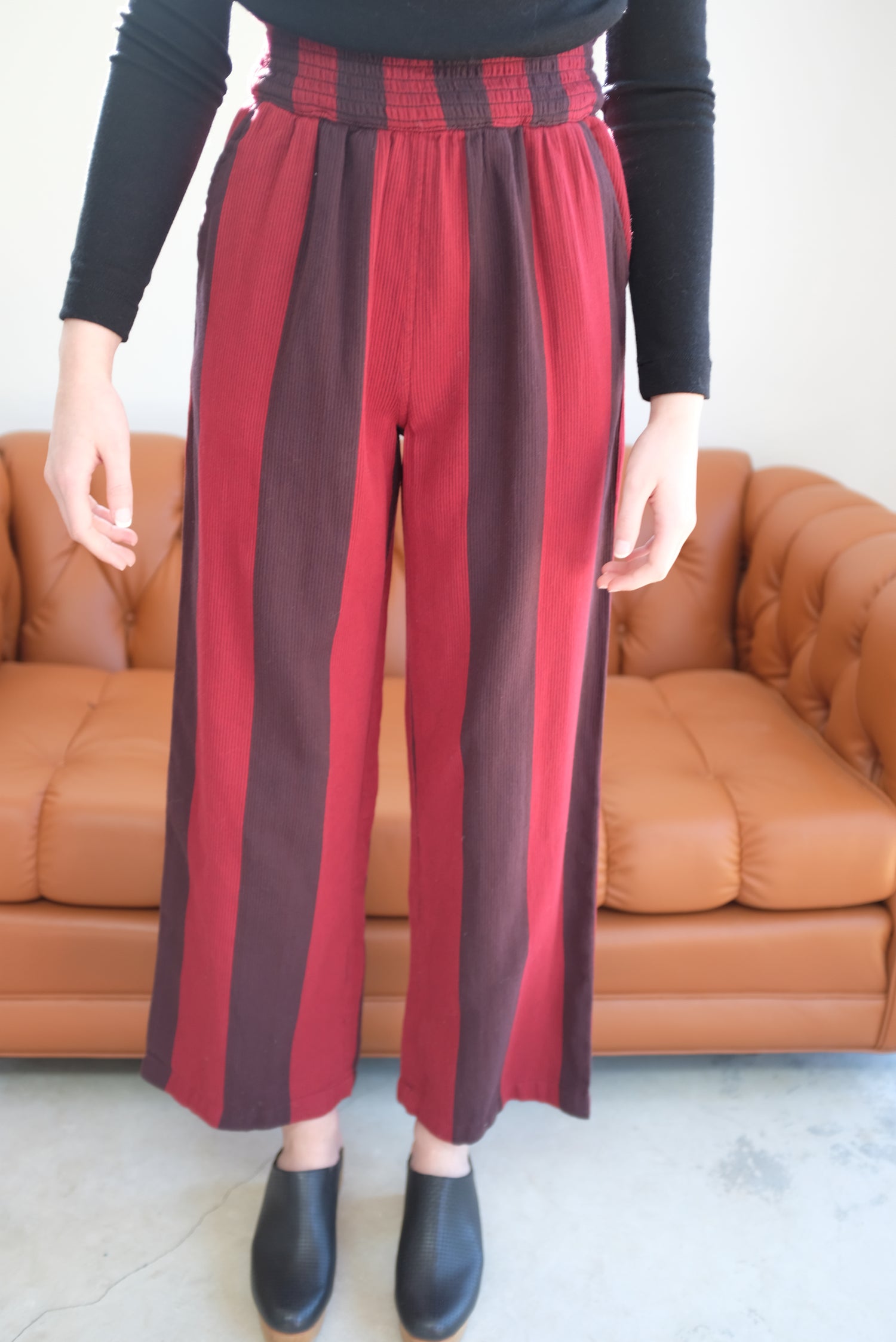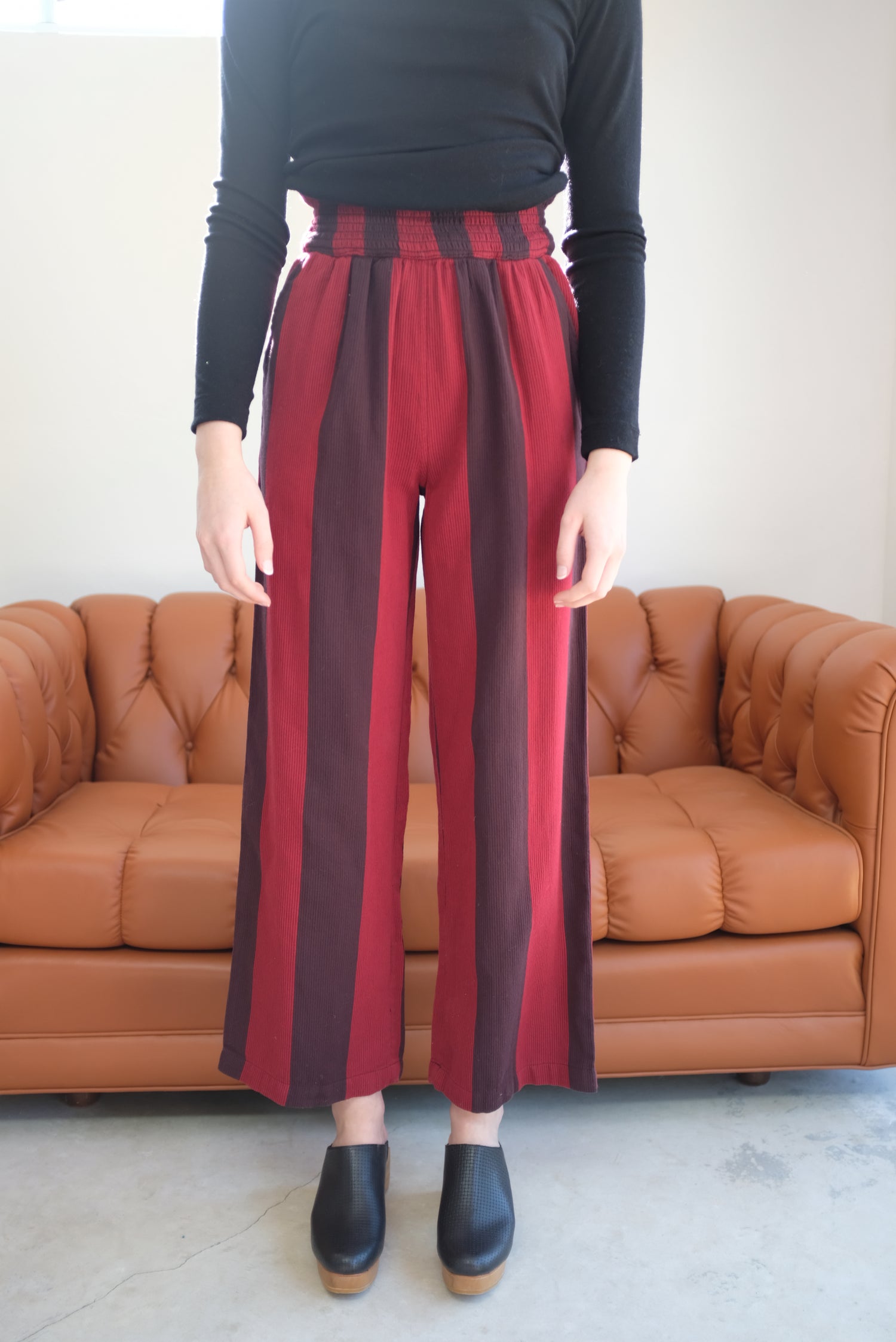 Cropped wide legged pant, 3" elasticated waistband, front pockets. 100% Cotton.