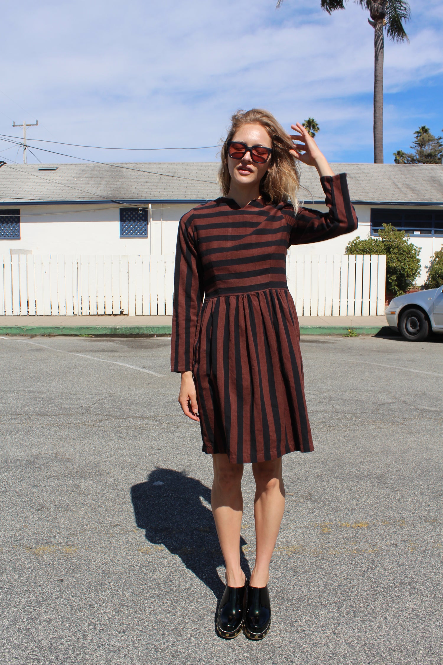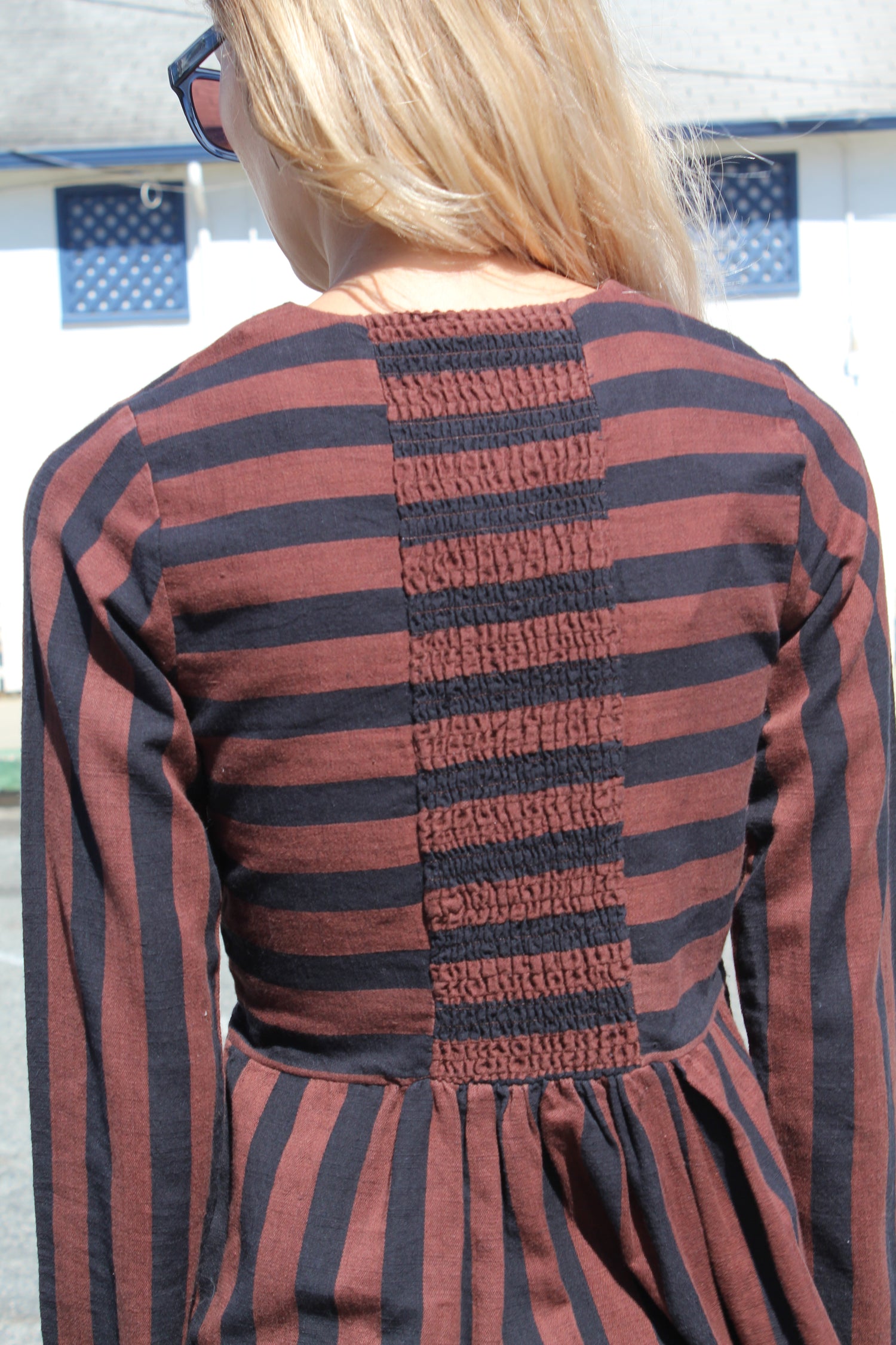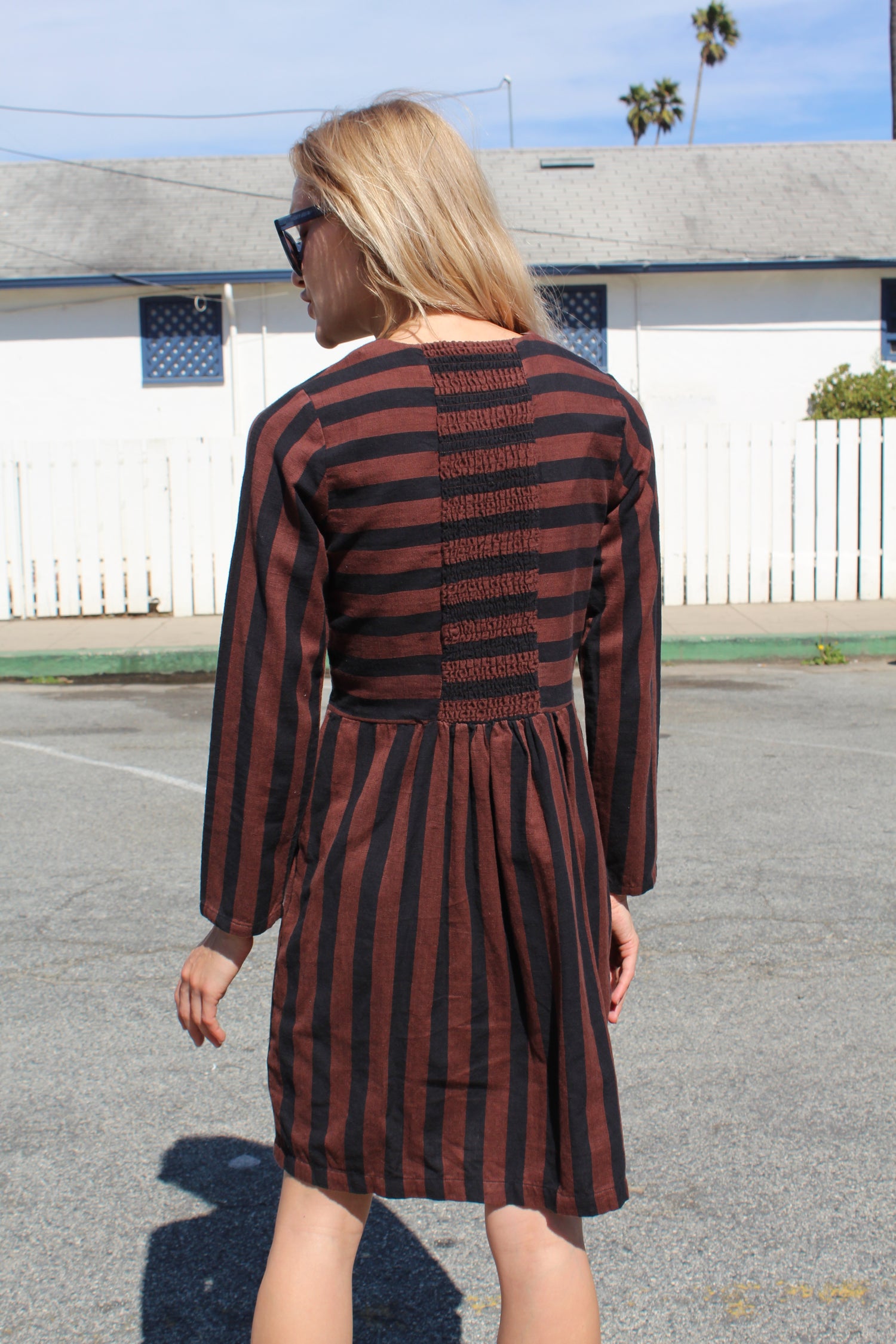 A fitted long sleeve minidress with shirred elastic back panel and side pockets. Runs true to size. 100% Cotton. Alexis is wearing an x-small and she is 5'7"