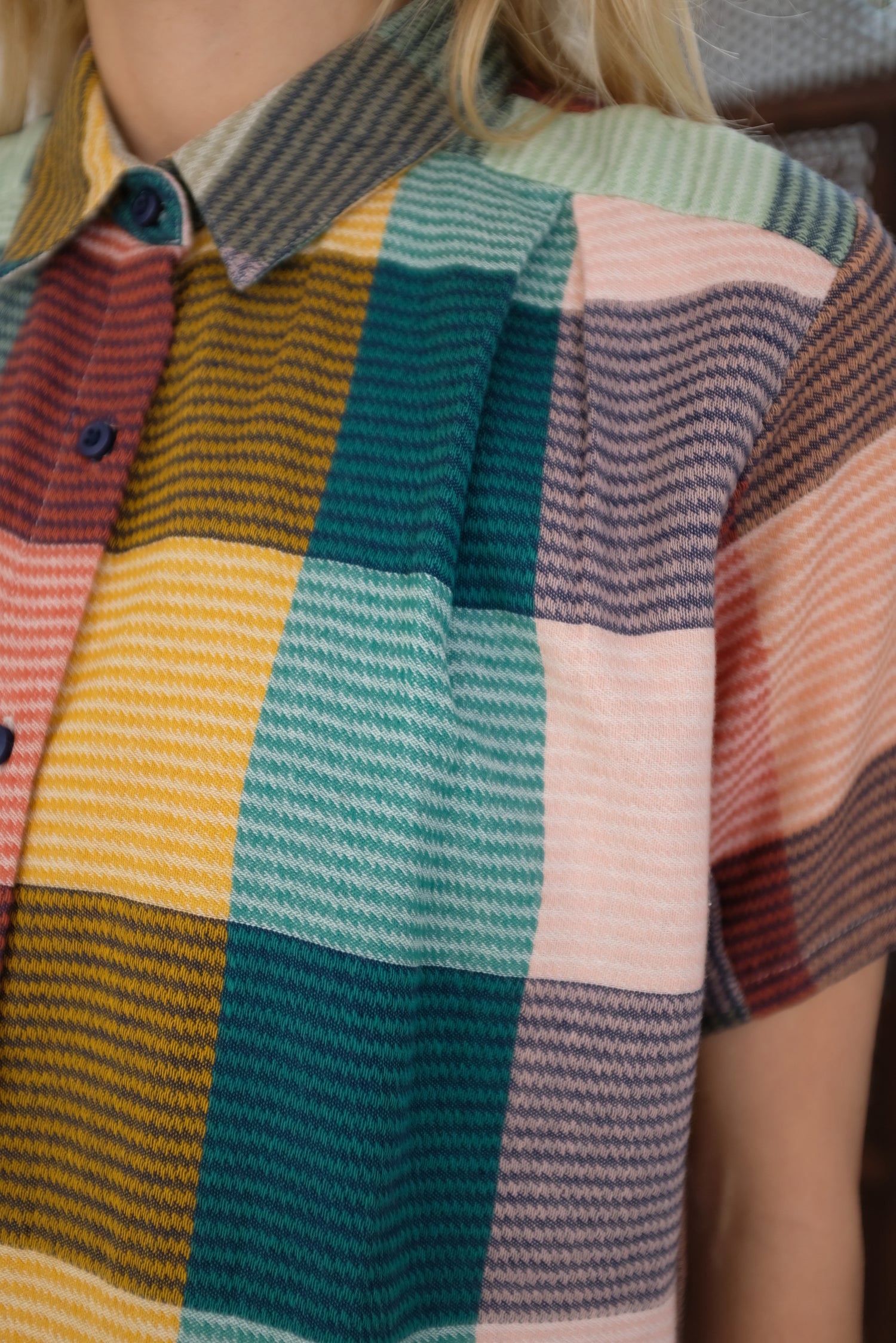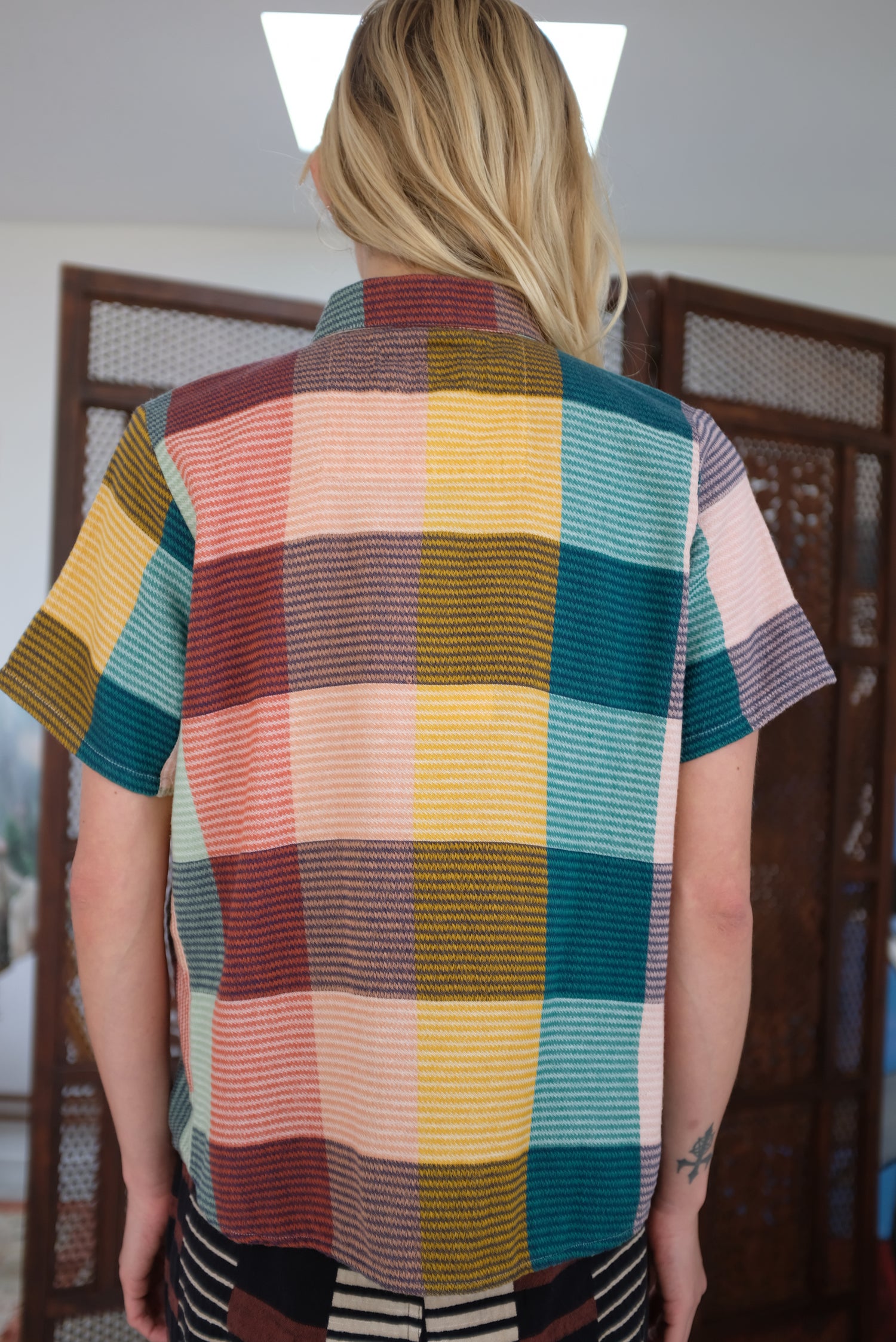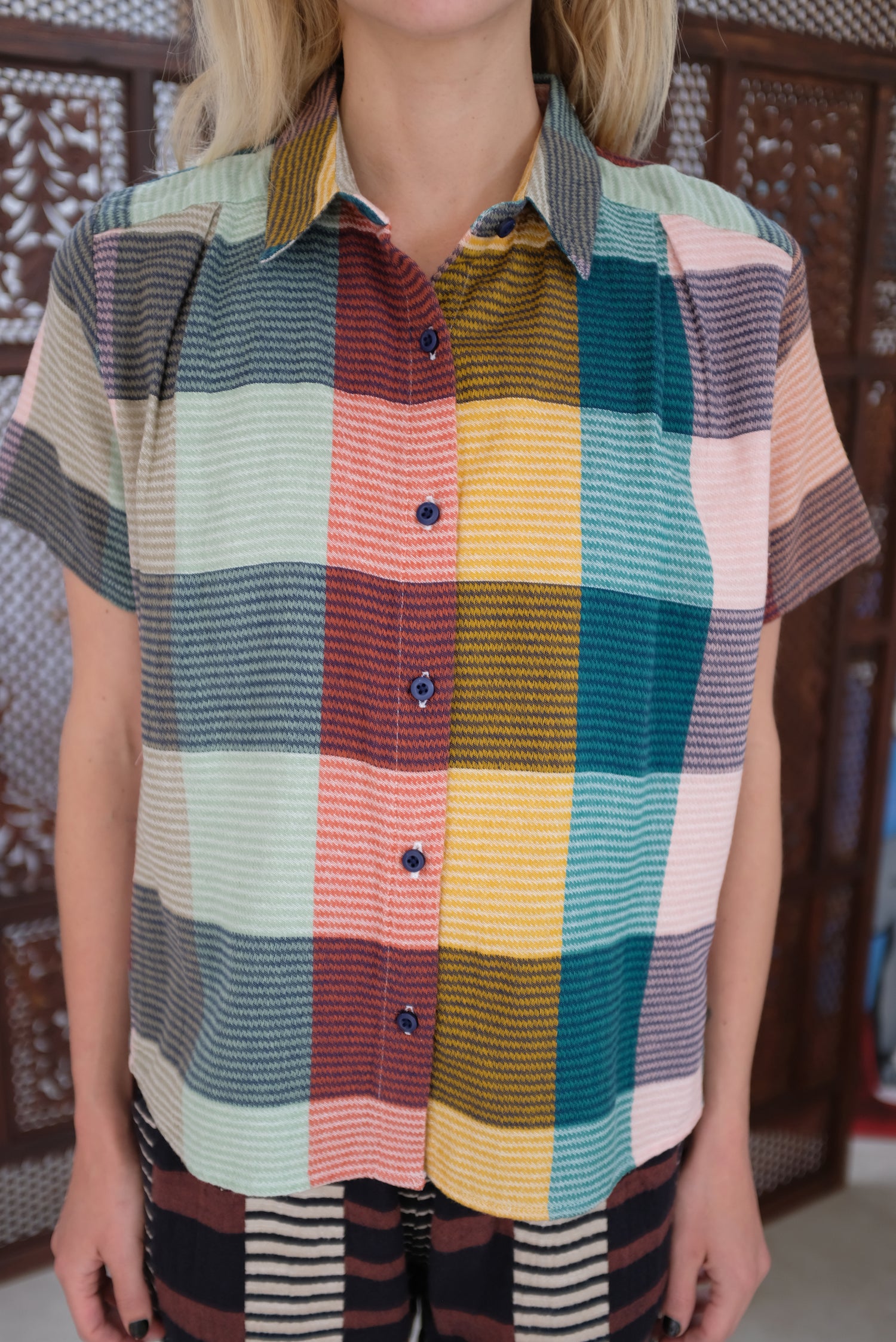 Short sleeve button up blouse with a small foldover collar. 100% Cotton.