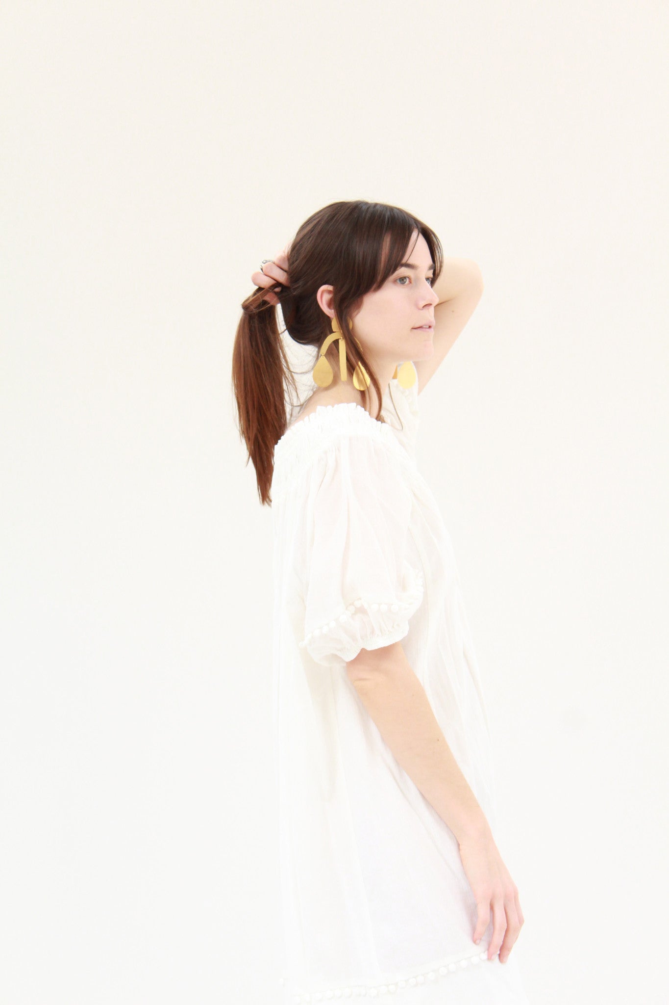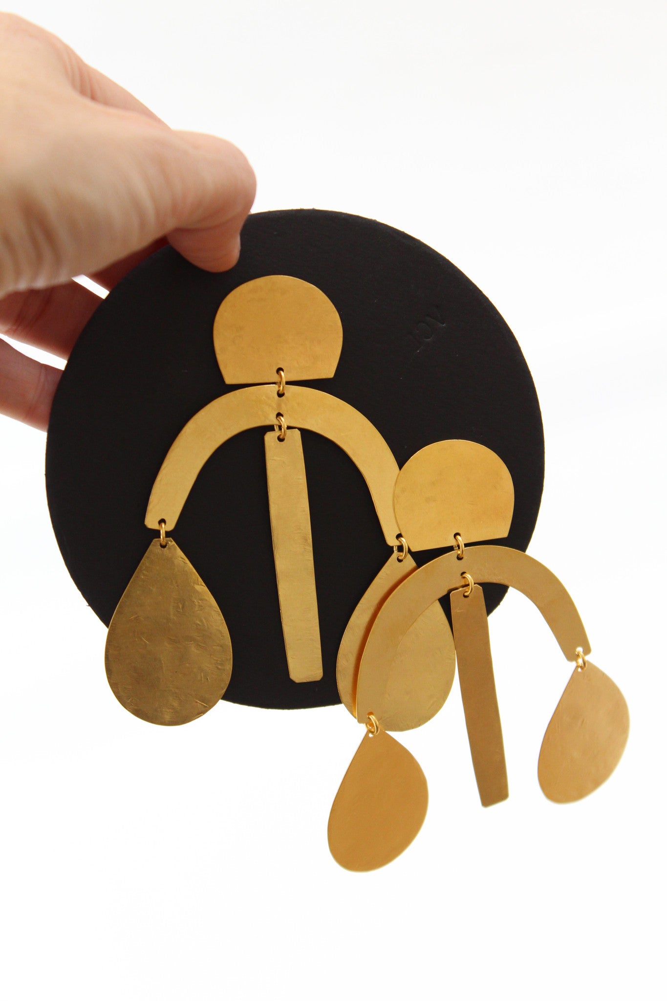 Hand-cut hammered shapes, satin gold finish, approximately 4" tall x 3.25" wide. Very light and comfortable to wear.