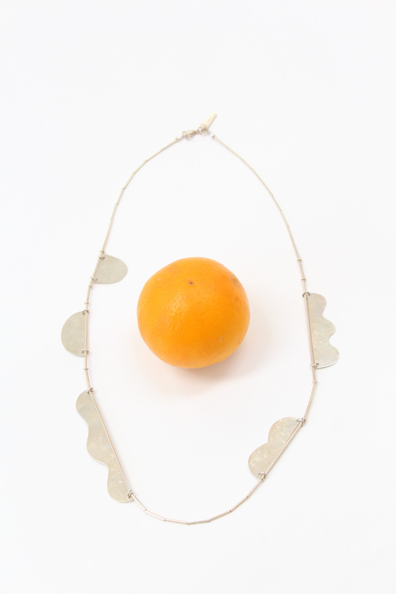 Hand-cut hammered shapes with tube beads, burnished silver finish. Approximately 25" long.
