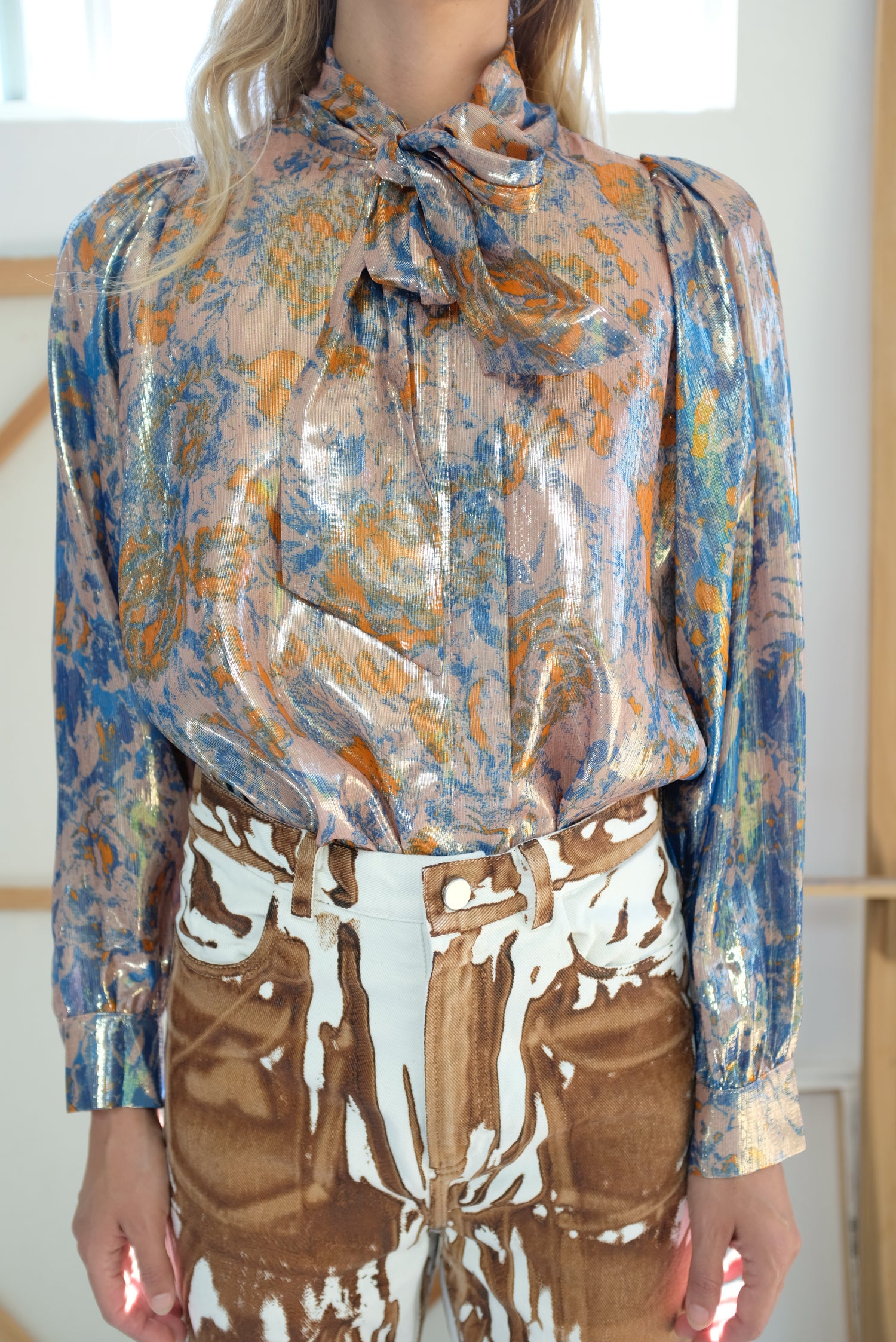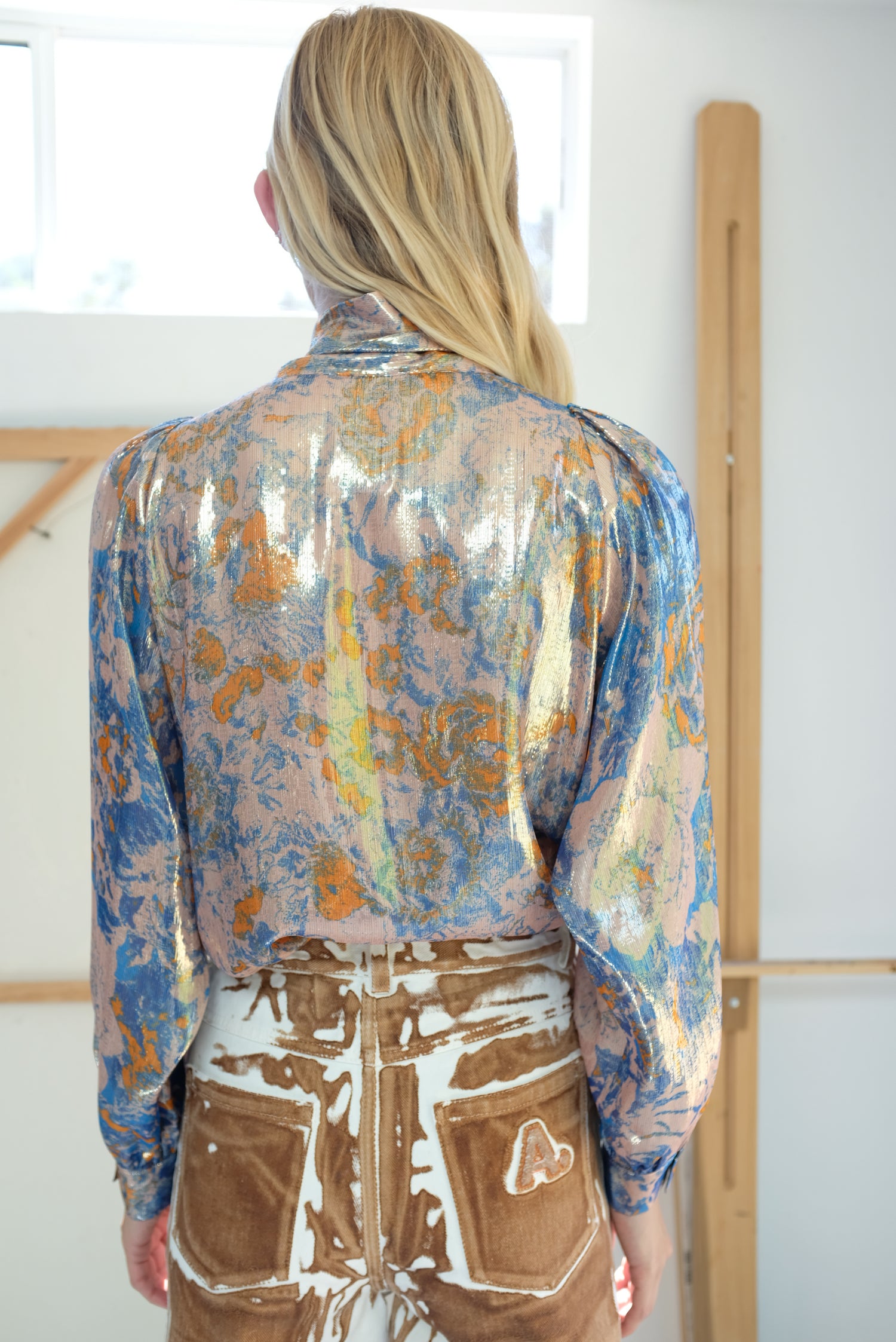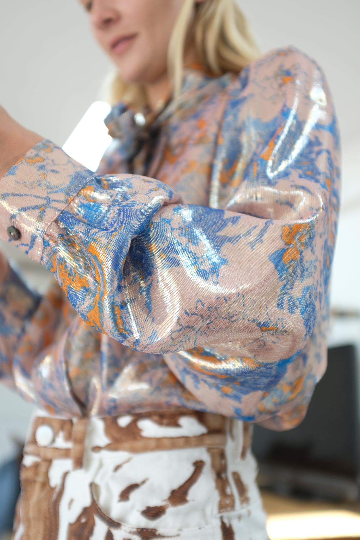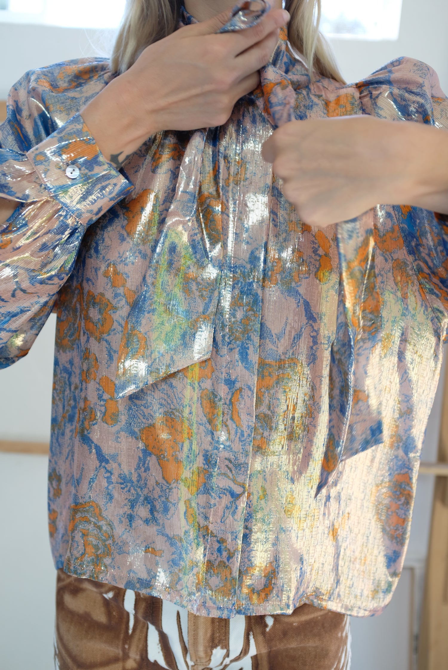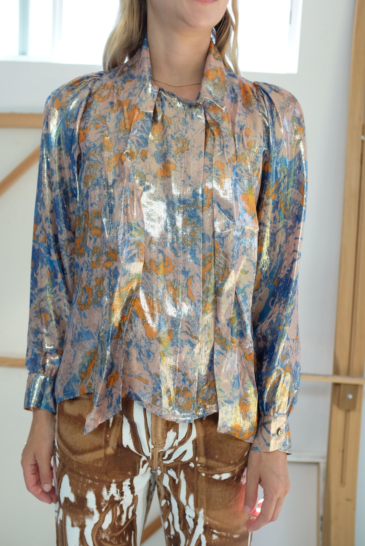 Gorgeous silver metallic silk chiffon top. Billowing long sleeves, button at cuffs, scarf tie neckline, hidden buttons down front. Semi-sheer. 67% Silk, 33% Lurex.