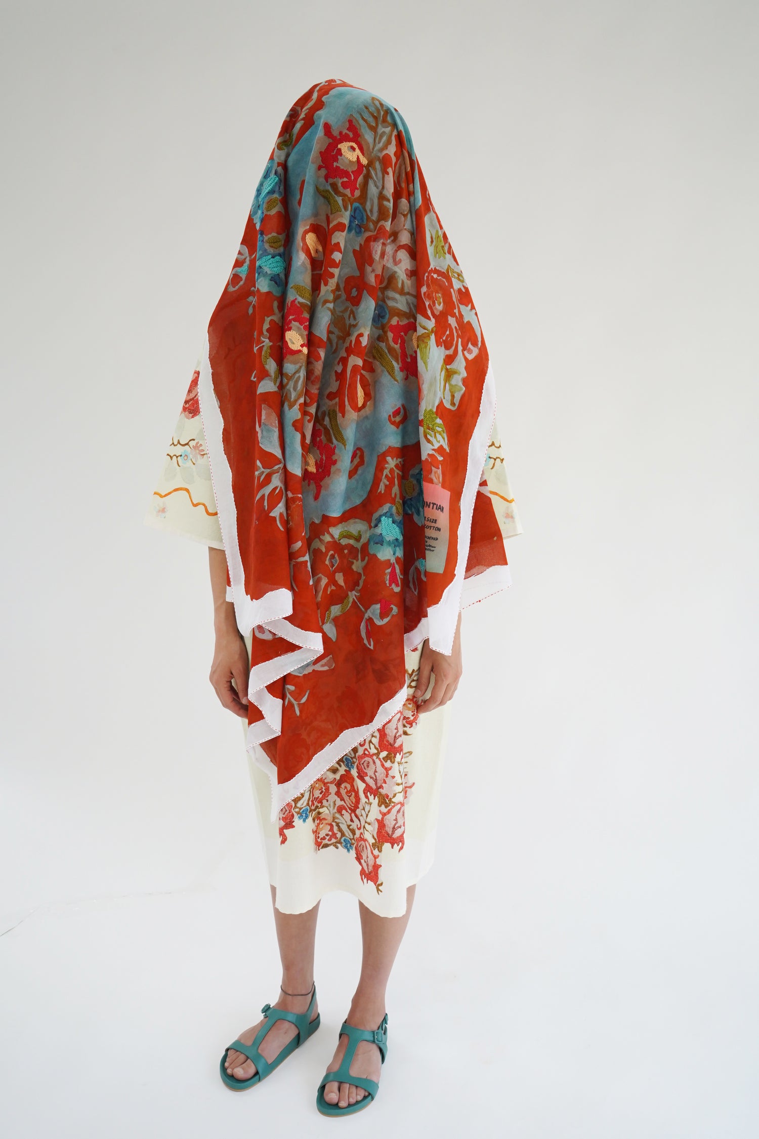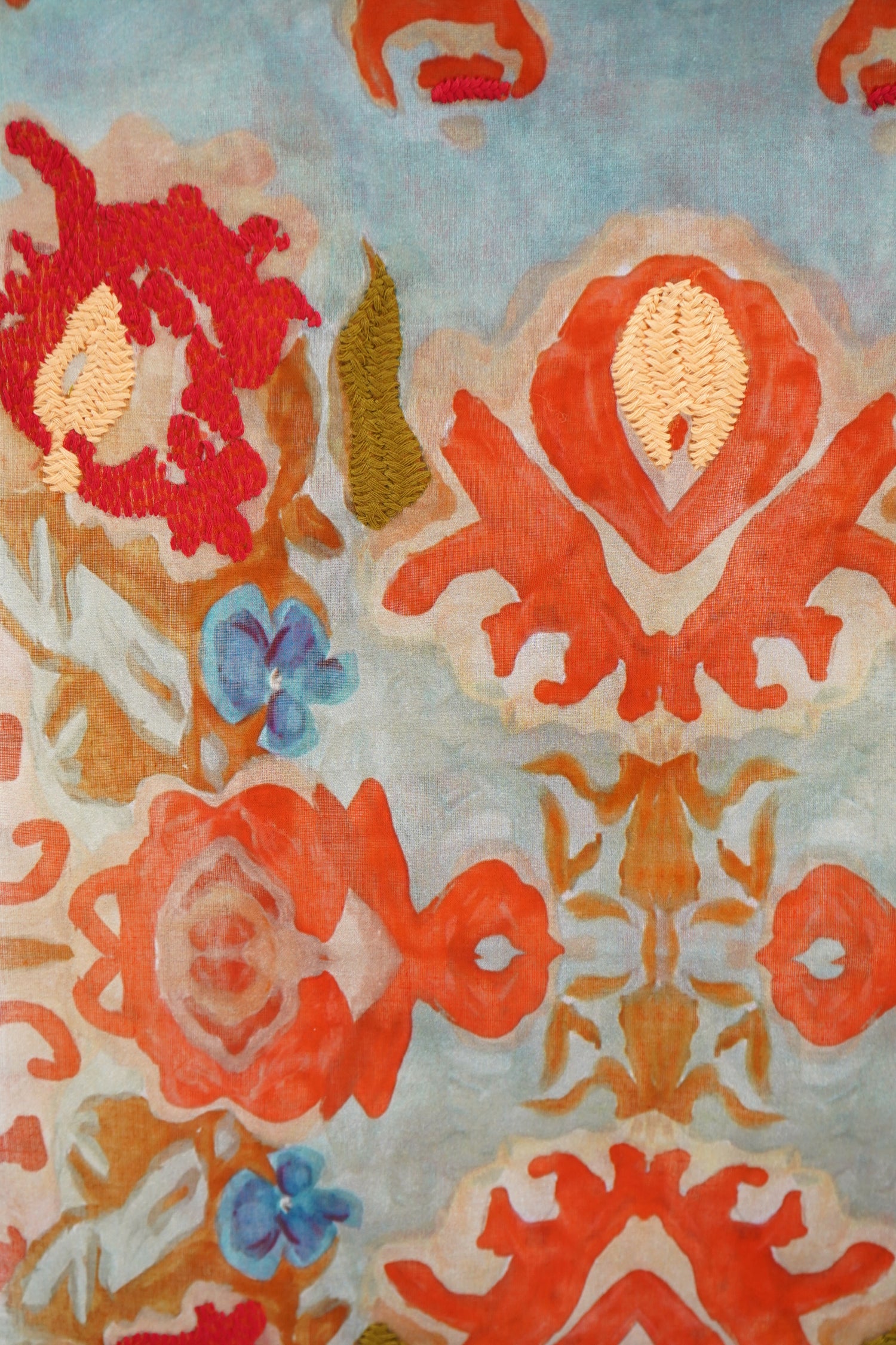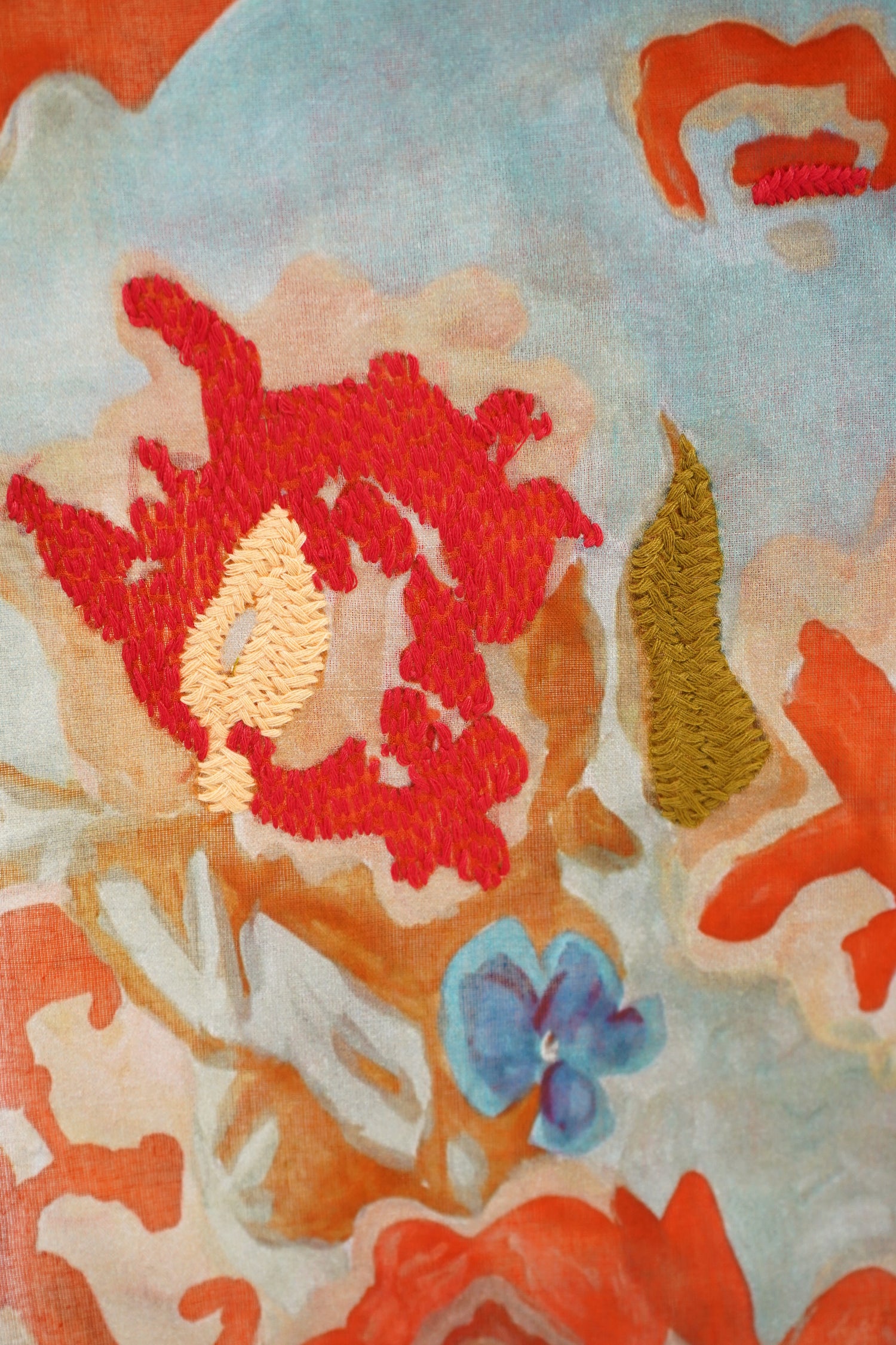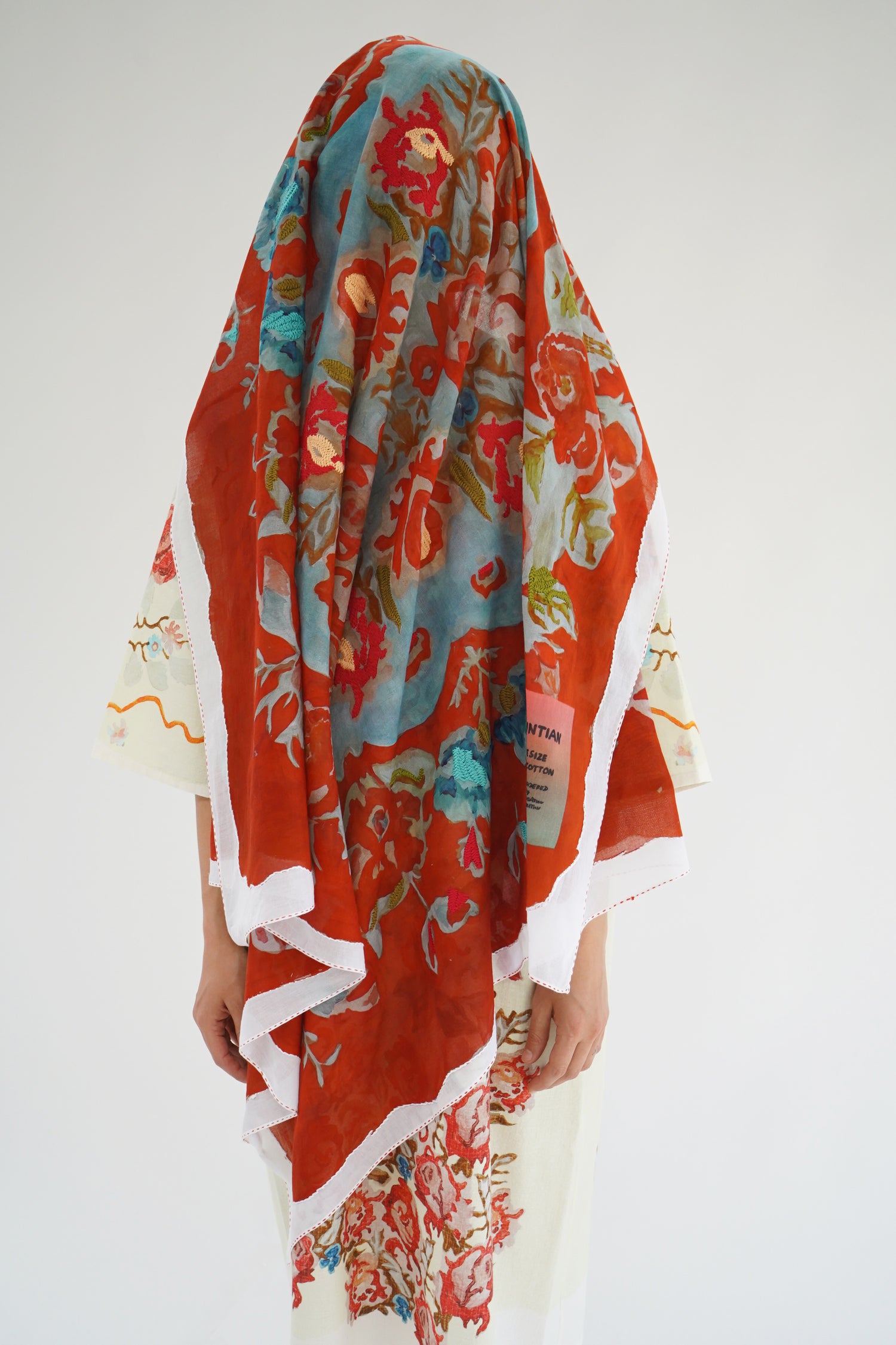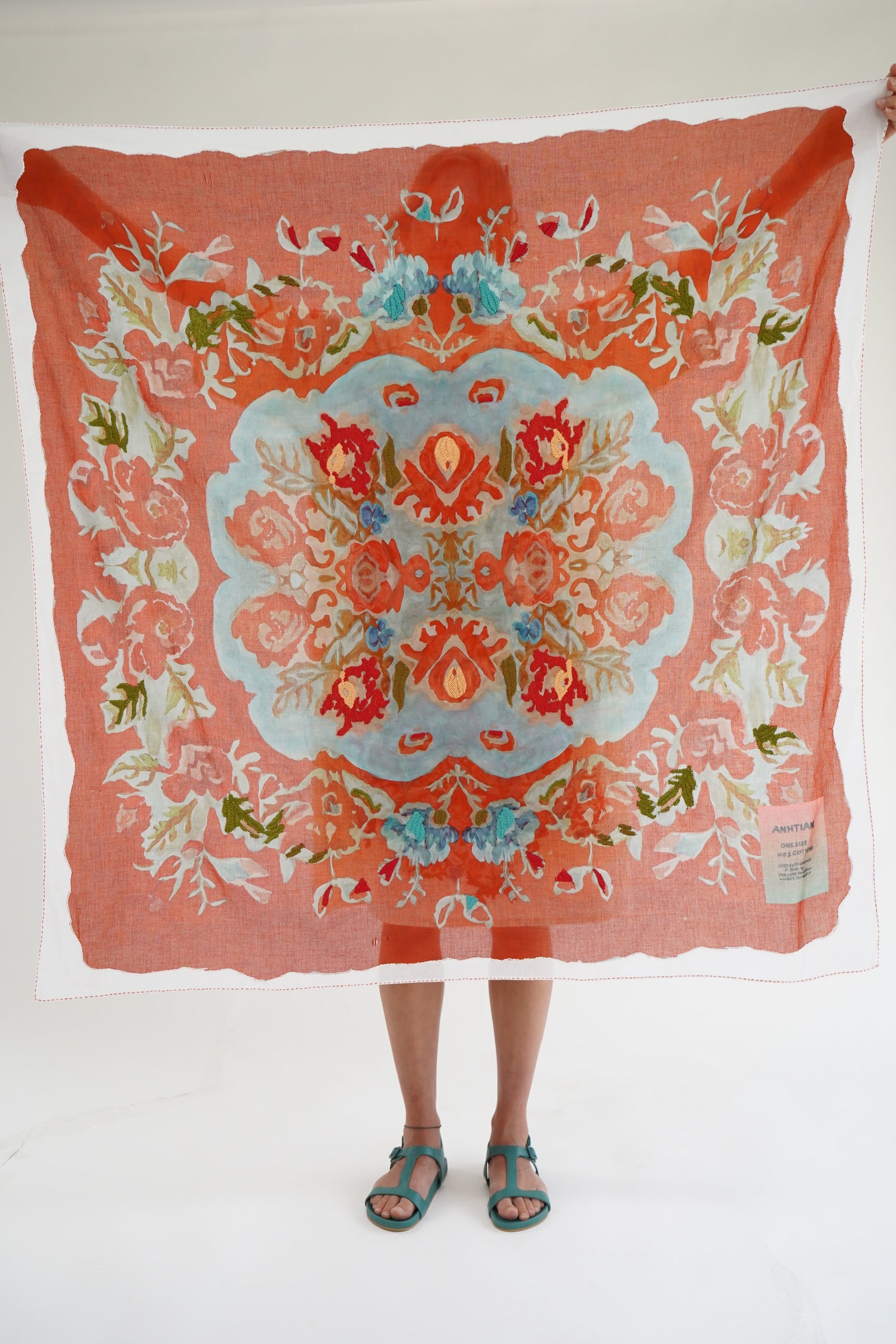 Gorgeous flower printed scarf with hand embroidered detailing. 100% Cotton. Aprox 47" x 47"