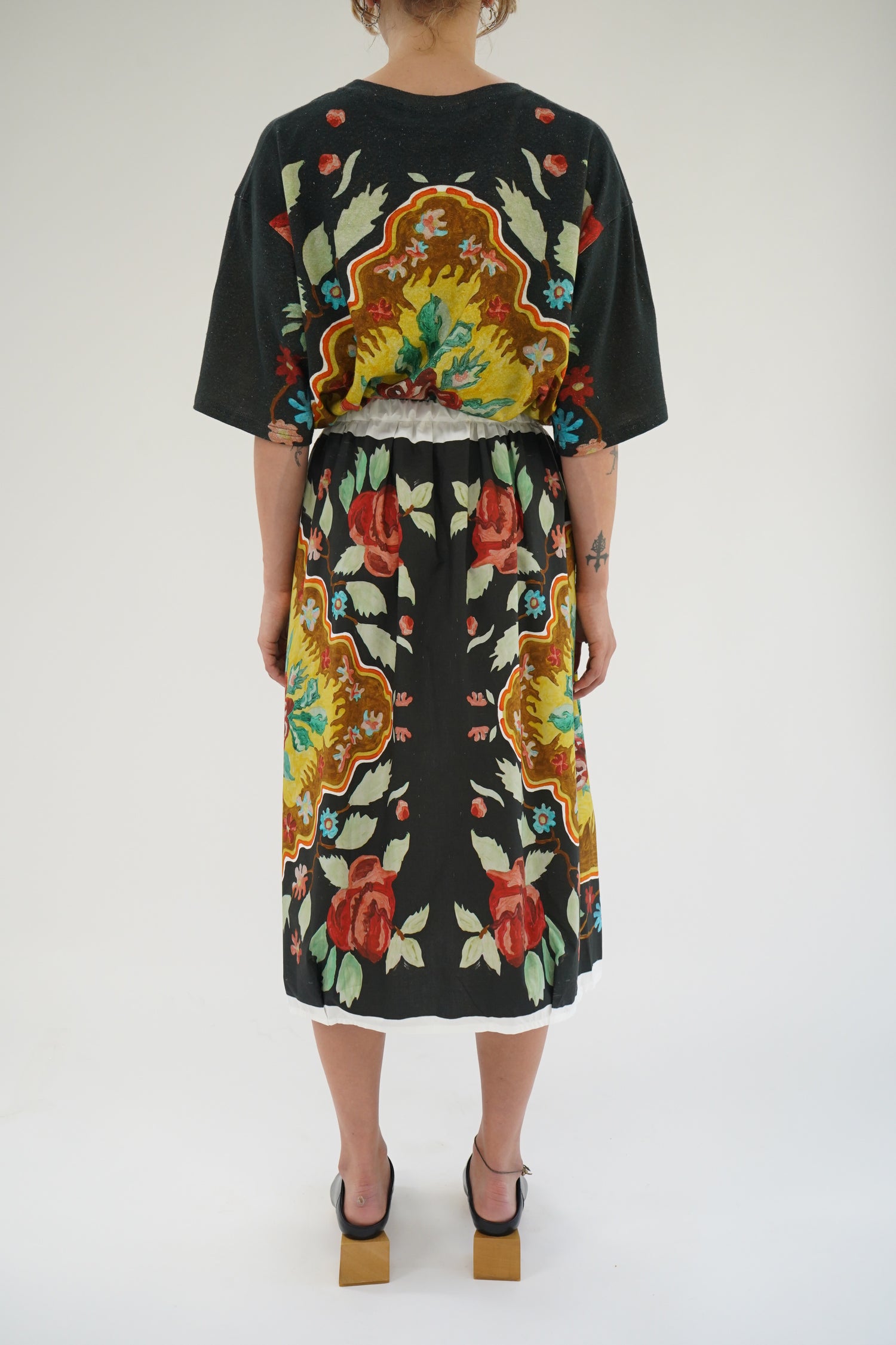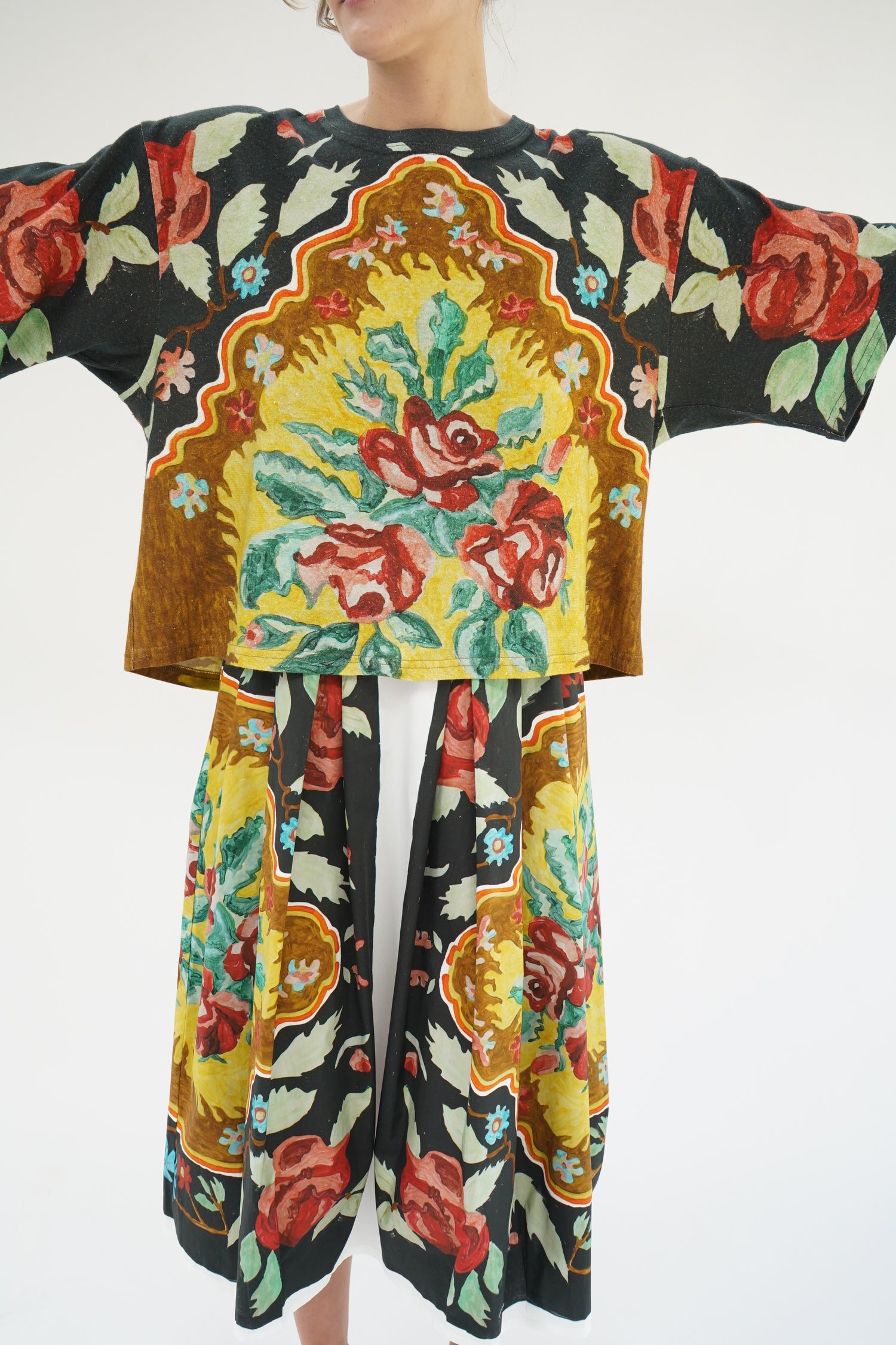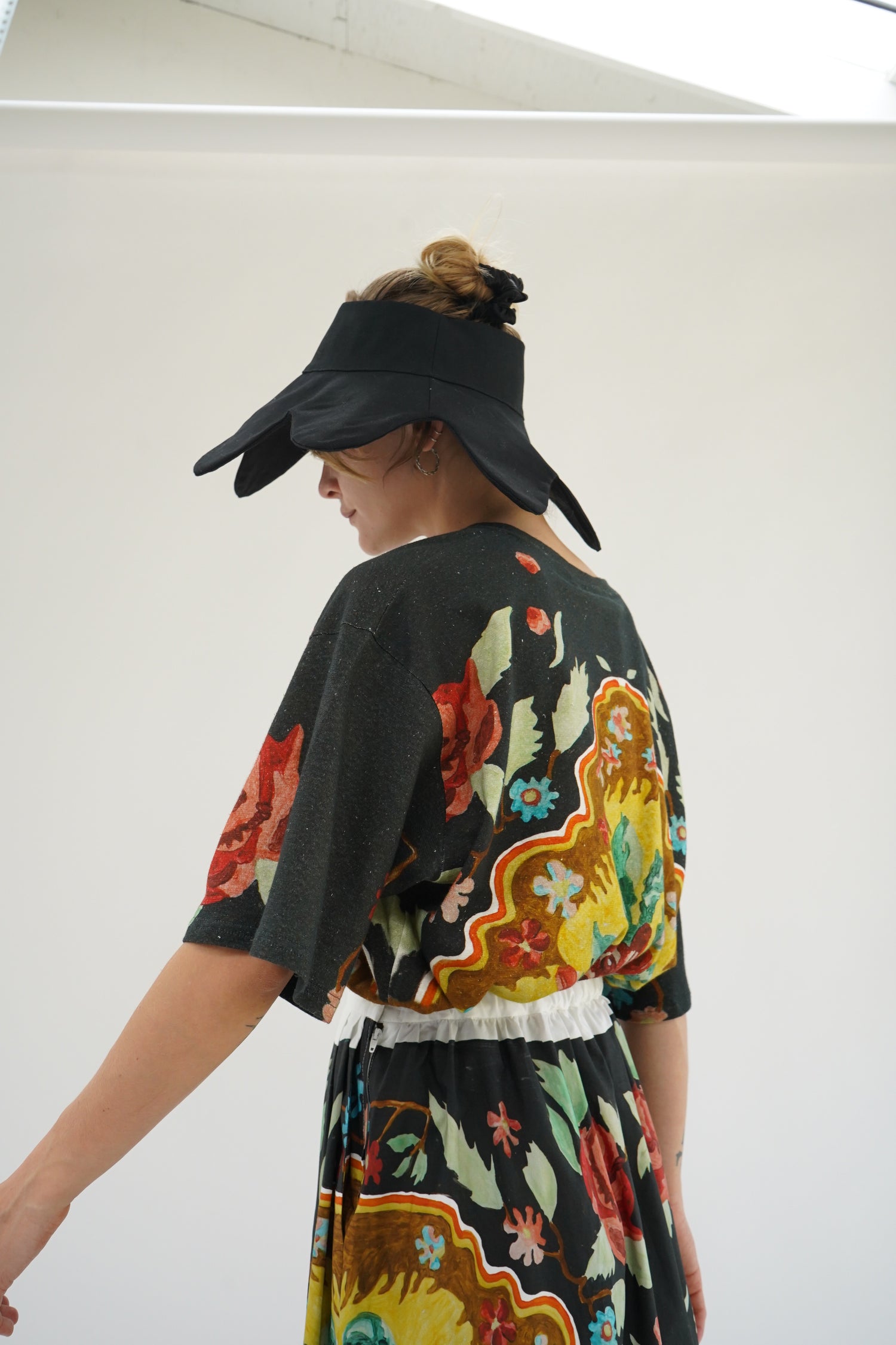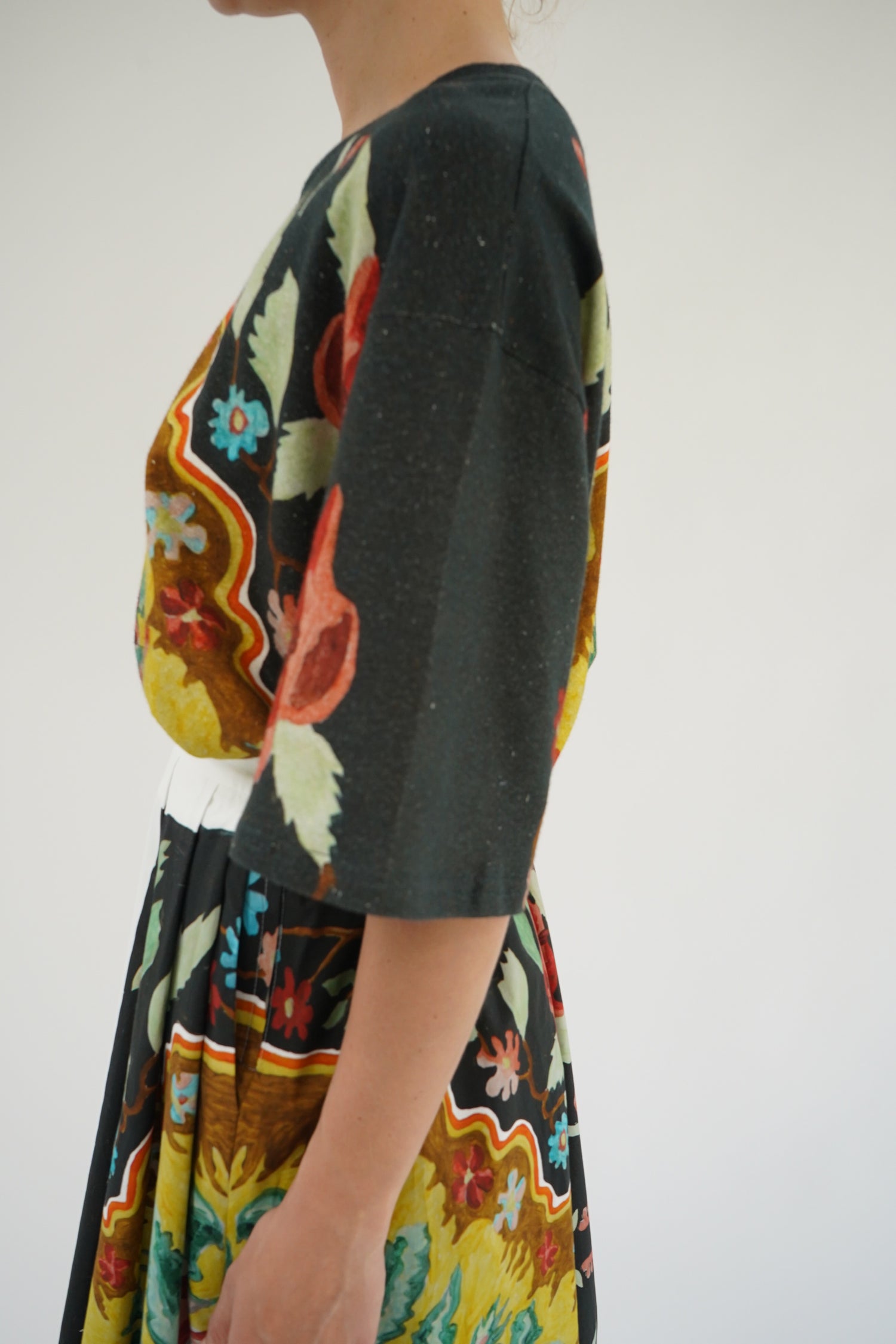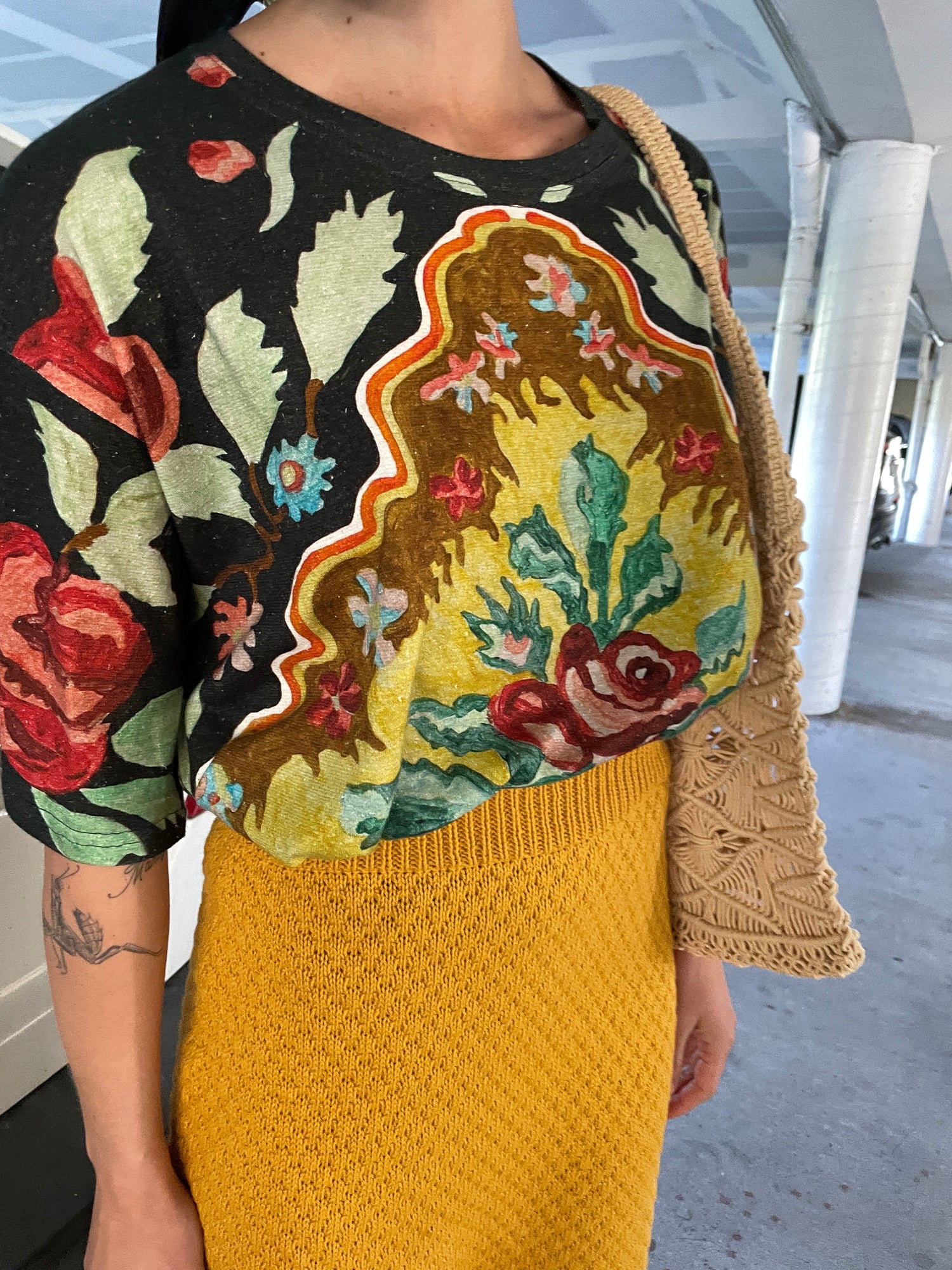 Painted flower print top, one size fits most. Loose fitting, wide short sleeve top, enclosed seams. 84% Organic Cotton, 16% Organic Hemp.