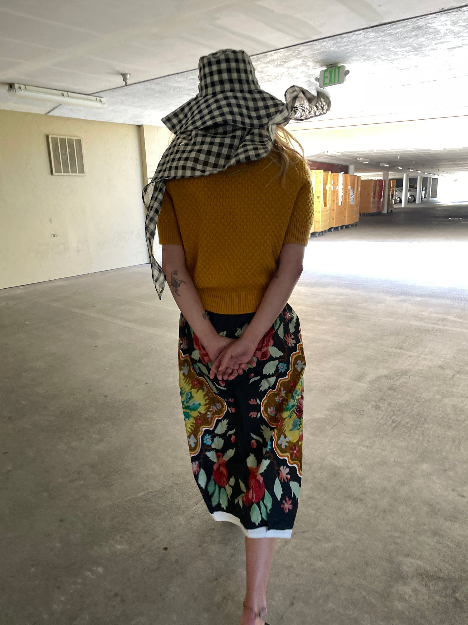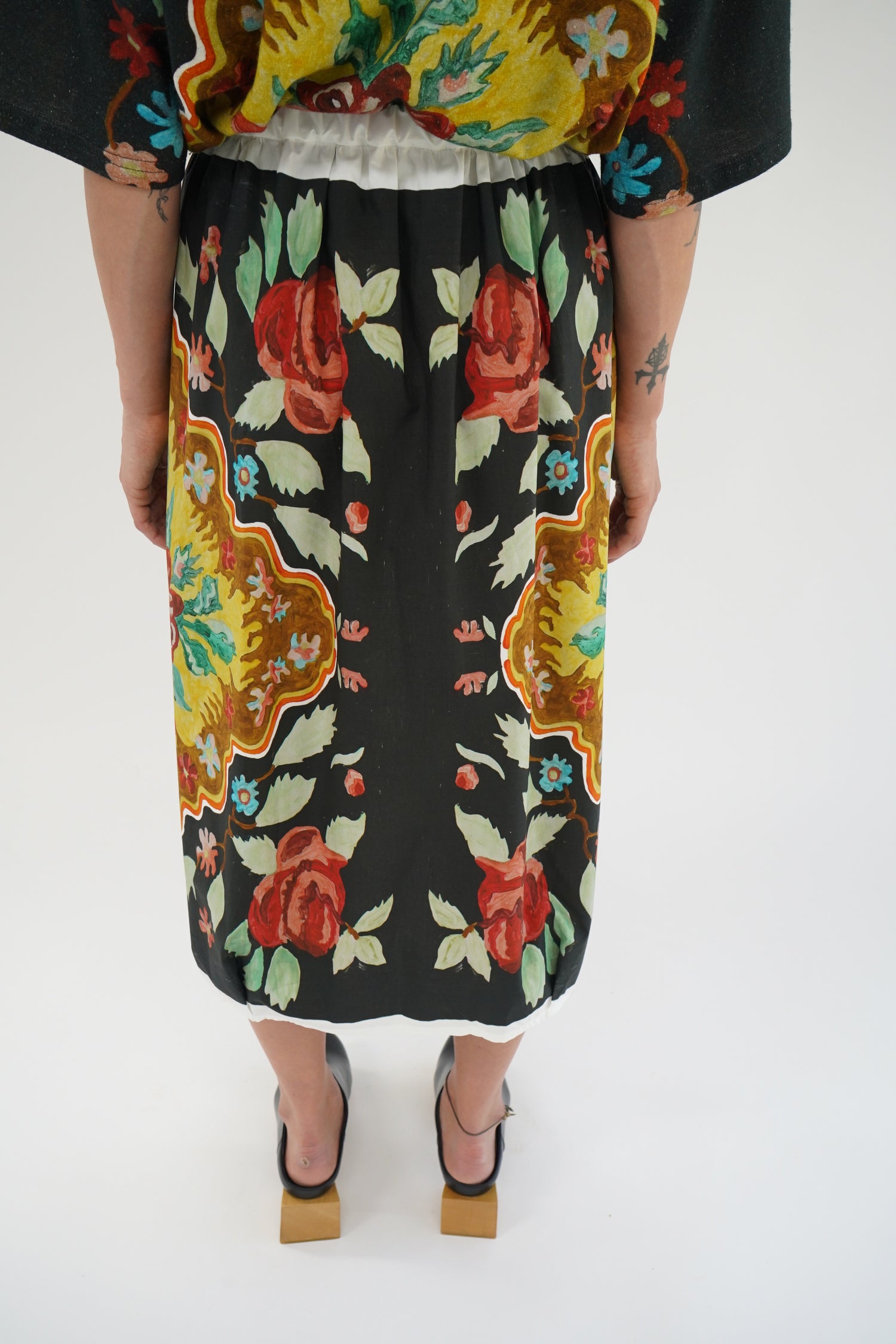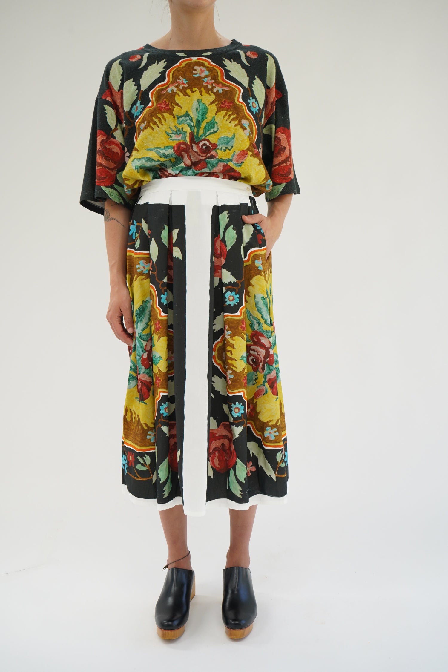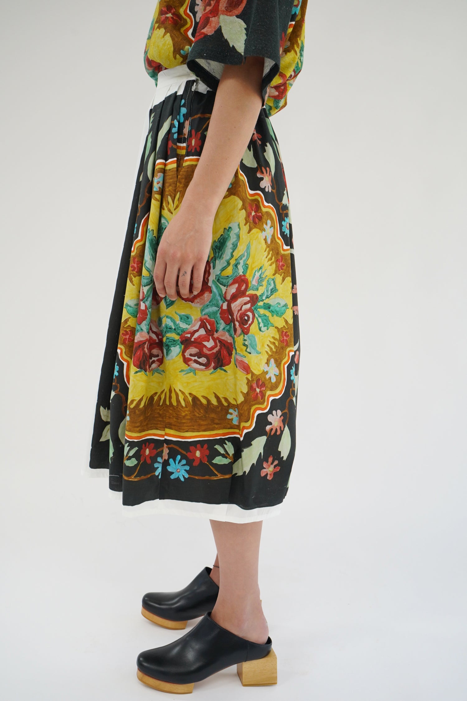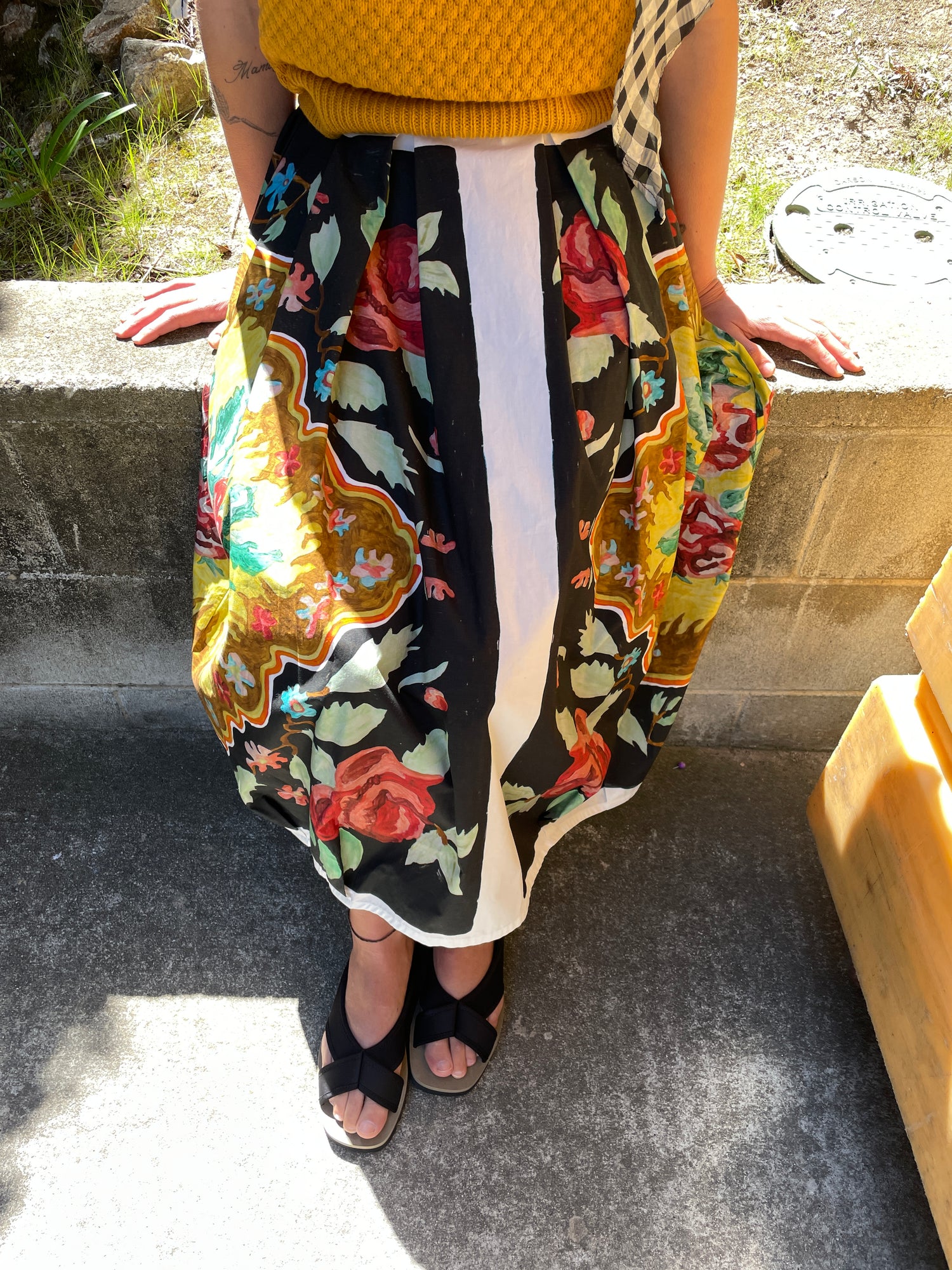 Gorgeous painted flower panel print skirt. Full A-line pleated skirt with side pockets. Zipper and button closure on left side, straight front waist with gentle elastic on back side of waist allowing for comfort and better fit. Enclosed seams. 100% Organic Cotton.