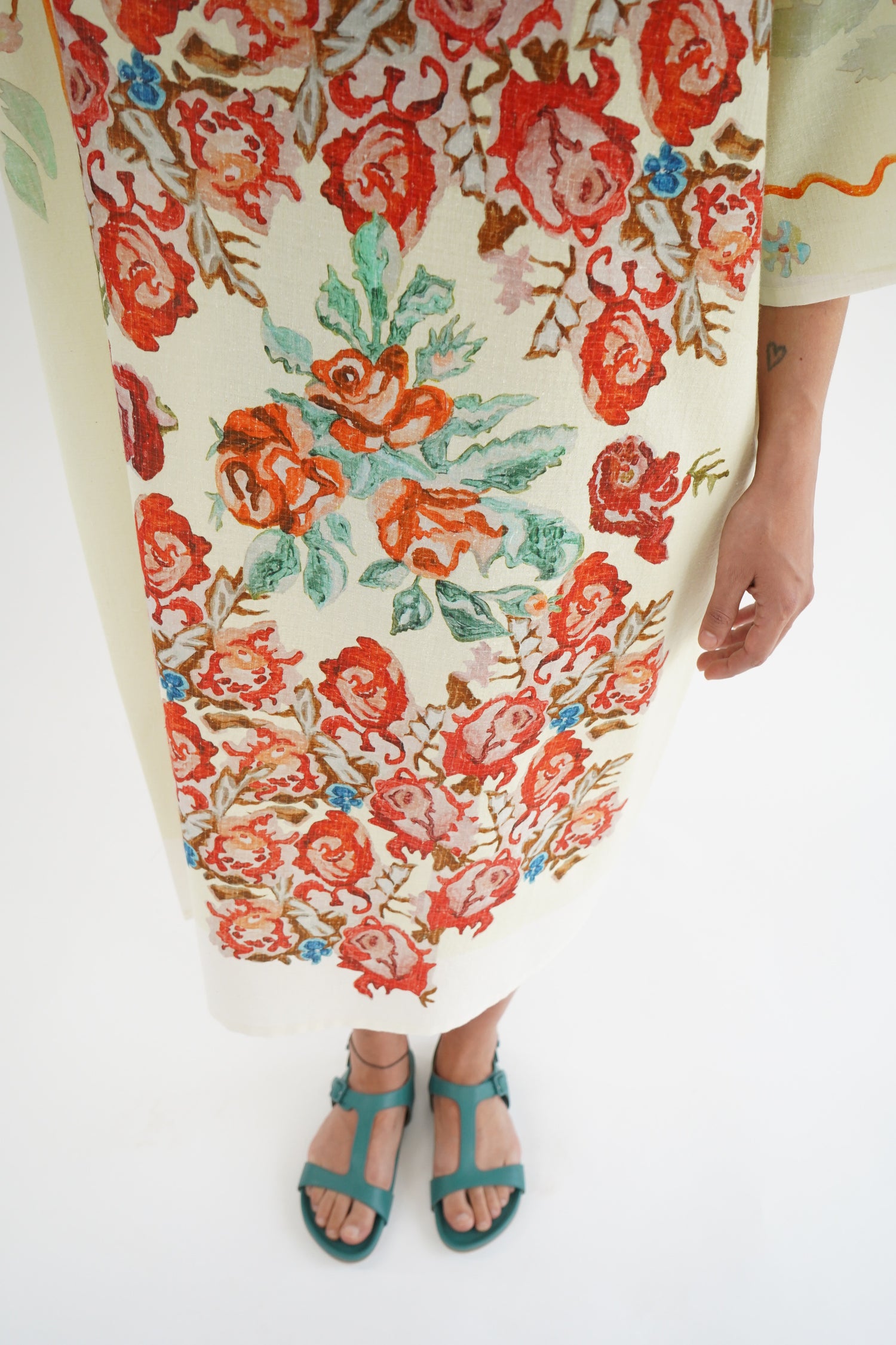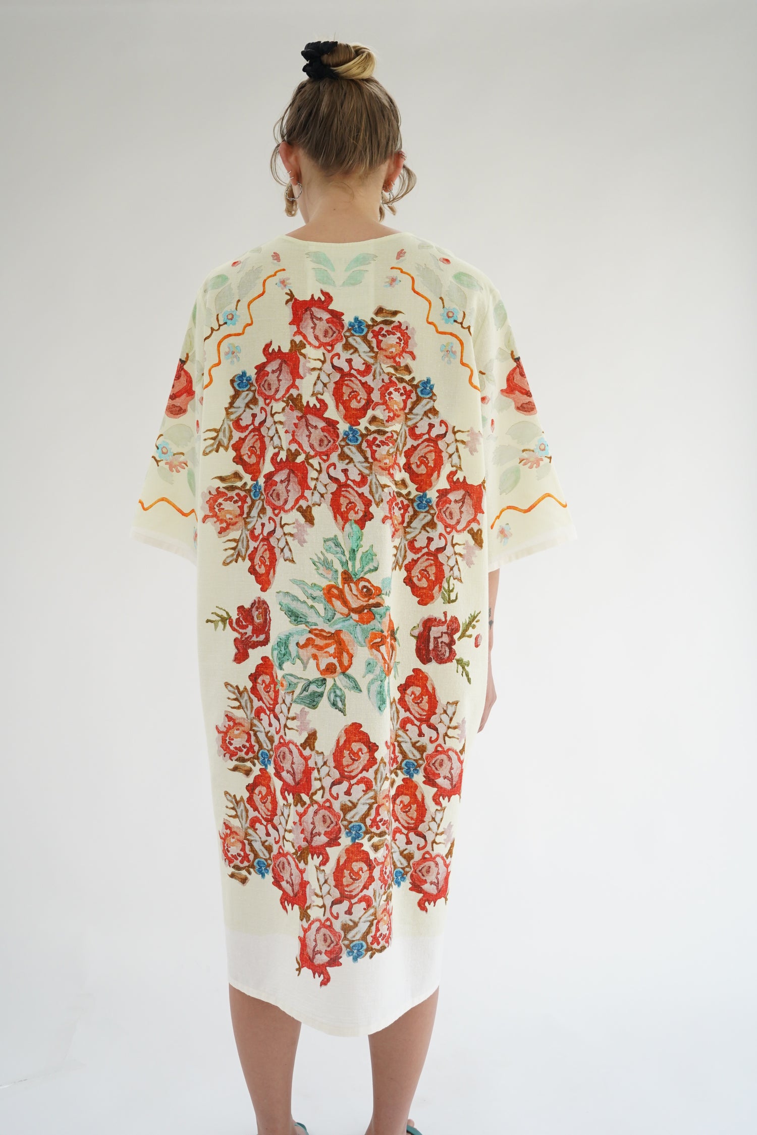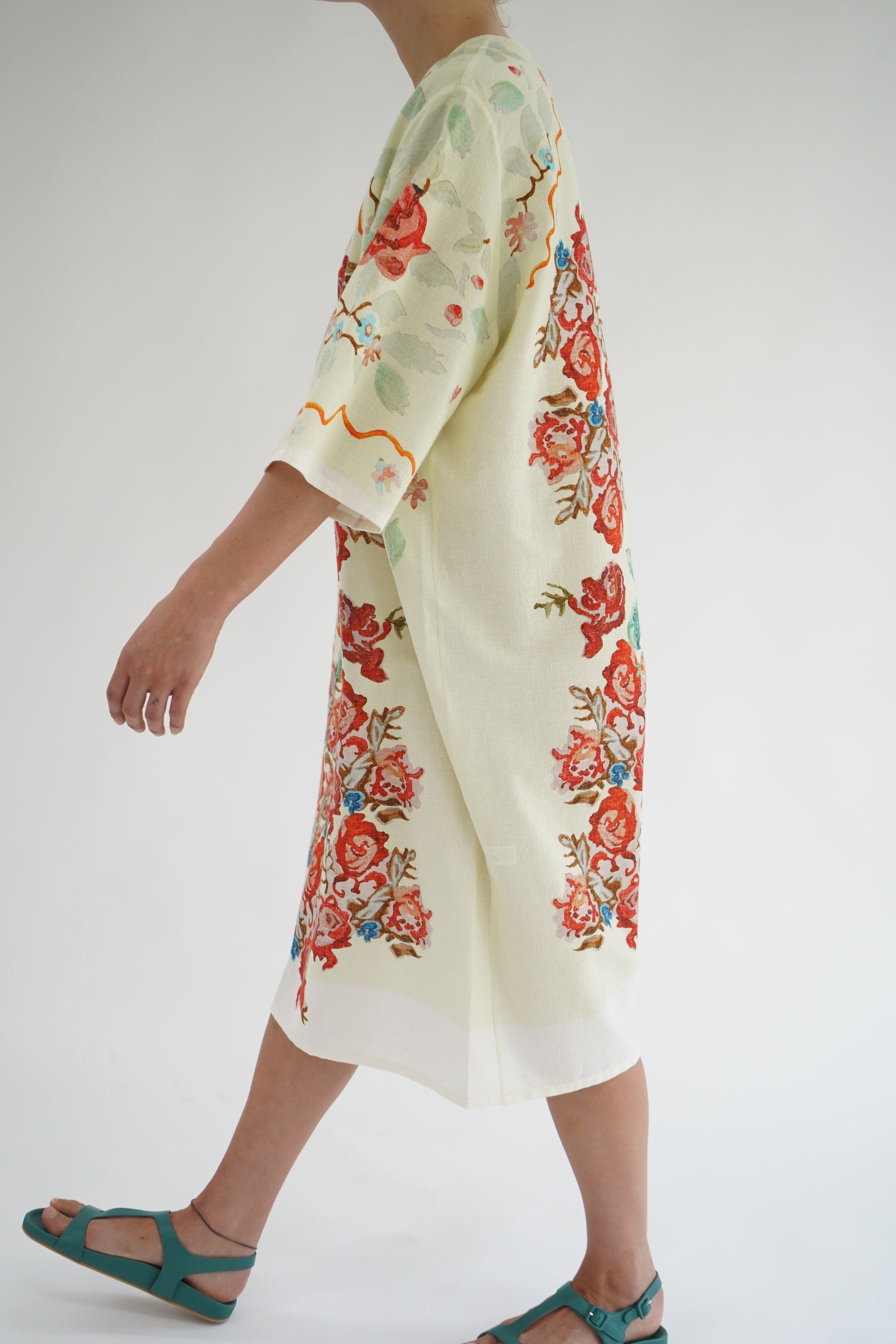 Beautiful pale green flower print dress, one size fits most. Loose fitting, enclosed seams. 80% Organic Cotton, 20% Silk.
