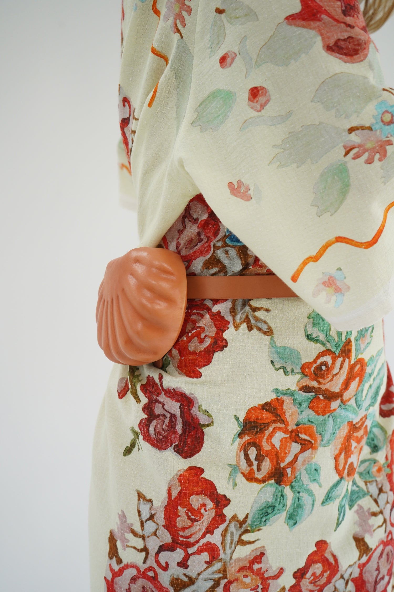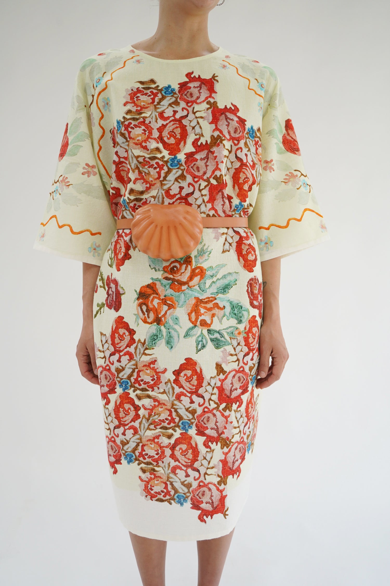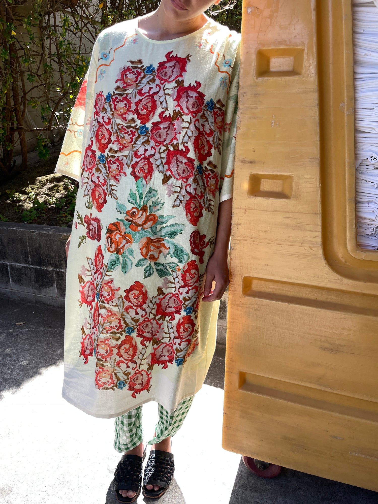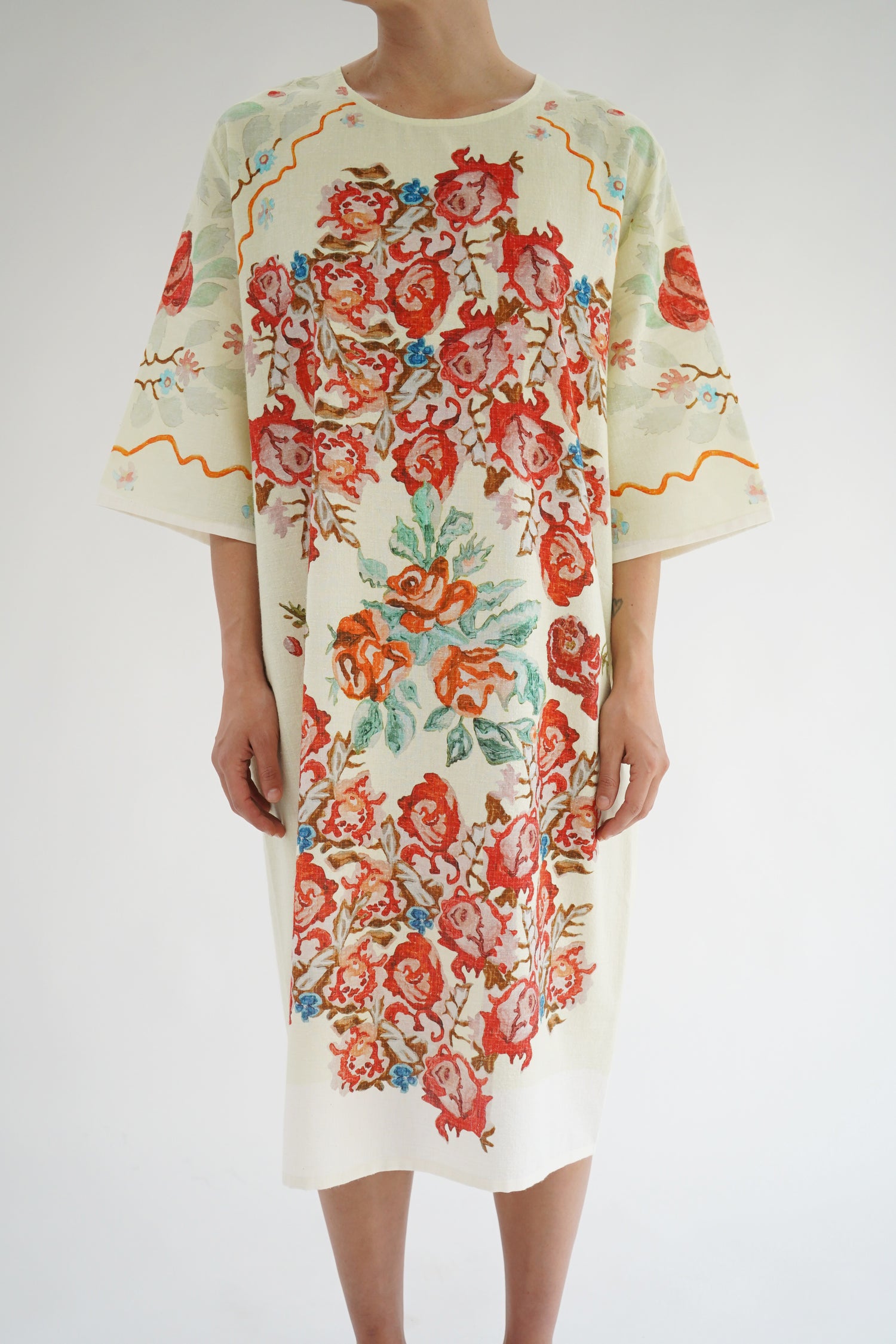 Beautiful pale green flower print dress, one size fits most. Loose fitting, enclosed seams. 80% Organic Cotton, 20% Silk.