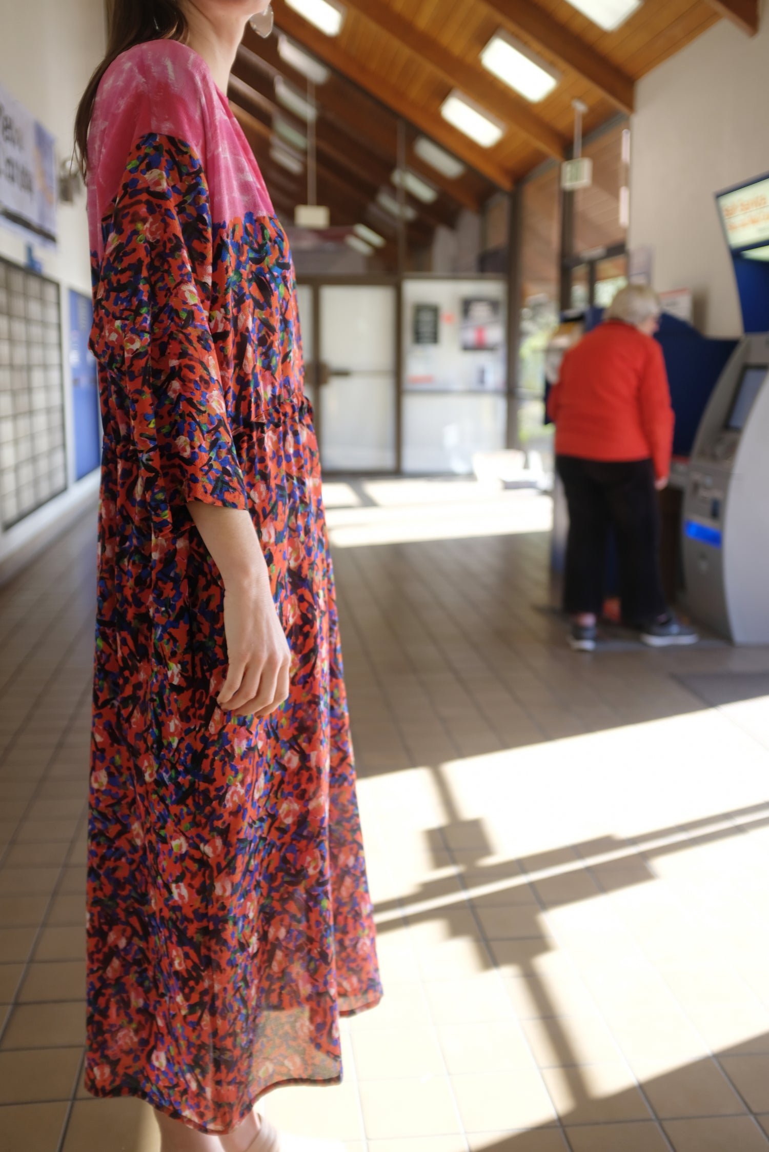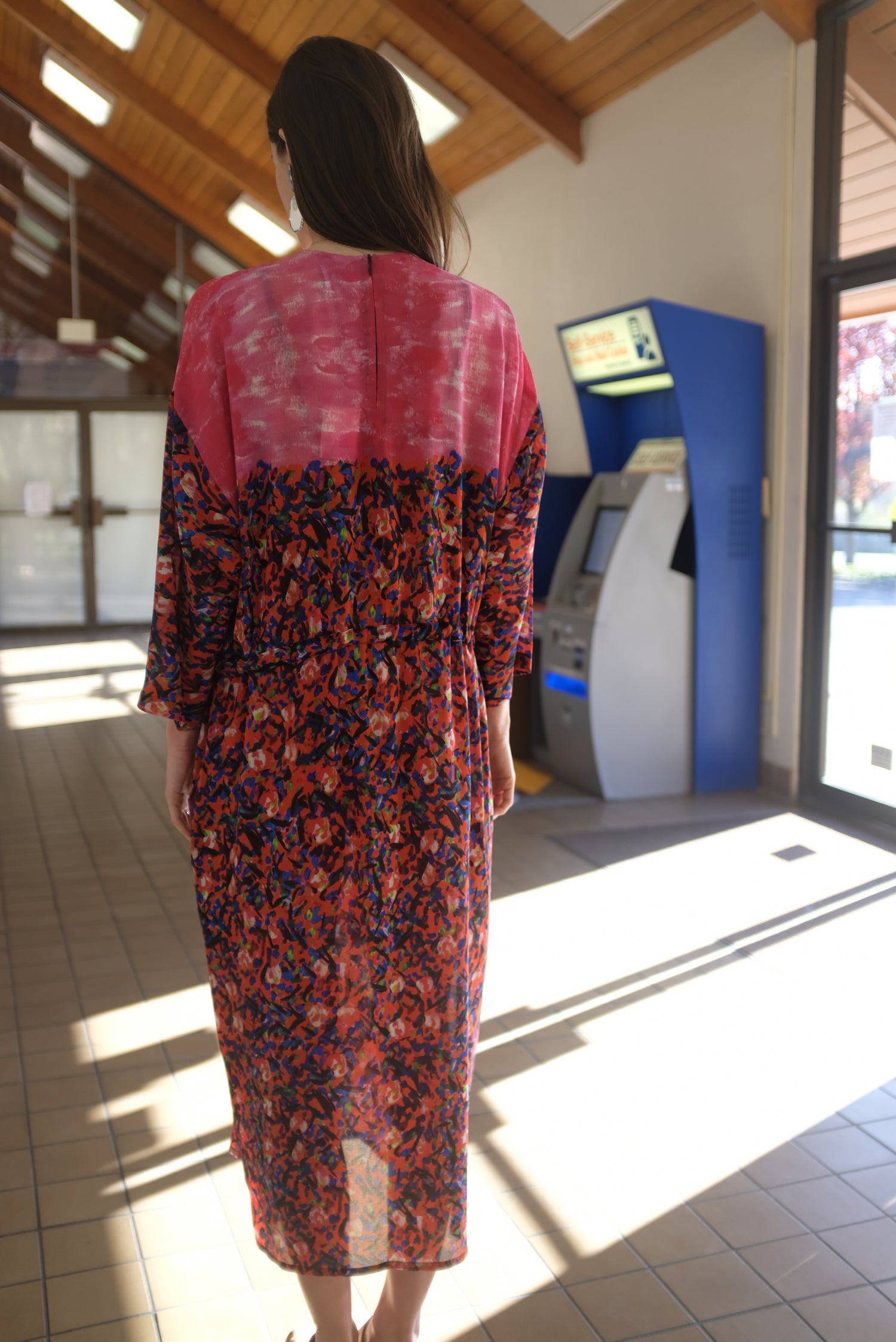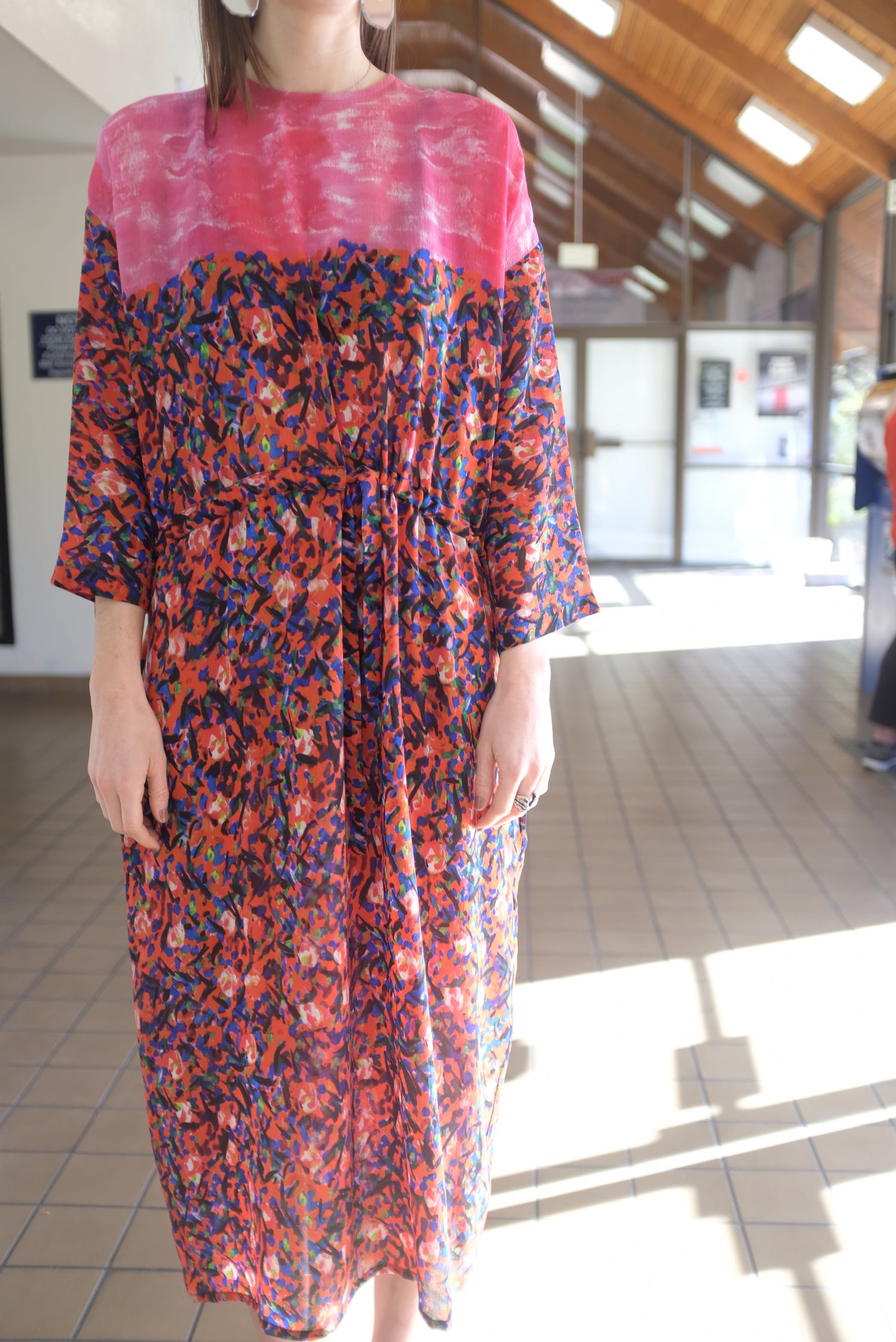 Textured silk dress, gorgeous colorful speckled pink and red print, one size fits most. Hidden pockets, adjustable drawstring waist, 3/4 sleeve, loose fitting, enclosed seams, hidden back zipper. 100% Silk. Can be worn loose or fitted.